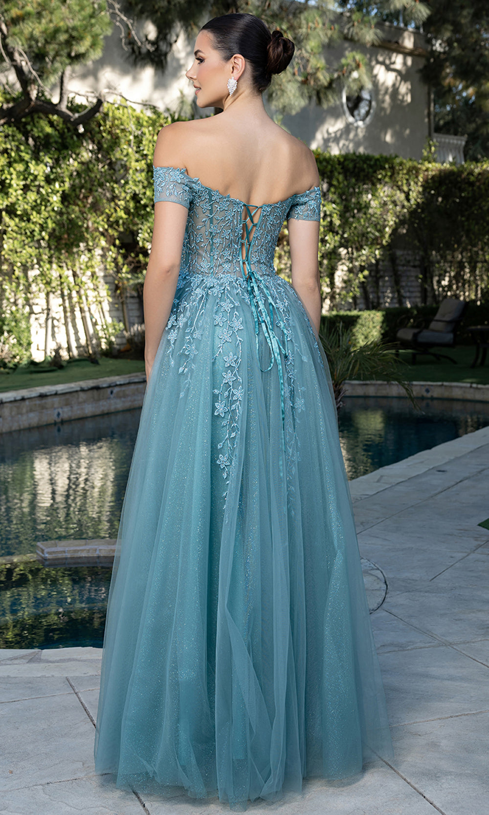 Let your style bloom at your next special event with May Queen MQ2200. The look begins with soft off shoulder cap sleeves and a sweetheart neckline, complemented by a sheer corset bodice adorned with embroidered florals and beaded touches. A lightweight A-line skirt flows beautifully with a high slit that adds graceful movement. The overall silhouette flatters from every angle, making it a dream-worthy pick. May Queen MQ2200 offers a romantic look with ethereal detailing perfect for any upscale celebration. Models are wearing Dustyblue, and Sage colors.