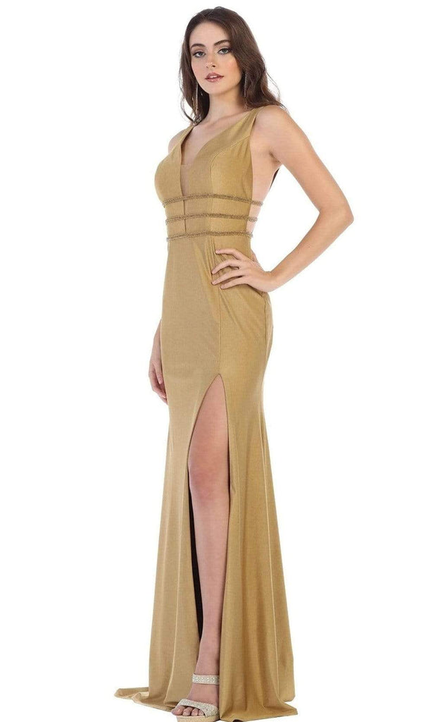 | Details: | Sleeveless, Illusion Inset, Deep Side Cutouts, Plunging V-Open Back, Beaded Tri Band, High Slit, Sweep Train |