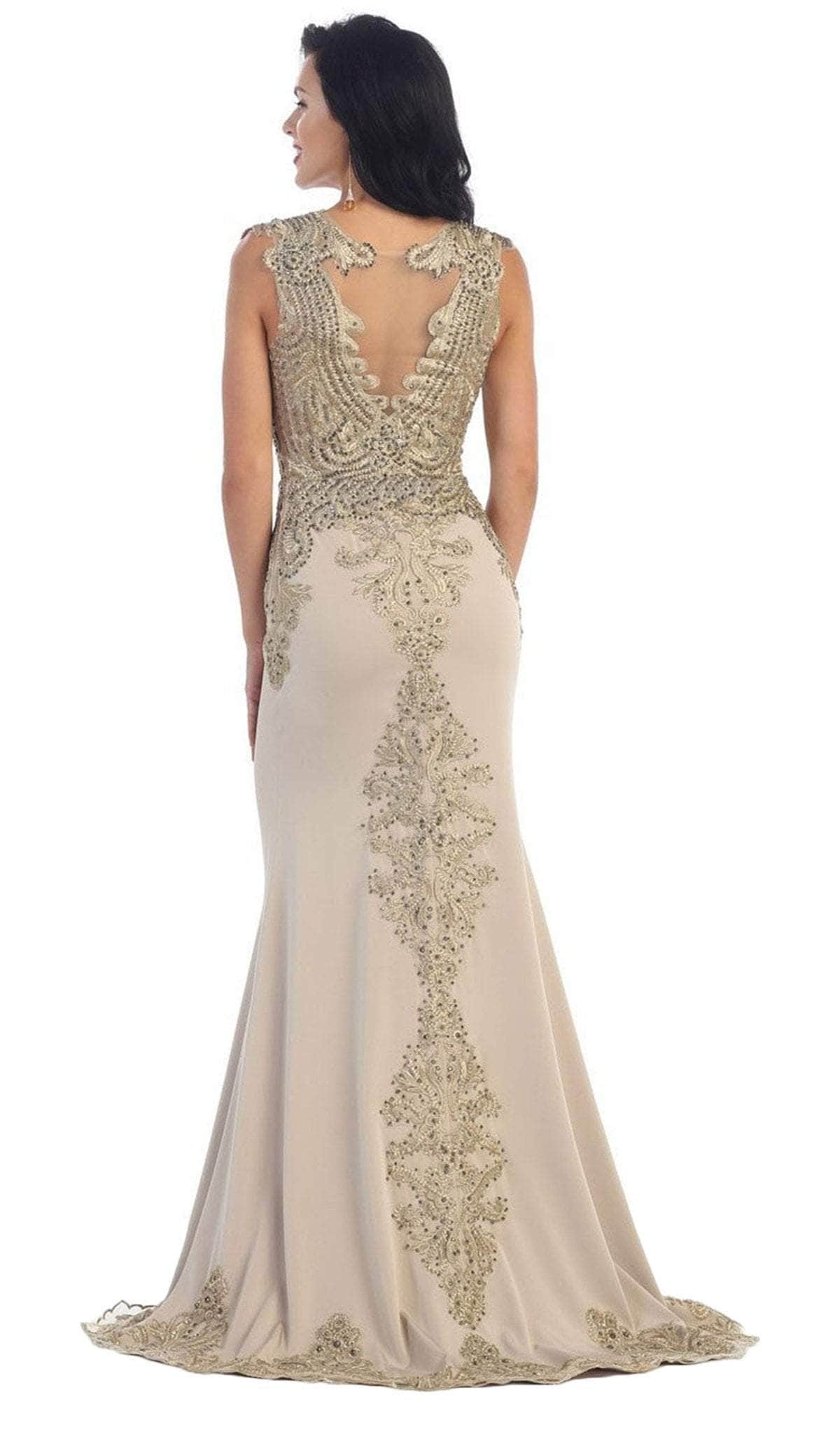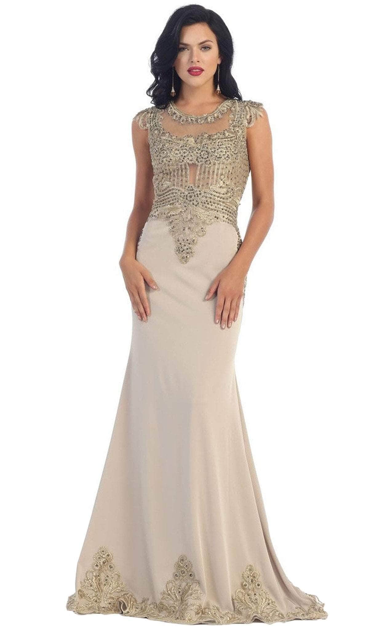 Turn heads instantly when you wear this May Queen RQ7436 masterpiece. With gold embellishments aesthetically arranged on the fitted bodice, this gown is a must-have for any elegant affair. It comes with an illusion jewel neckline, cap sleeves, and a partial illusion full back. The sheath skirt accentuates your natural beauty with a sweeping train that adds a touch of drama. Exhibit your softer side in this delightful evening gown by May Queen RQ7436. Models are wearing the Champagne, and Navy colors.