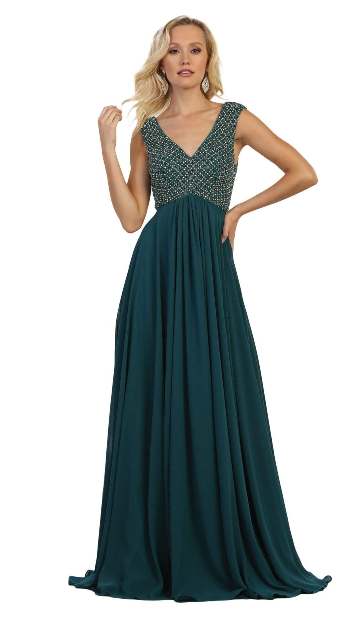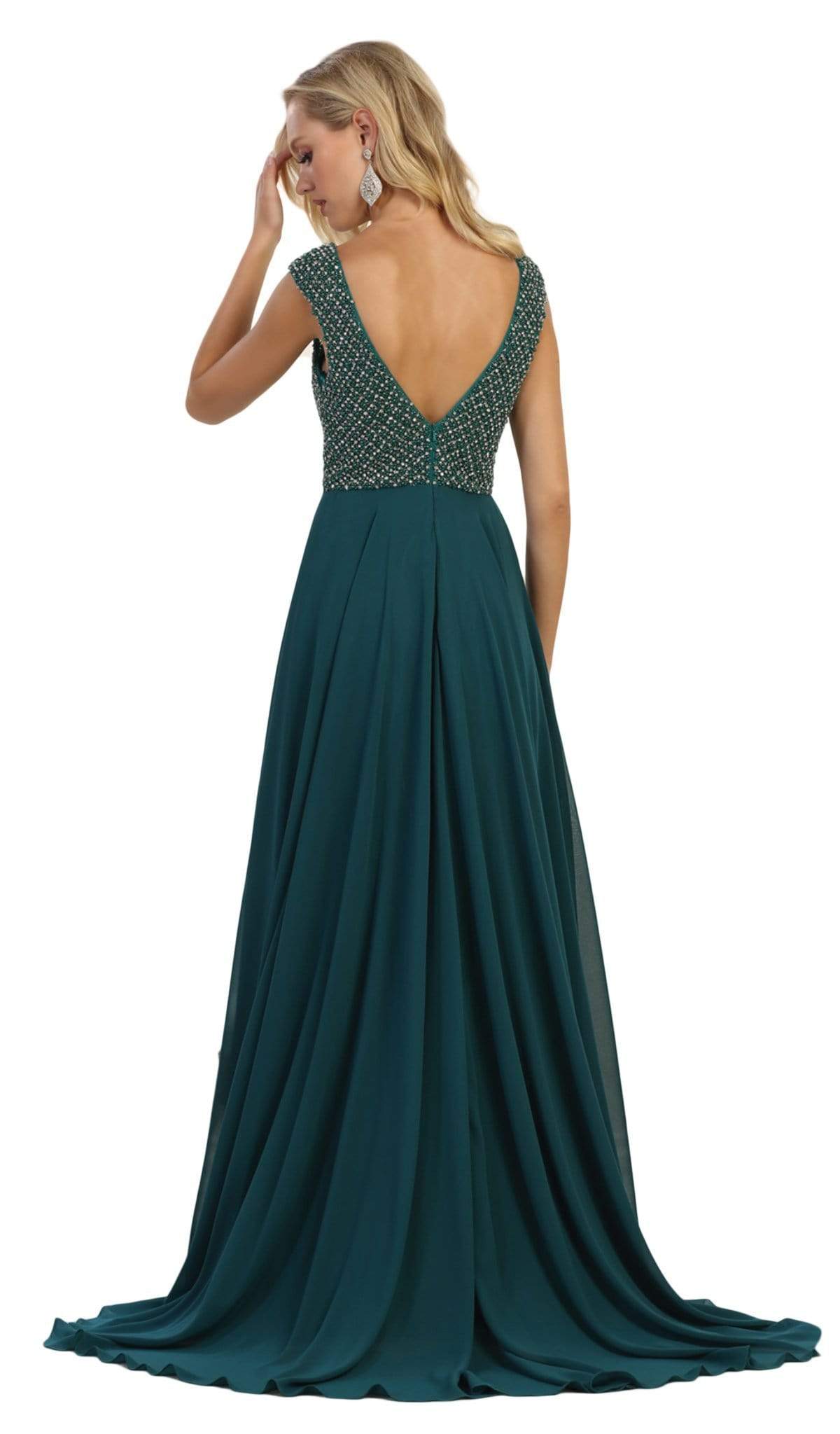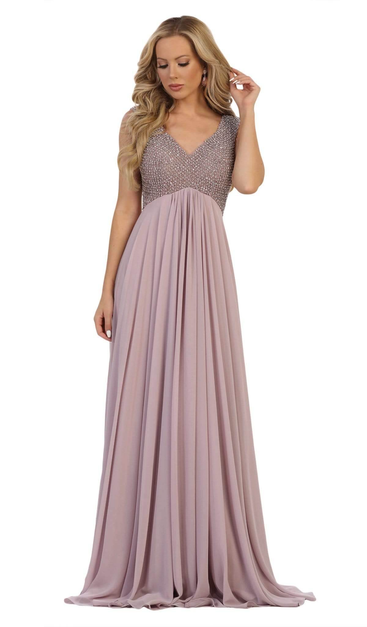 Get glamorous look with this dress by May Queen RQ7512. This sophisticated dress features a sleeveless, V-neckline with bodice ornate with embellishments. The back has a V-cut and a zipper closure. The skirt opens in a flowy A-line silhouette and finishes in a sweep train. Promote attention-grabbing style in this stunning May Queen design.