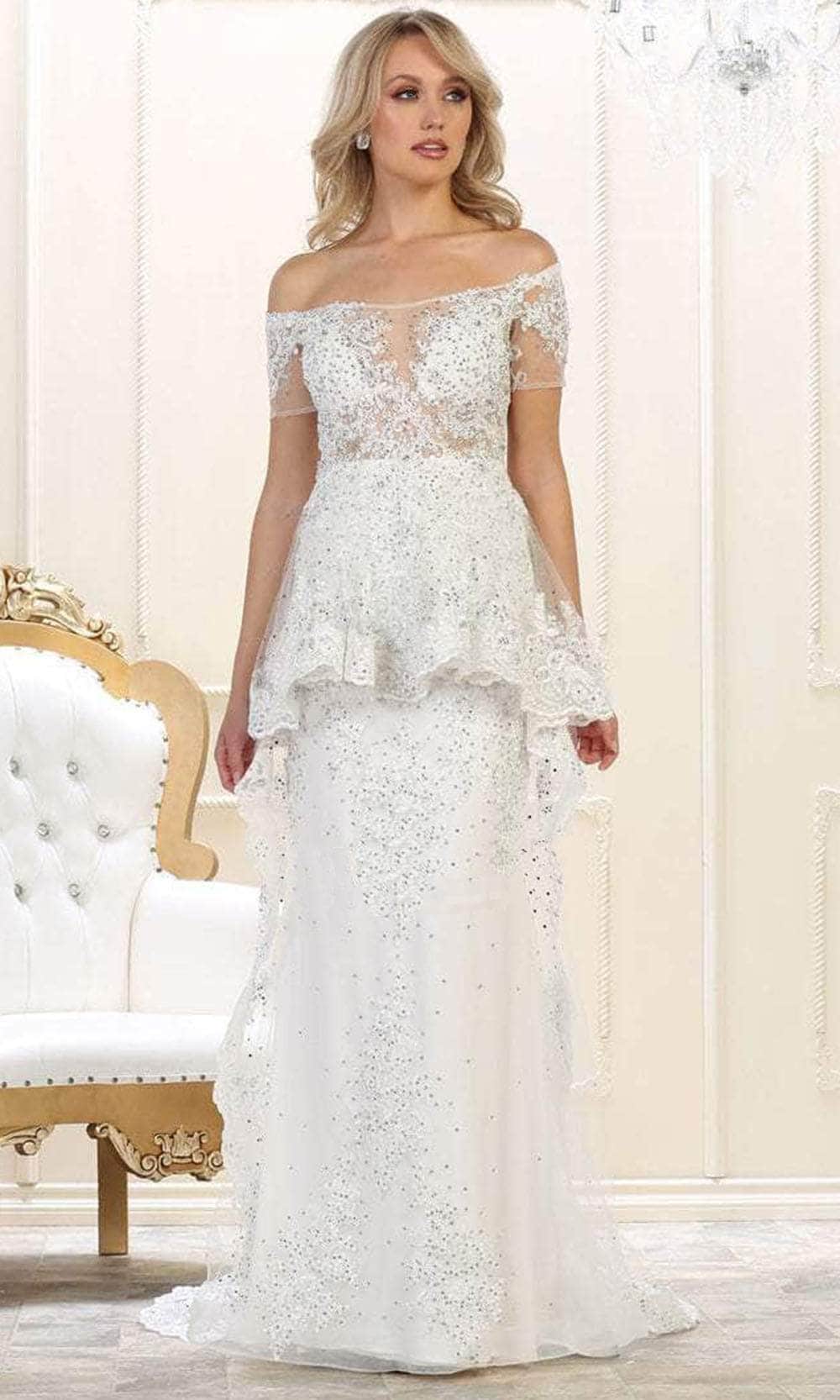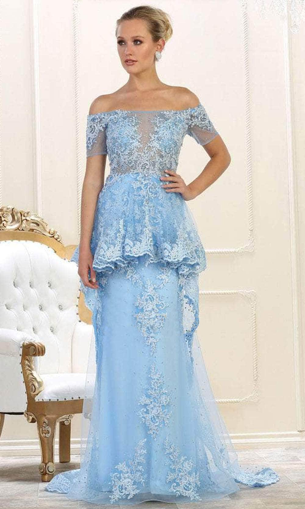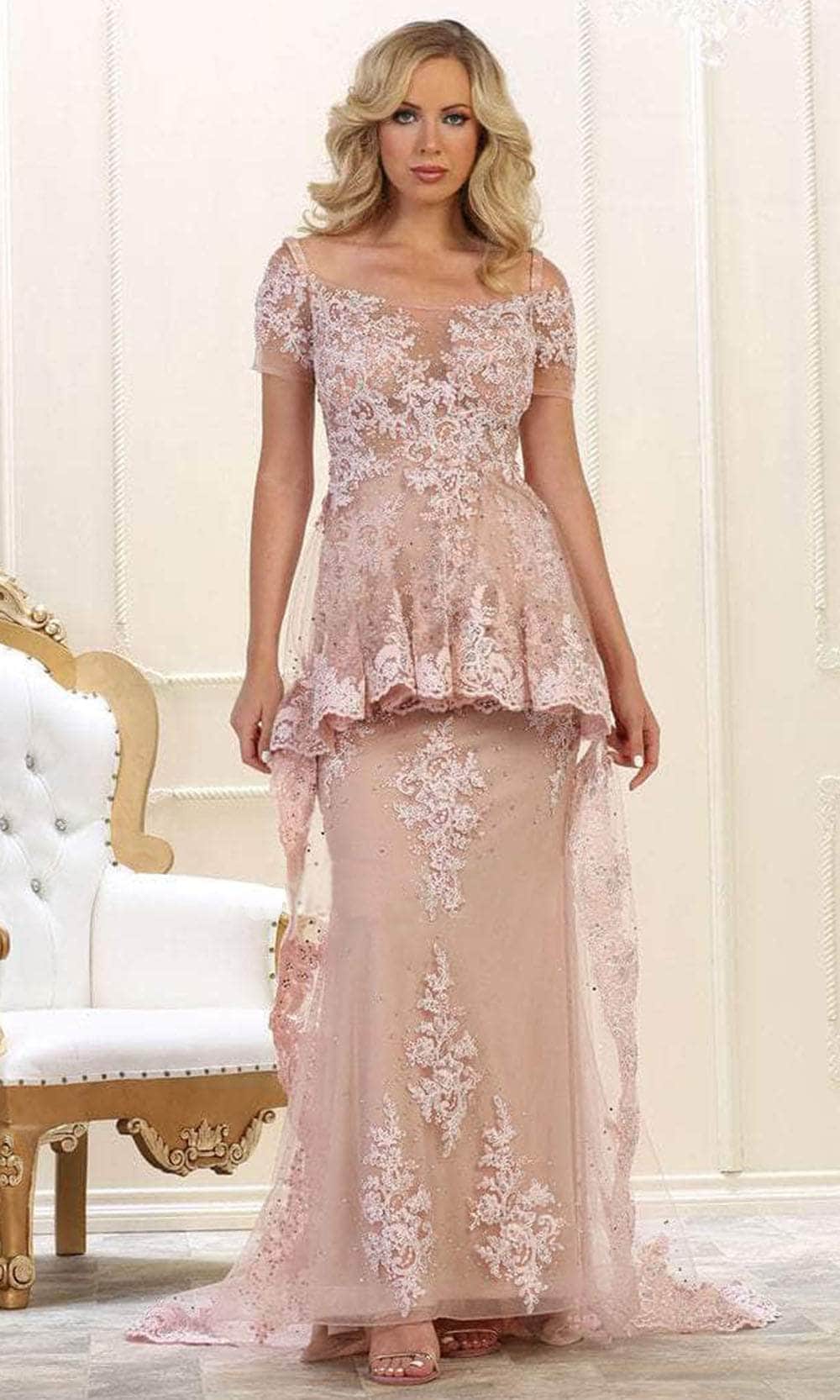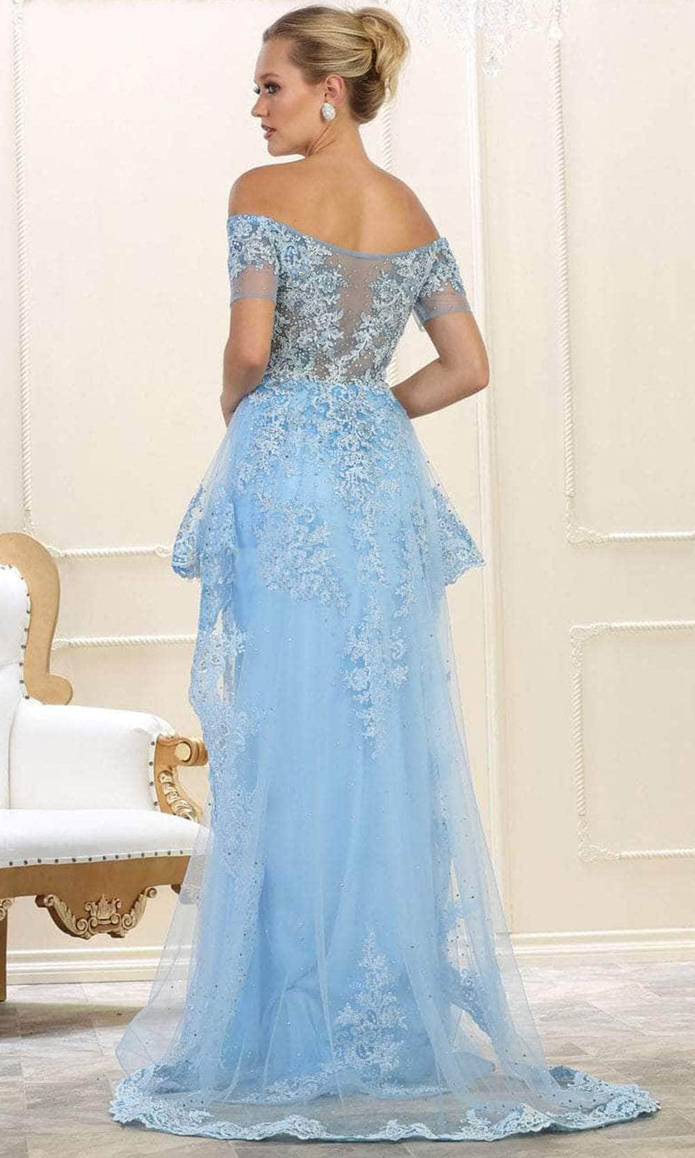 Make it your moment to stand out wearing this May Queen RQ7620 masterpiece. Intricately adorned with lace embroidery and beaded accent from the top down to the hem, this breath-taking gown exhibits a sheer bodice with an off-shoulder straight-across neckline and short sleeves complemented by a mid-open back. A stunning ruffled peplum cascade at the back is sure to impress the crowd. The skirt beautifully flares a full-length A-line silhouette and ends in a sweeping train. The night is yours in a spectacular evening gown from May Queen. Models are wearing the Dusty Rose, Ivory, Perrywinkle and White colors.