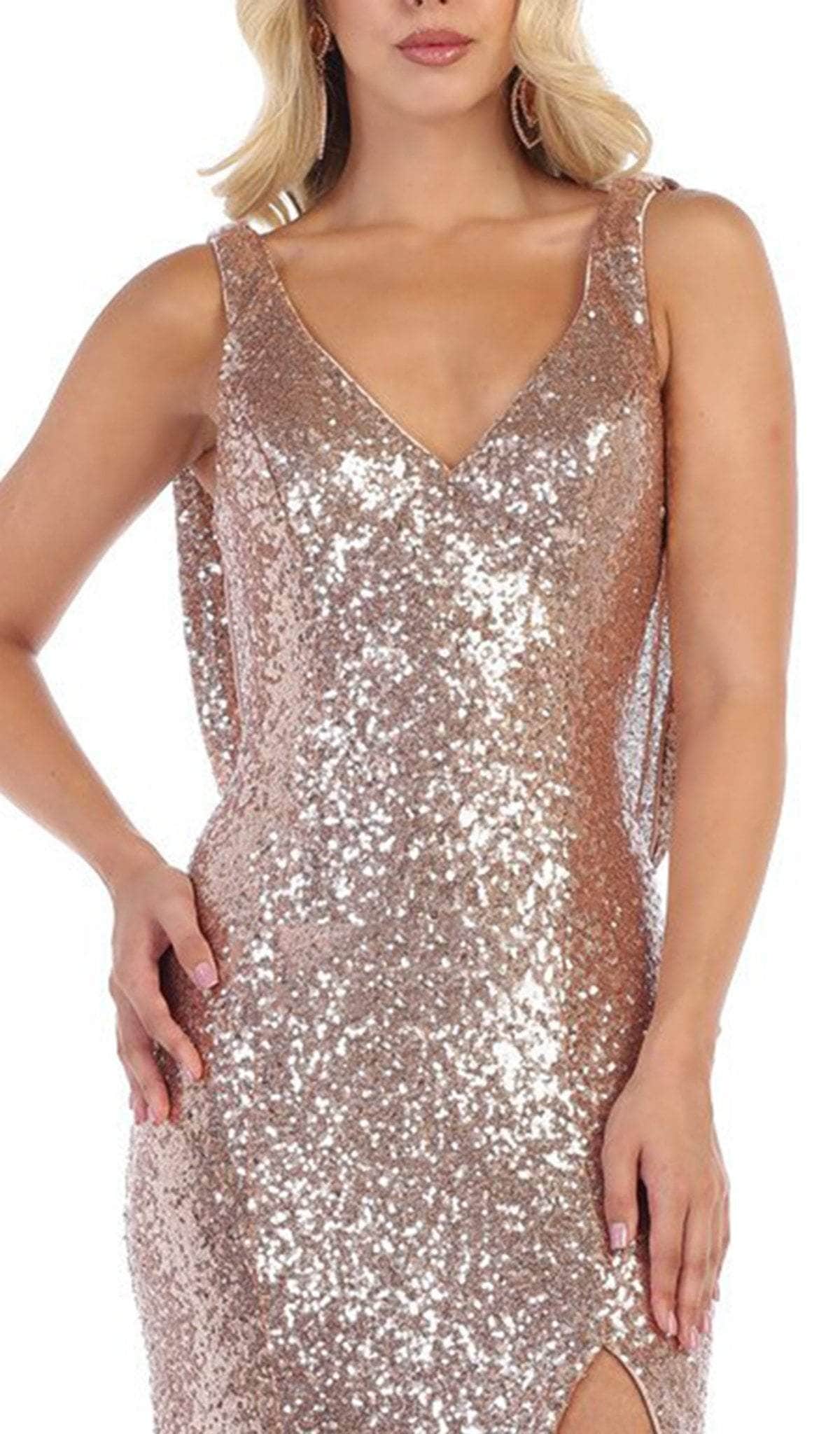 Shine with immaculate elegance in this evening gown by May Queen RQ7676. Fully garnished with shimmering sequins, this piece is truly a show-stopper. This design has a v-neckline on a sleeveless bodice, while the breathtaking open back reveals a strappy design and a detachable draped cowl. The sheath skirt exposes your flirty leg before it streams down to the floor and slight sweep train. This May Queen RQ7676 style will not let anyone miss your grand entrance. Model is wearing the Blush color.
