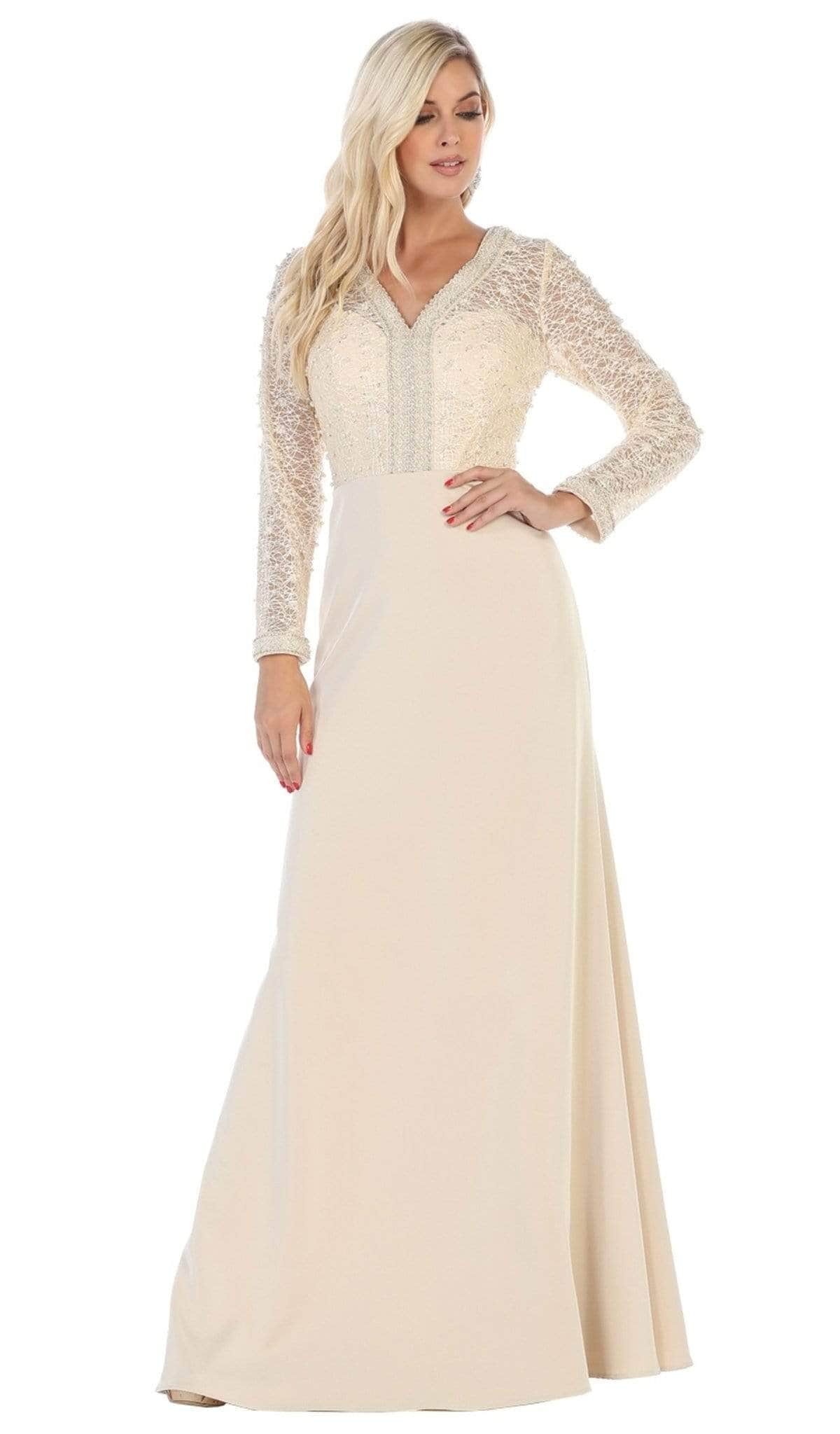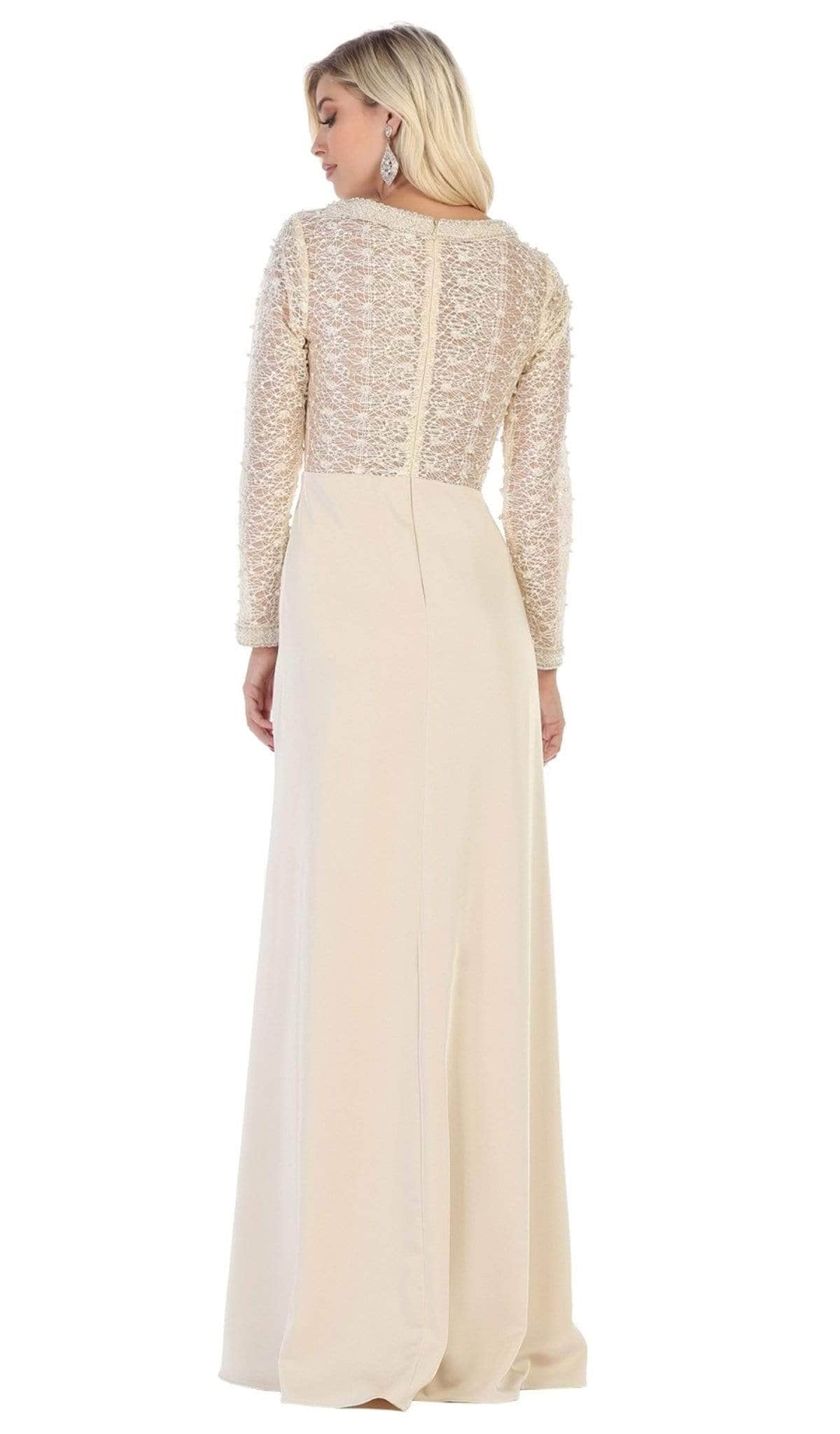 Display your feminine side with this gorgeous May Queen RQ7692 creation. Fascinatingly adorned with lace appliques and beadwork on the top bodice, this ensemble is an epitome of grace and sophistication at any event. The modest v-neckline is paired with long sleeves and full back design. To complete the look, the column skirt smoothly glides to the full length hemline. This May Queen RQ7692 dress is specially designed to make that special occasion worth reminiscing. Models are wearing the Burgundy, Champagne, and Navy colors.