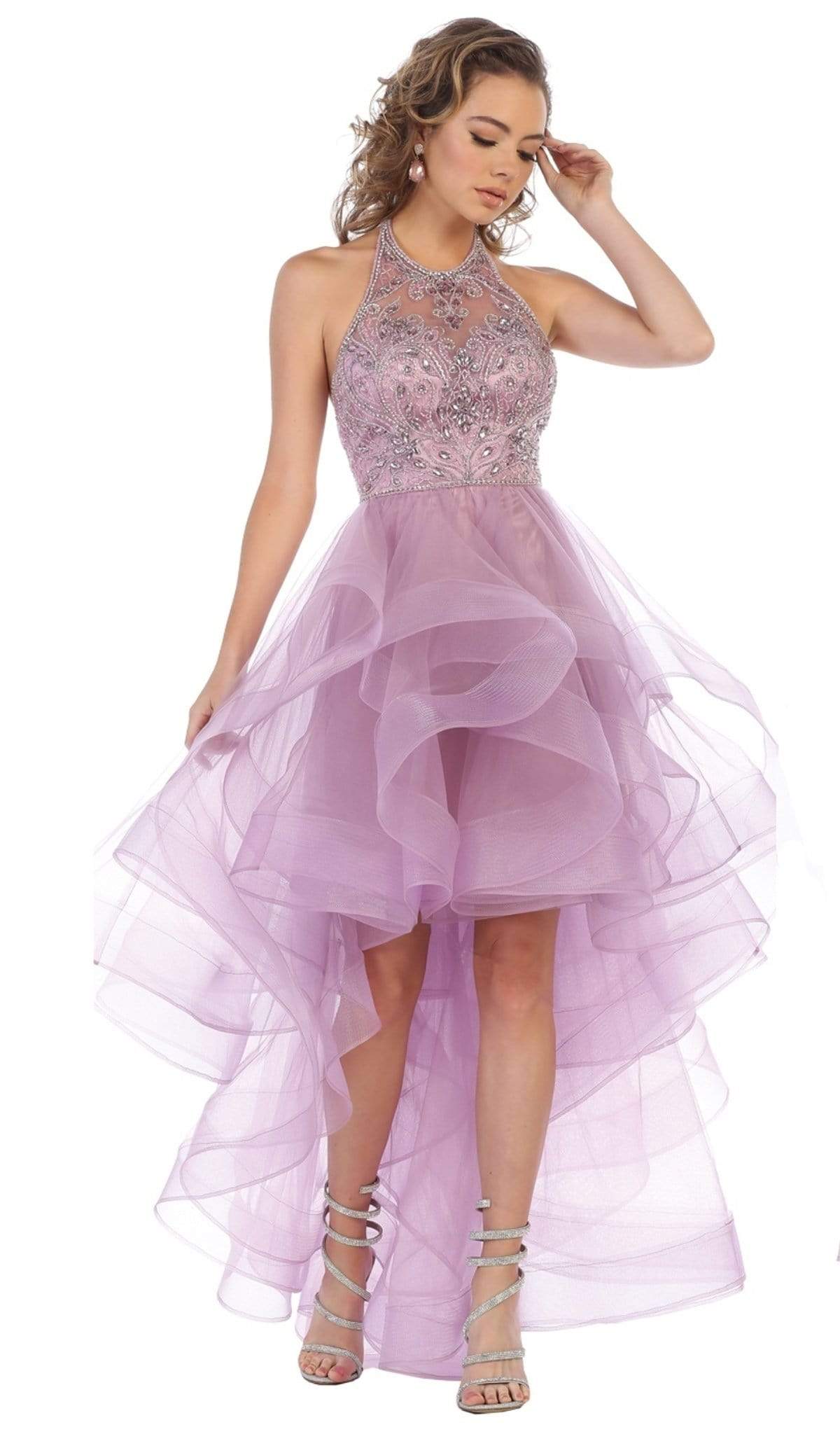 Make a lasting impression while looking to utterly feminine in this May Queen RQ7717 creation. Beautifully studded with an intricate spectacle of glimmering crystals on a cut-in bodice, this dainty stunner shows an illusion halter over a sweetheart neckline. Framed with an adorned v-notched back, the A-line skirt is astoundingly rendered in gossamer layers that complete in a sexy high low hemline. Lavish yourself with grace and opulence in this May Queen masterpiece. Models are wearing the Black and Mauve colors.