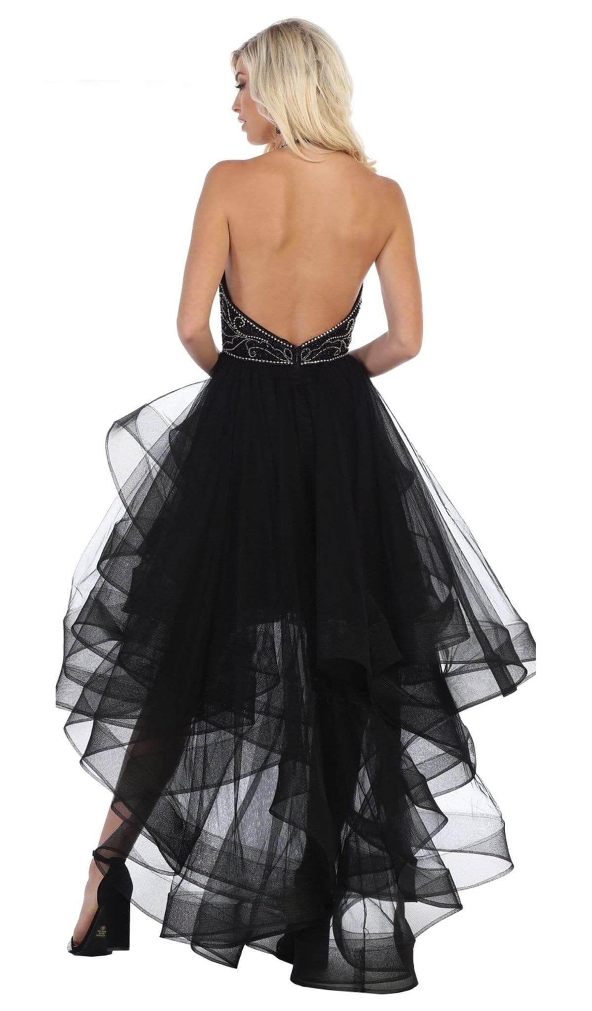 | Details: | Sleeveless, Jeweled Bodice, Deep V-Notched Back, Back Zipper Closure, Layered Skirt, High Low Hem |