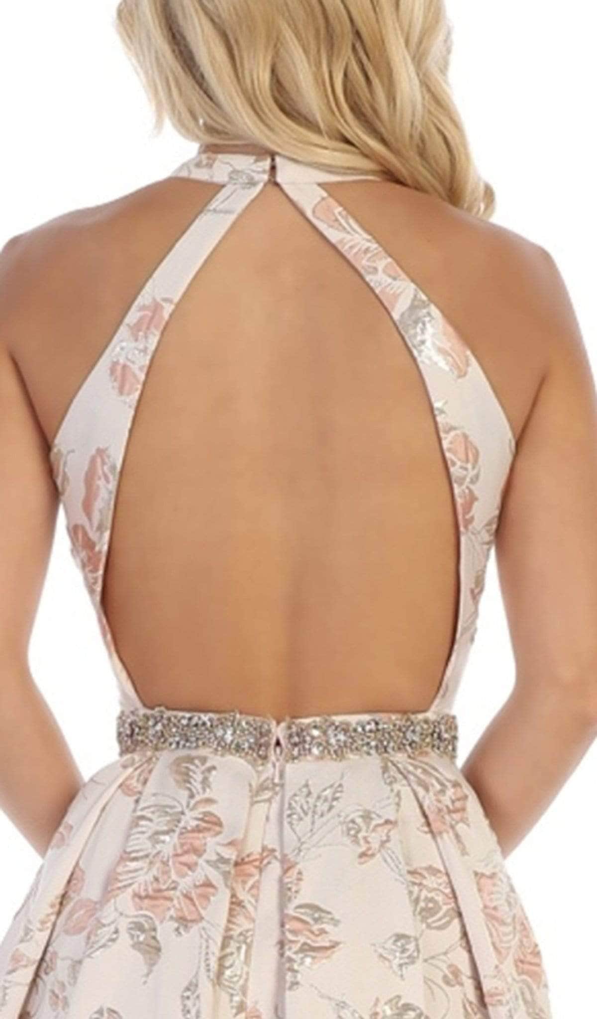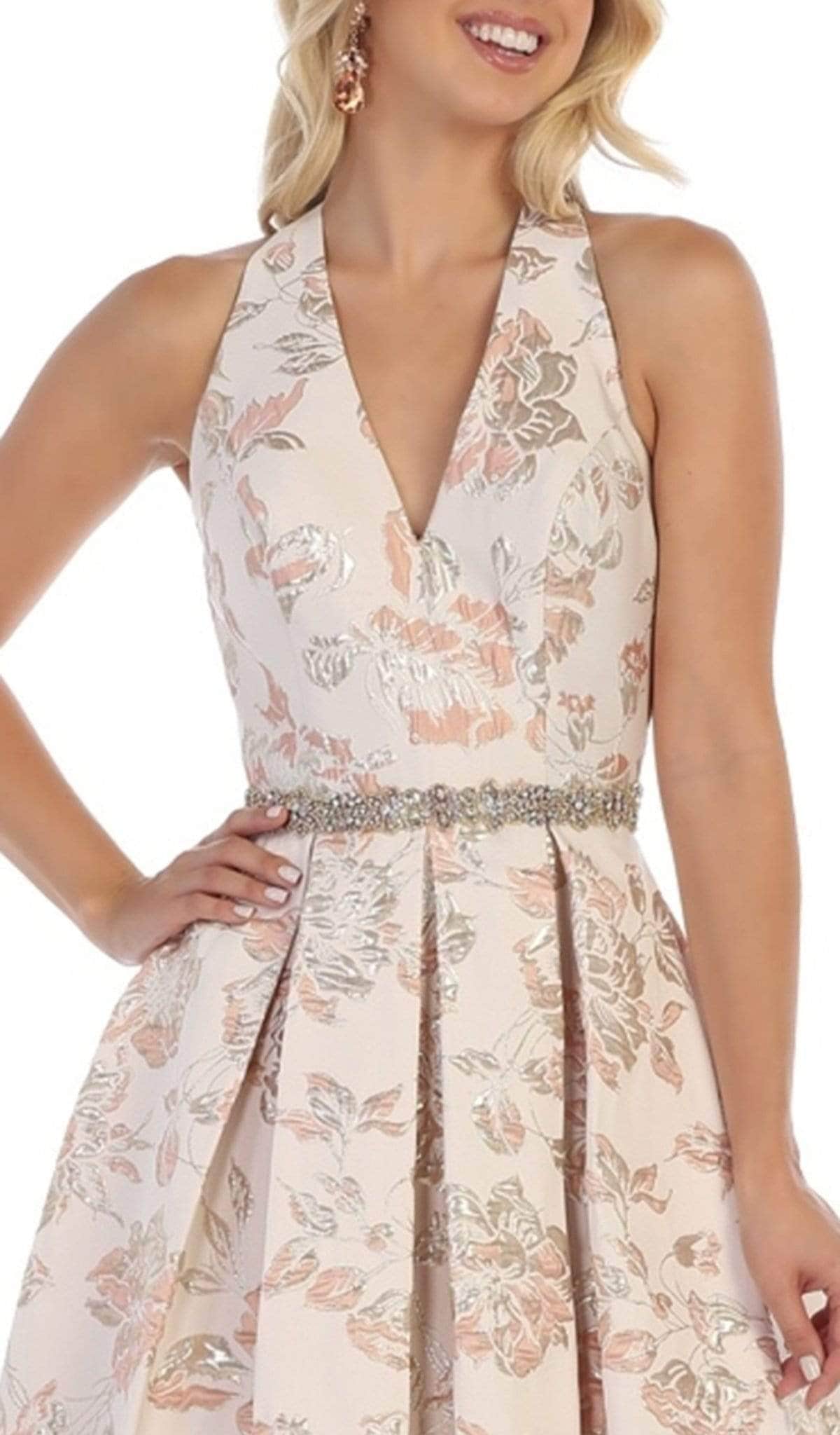 Heighten your charming appeal in this May Queen RQ7773 creation. Expertly crafted to bring out your innate beauty, this sleeveless dress has lovely floral details throughout its length. The top bodice reveals a halter plunging v-neckline, and a daring large cutout design at the back. A beaded belt cinches the waist, while the pleated skirt gracefully flows to the floor in a striking A-line silhouette. Models are wearing the Dusty-Rose, and Perrywinkle colors. You'll look fantastic in photos with a beautiful dress from May Queen RQ7773.