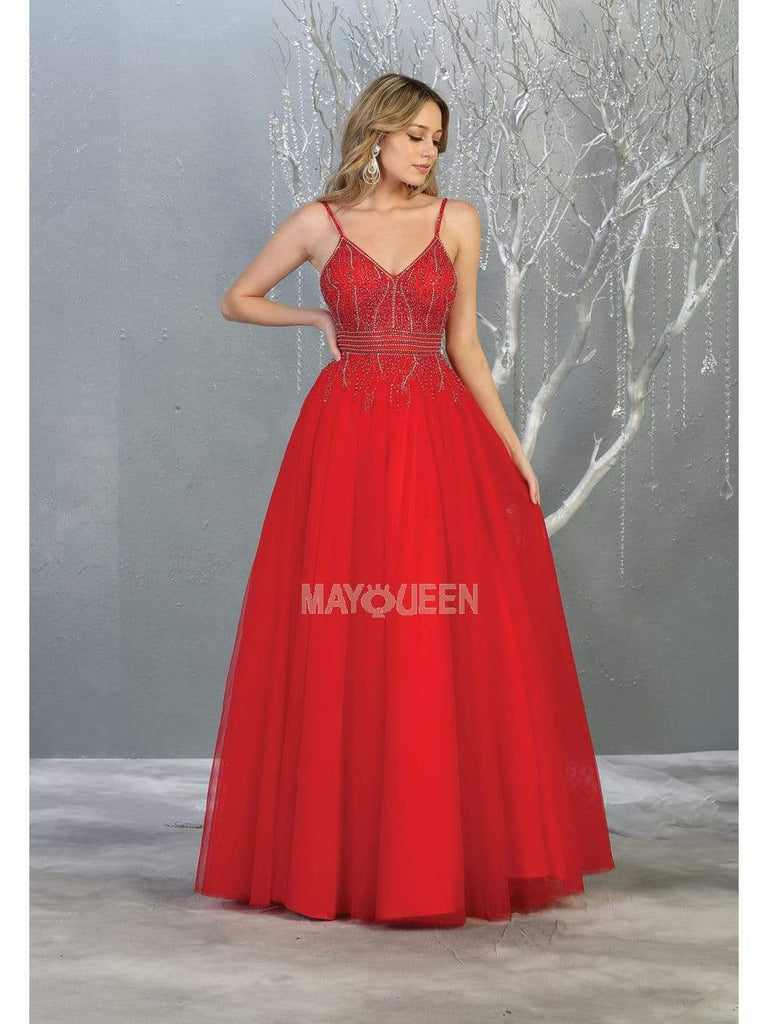 Display your natural beauty in this sophisticated piece by May Queen RQ7841. Bead embellishments design the bodice, framed with a V neckline. Beaded spaghetti straps lend support to the top as it leads to the open V back secured with a center zipper closure. The skirt parades an a-line silhouette which cascades to a full length hemline. Be in this gorgeous May Queen creation and leave a lasting impression.