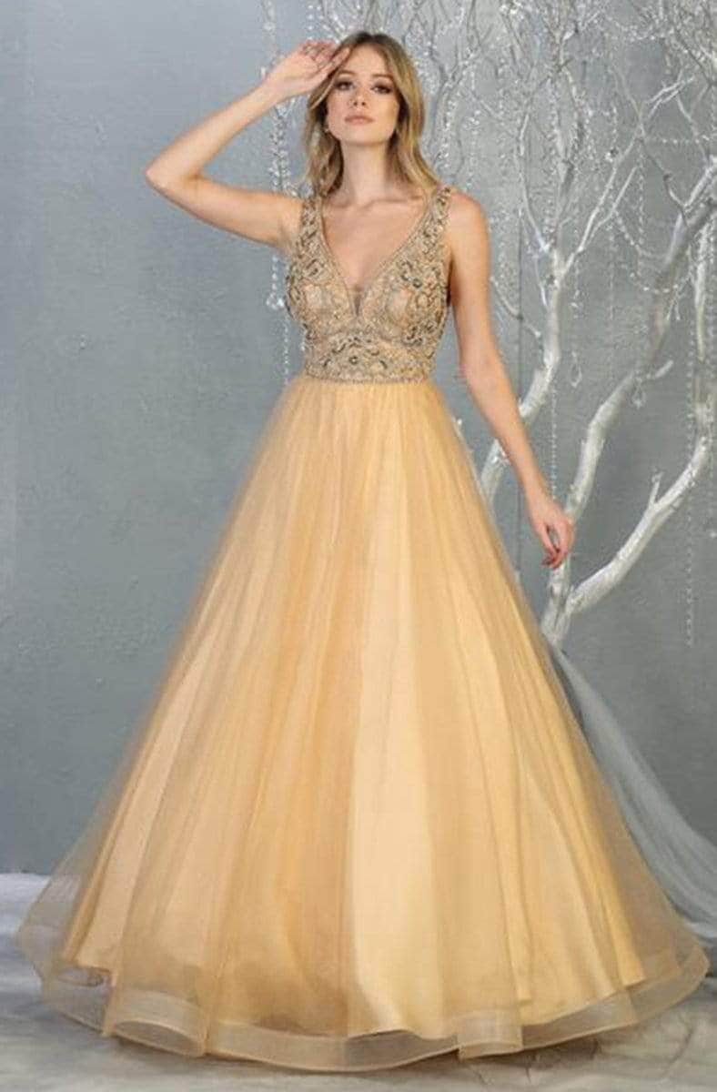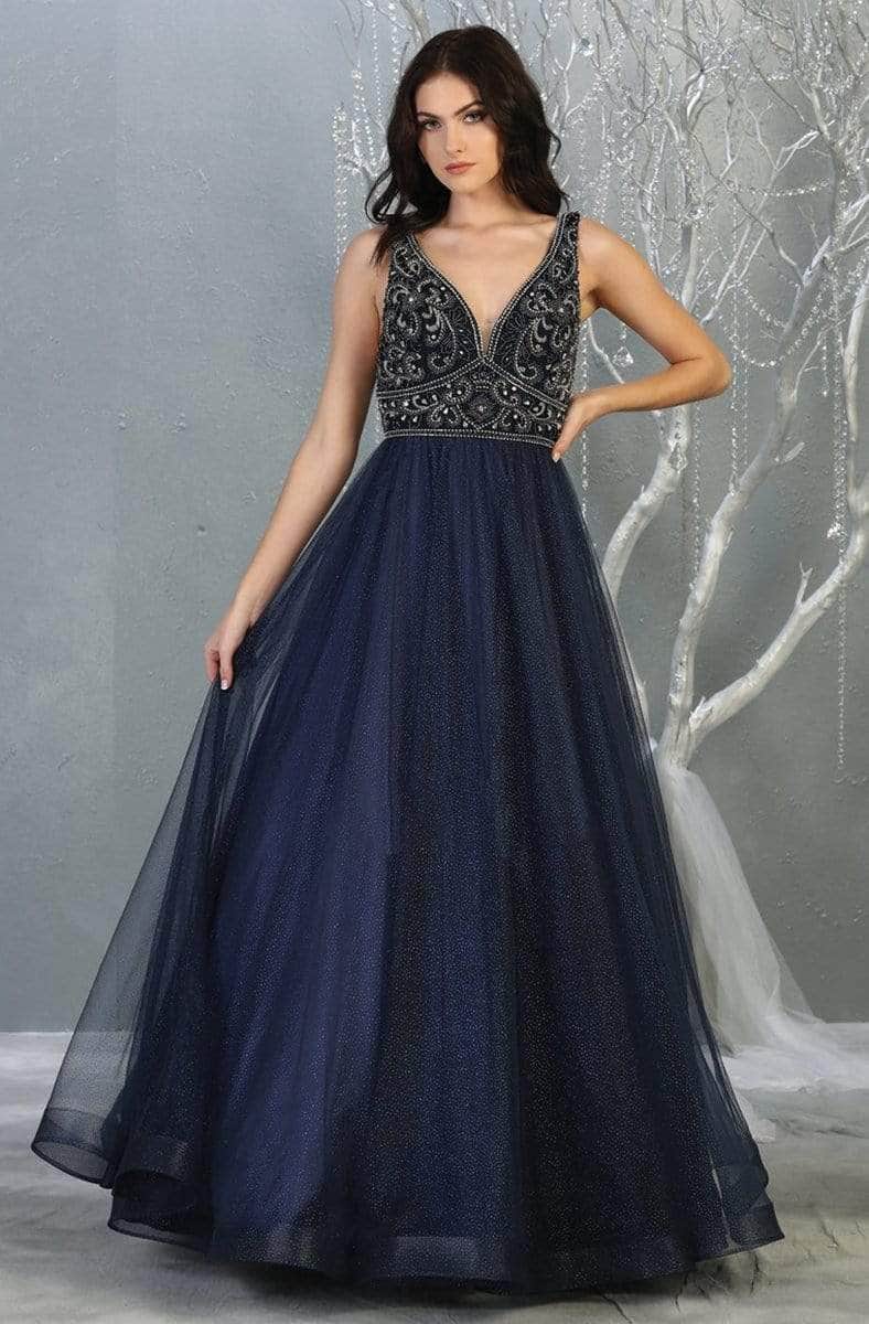Adorn yourself with exquisite beauty in this ornately designed stunner from May Queen RQ7860. This long gown showcases a sleeveless, plunging V-neckline with a fitted bodice adorned with embellishments. The dress flaunts a low V-back and has a full-length A-line skirt. Experience enchantment as you revel in the luxurious aura of this May Queen RQ7860 masterpiece. Models are wearing the Gold and Navy colors.
