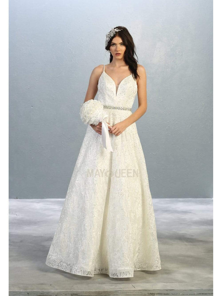 Look sophisticated and classy with this lovely May Queen RQ7880 masterpiece. This dress is designed in scattered heat stones, as the fitted bodice showcases a plunging sweetheart neckline adorned with sheer inset detail at the bust. Spaghetti straps lend support to the top as it leads to the mid-open back. Sparkling embellishments design the waist and leads to the full length a-line skirt. Beam with pride as you show up in this May Queen creation. Model is wearing Ivory color.