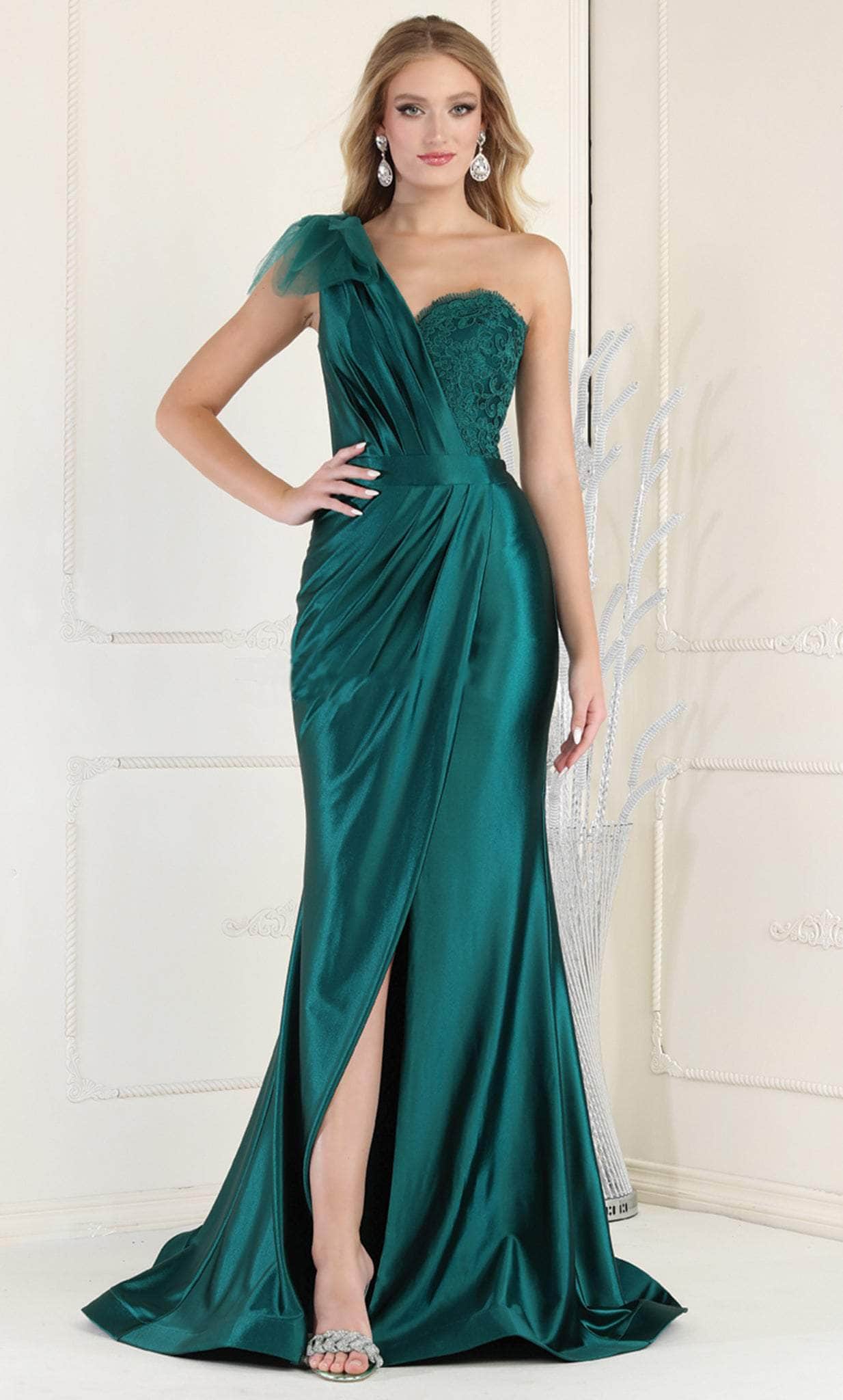 Enter the party and do that walk of a regal beauty in May Queen RQ7962. This wonderful dress features an asymmetric neckline and strap, that flows down in its pleated details to the bodice until the skirt that opens up a slit. The other part of the bodice is also floral embroidered with the dress also having a banded waist and finishes with a horsehair hem that reaches the floor and a sweep train. Mesmerize the crowd with your sophisticated flair in this May Queen RQ7962 masterpiece. Model is wearing Black, Hunter Green, Mocha, Red and Royal colors.