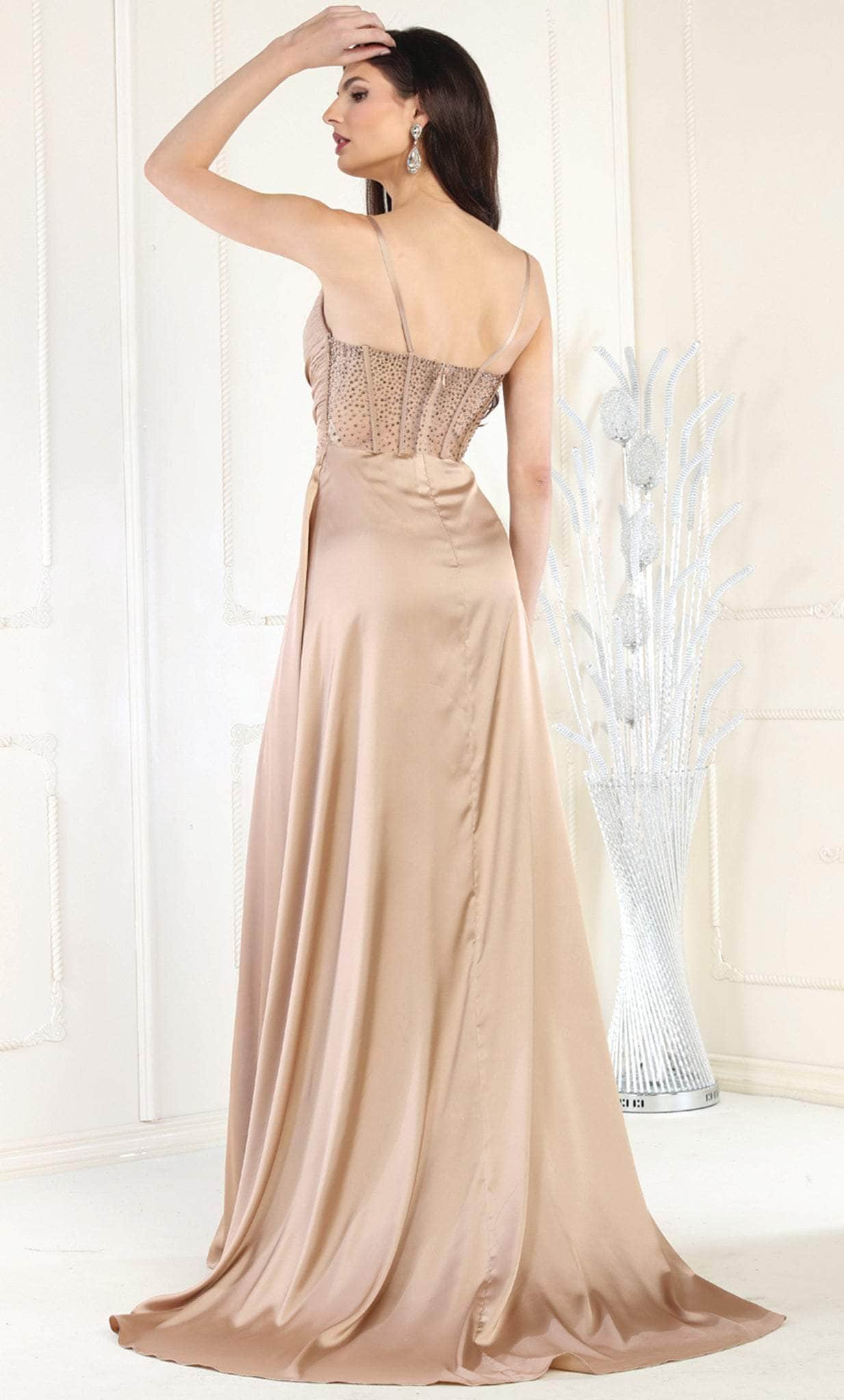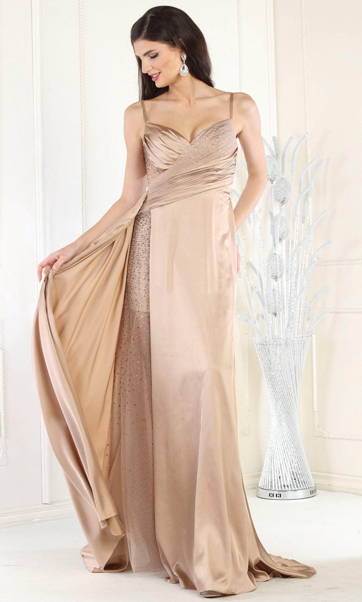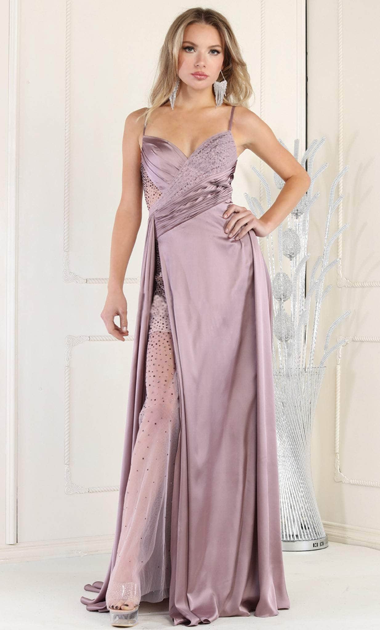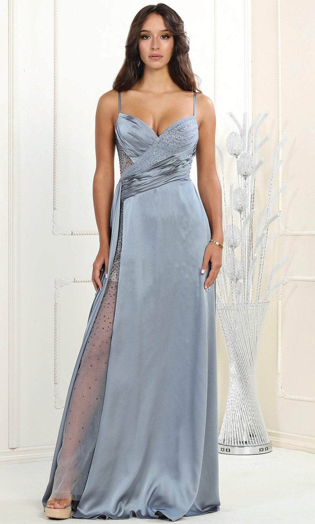 Showcase May Queen RQ7965's extensive selection of designs. This evening dress features extensive mixes of pleated details and stone embellishments at the bodice that is secured behind with back zipper surrounded by sheer details and crystals. The design follows down with the studded fabric of the skirt that is capped by fabric and finished with a sweep train. You will undoubtedly stand out on every occasion with May Queen RQ7965. Model is wearing Dusty Blue, Mauve, Mocha, and Teal Blue colors.