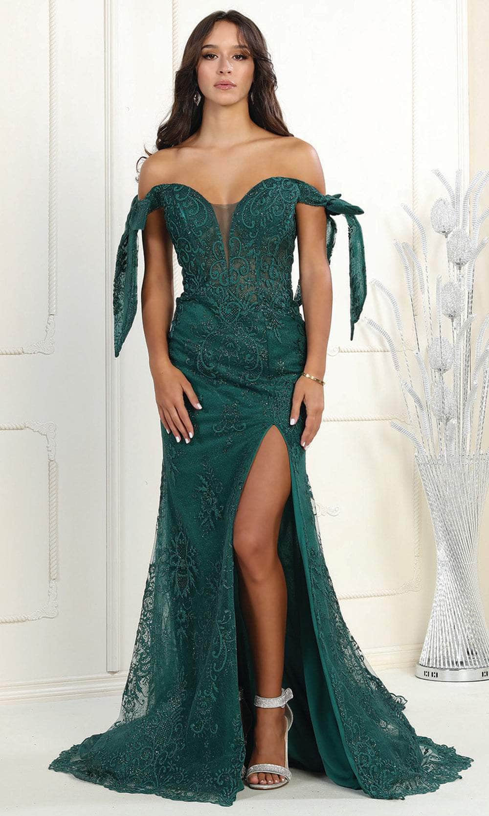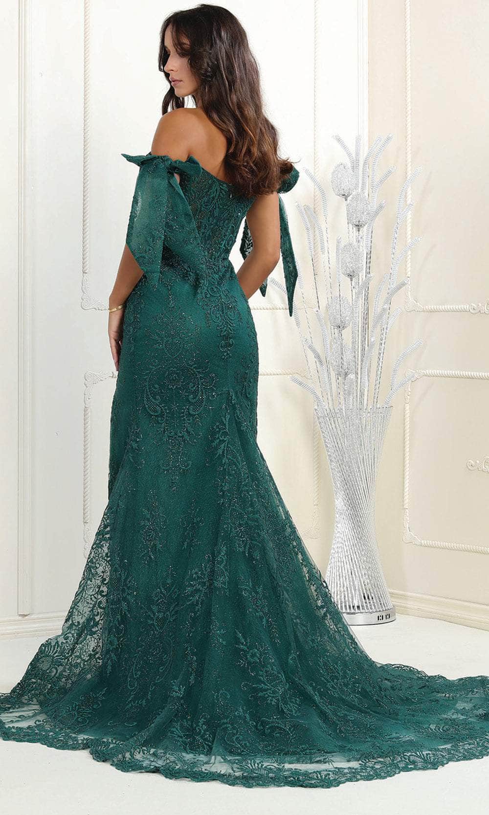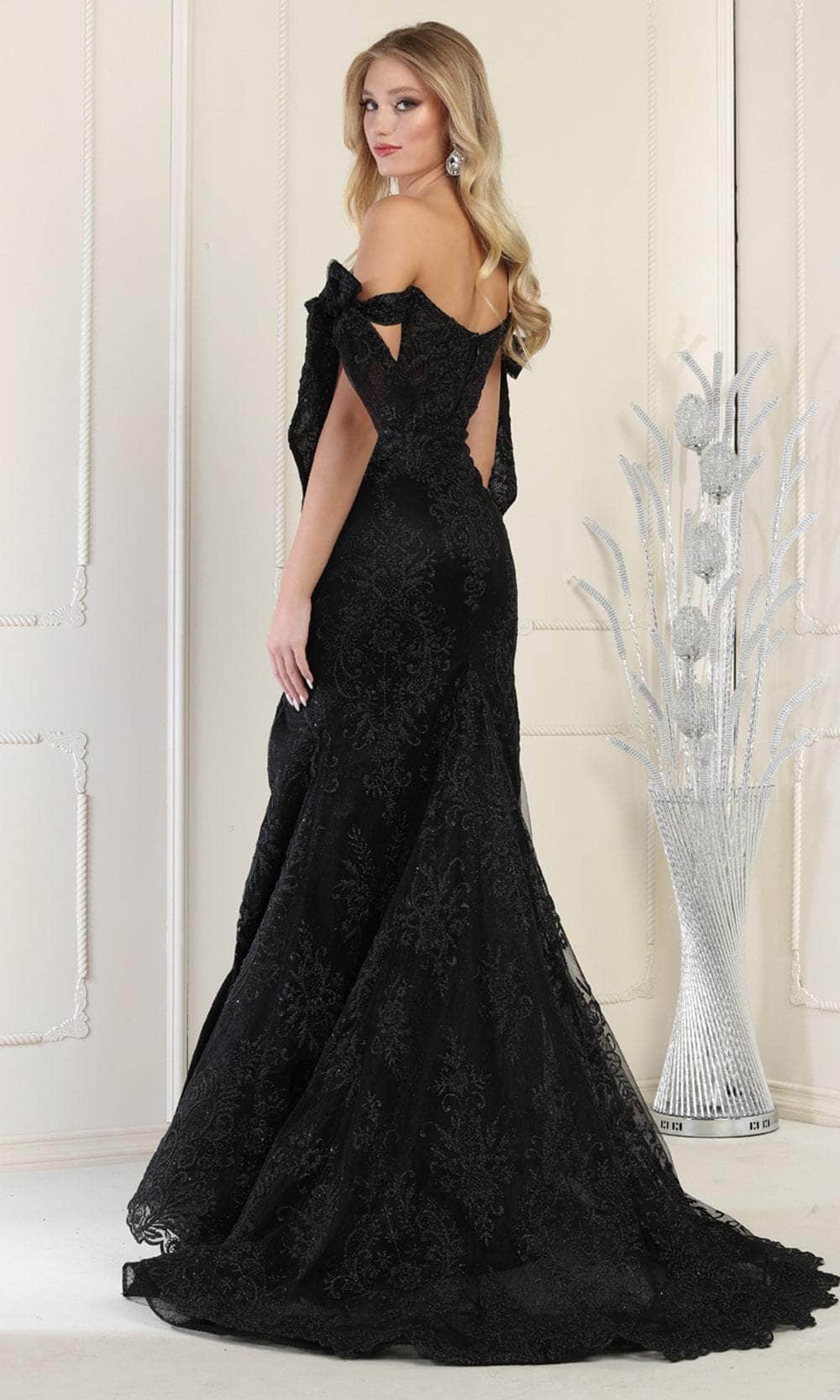 Exude elegance in the May Queen RQ7966 creation, a tantalizingly crafted masterpiece. Meticulously designed with intricate embroidery, this captivating piece showcases an off-shoulder neckline accentuated by bow-tied straps. The bodice features an illusion inset, and the back is elegantly sheer at the midrise. The exquisitely tailored skirt unveils a seductive mermaid silhouette, complete with a provocative slit and a mesmerizing cascade of train. When you make an entrance in the lavishly styled May Queen RQ7966 masterpiece, you're bound to be the star of the show, commanding attention and admiration. Models are wearing the Black, Hunter Green, Red, Rose Gold, and Royal colors.