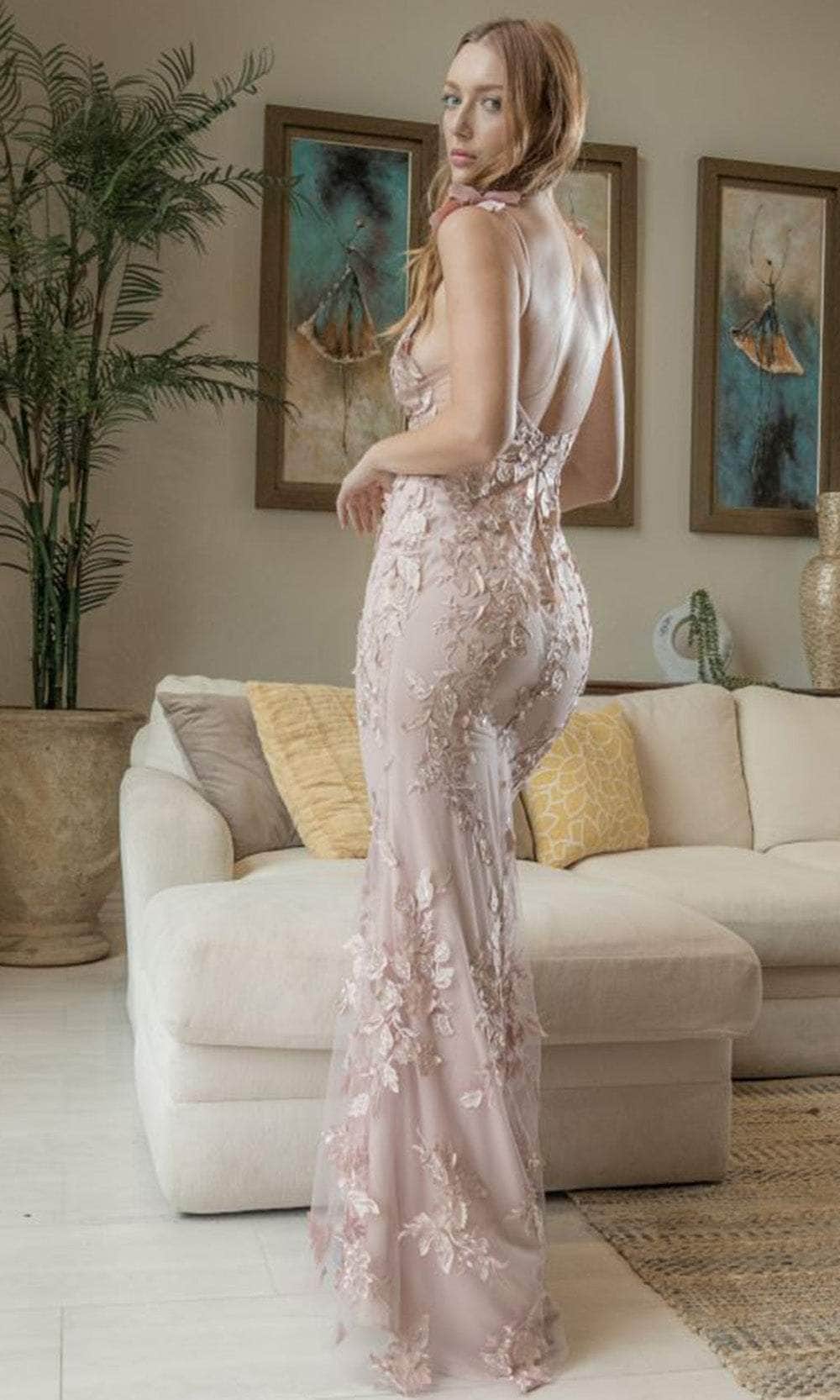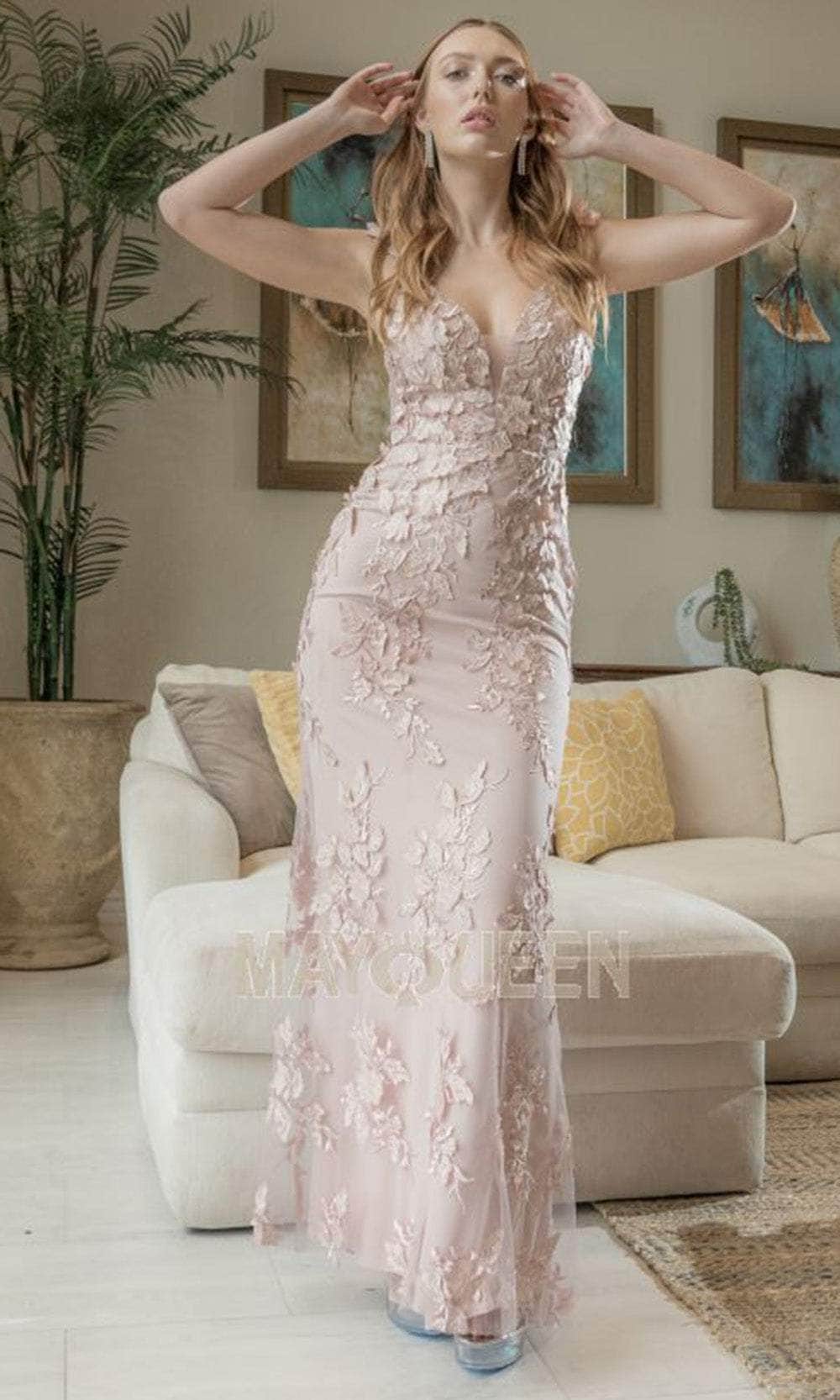 Capture the glamour as you walk in this fabulous evening gown by May Queen RQ7977. Trailing with foliage lace applique and embroidery, this sleeveless gown is eye-catching and enhances your feminine grace. It is strung with delicate spaghetti straps leading to the plunging v-neckline and daring open back. The skirt crafts a sheath silhouette that effortlessly glides to the floor length hem. This May Queen RQ7977 style is specially designed to make that special occasion worth reminiscing. Model is wearing the Mauve color.