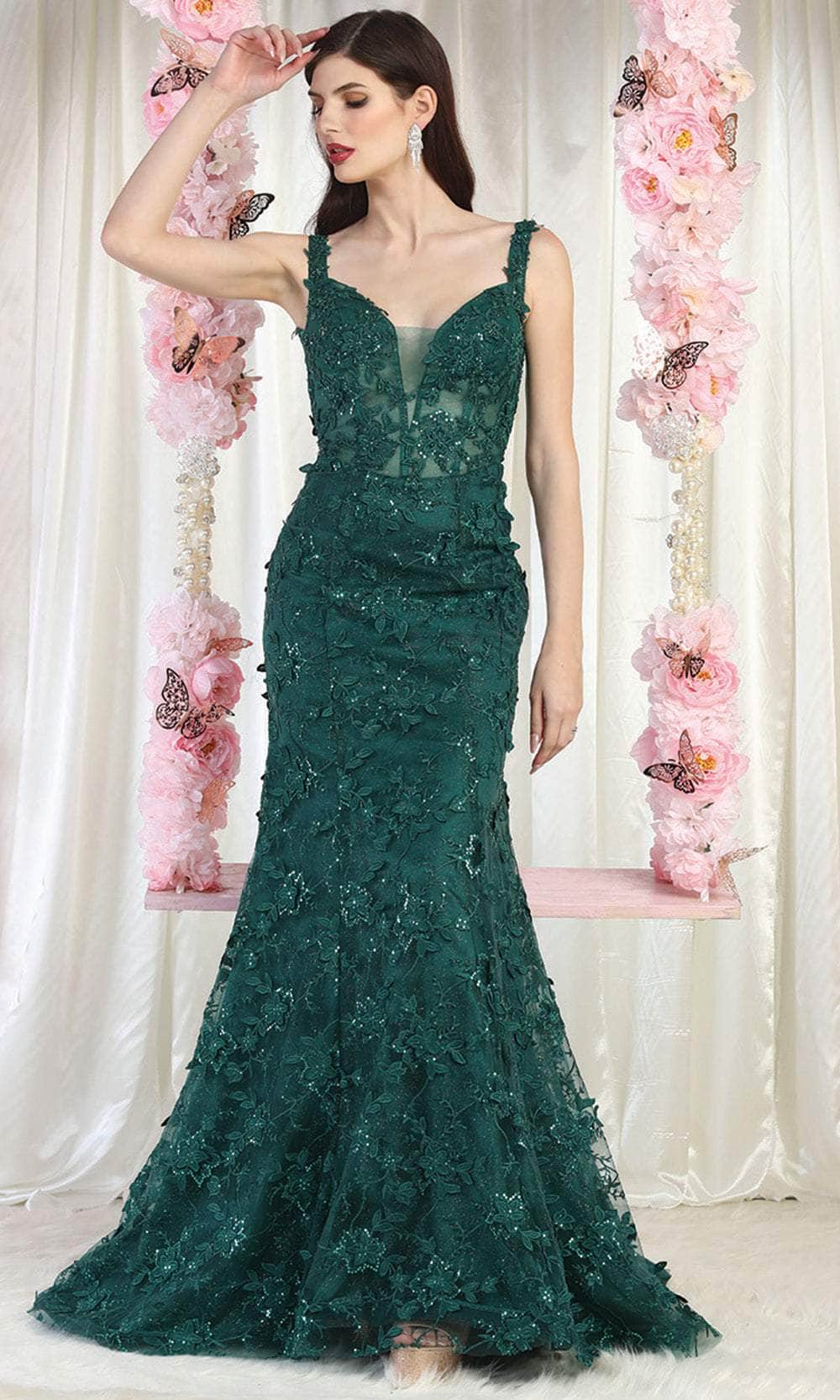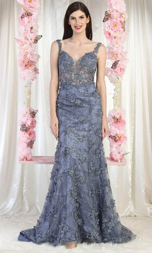 Embrace your inner goddess and exude confidence with this stunning dress from May Queen RQ7982 masterpiece. Adorned beautifully with exquisite embroideries all over. The sleeveless corset illusion bodice adds a touch of sensuality to this breathtaking ensemble. The sheer insert creates a delicate and feminine look, while the train adds a dramatic effect as you walk. The open back and buttons at the center create a stunning focal point, making you the center of attention. This May Queen RQ7982 is perfect for any formal occasion. Models are wearing Dusty Blue, Hunter Green, Ivory and Mauve colors.