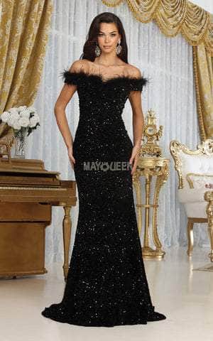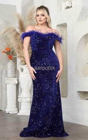 Embrace an exquisitely beautiful gown from May Queen RQ7992. Richly decorated with sparkling sequins and beads, this gown will dazzle all in sight. The off-shoulder sweetheart neckline is accented with delicate feathers that provide a playful touch and enchanting style. Flowing gracefully to the full-length hem and grandeur sweep train, the skirt offers a sheath silhouette to complement your curve-hugging bodice. Make your debut on a red carpet wearing this May Queen RQ7992 creation. Models are wearing the Black, and Royal Blue color.