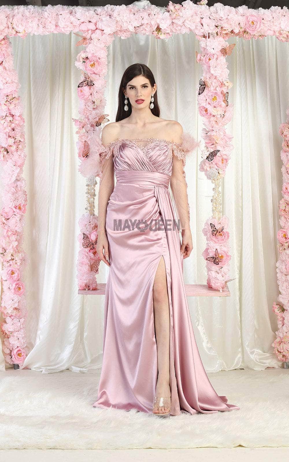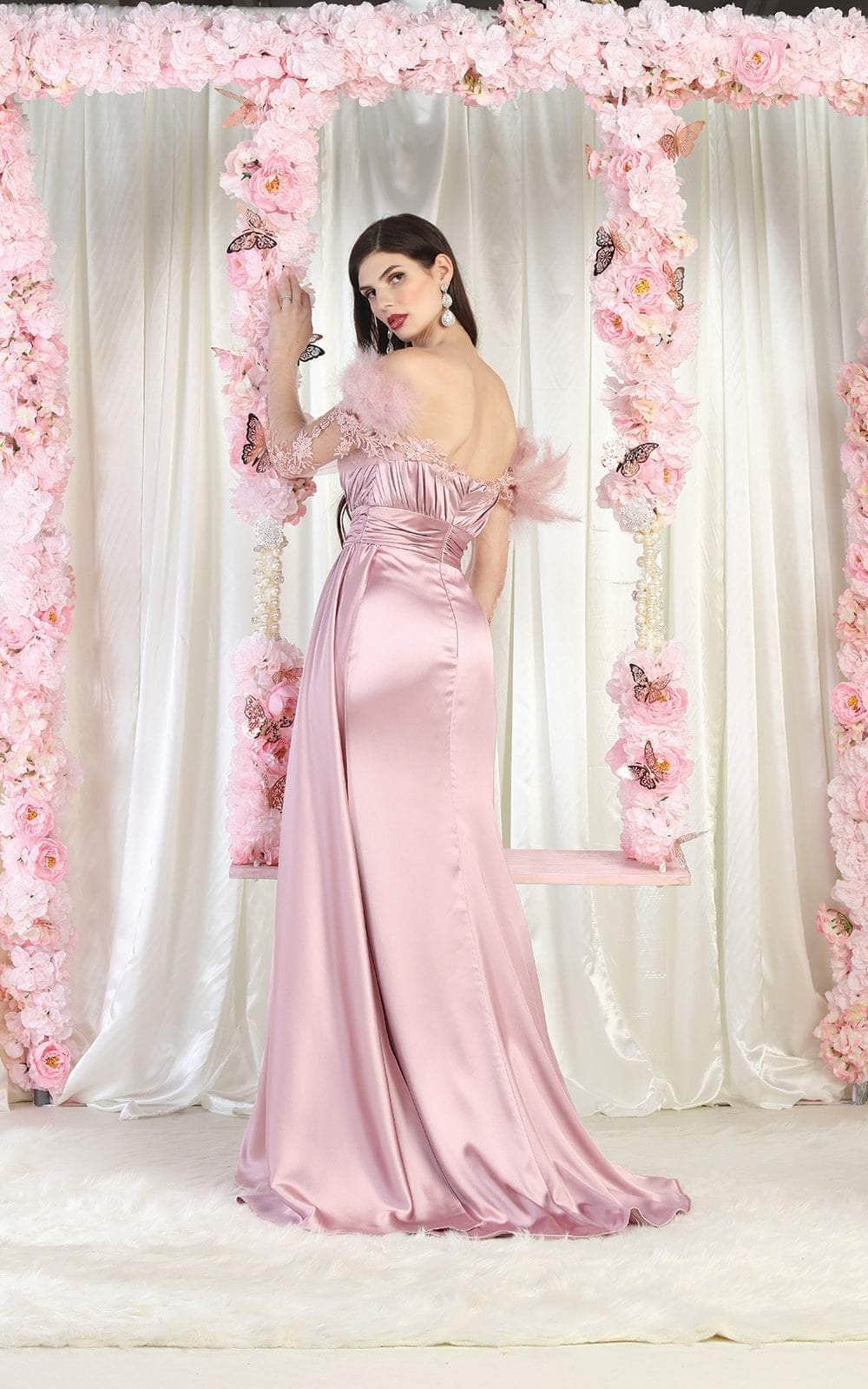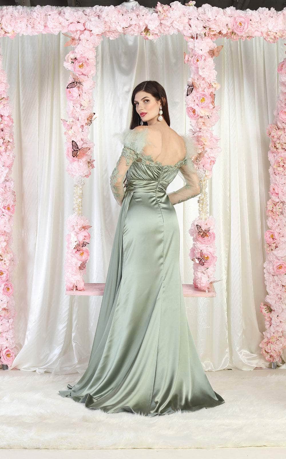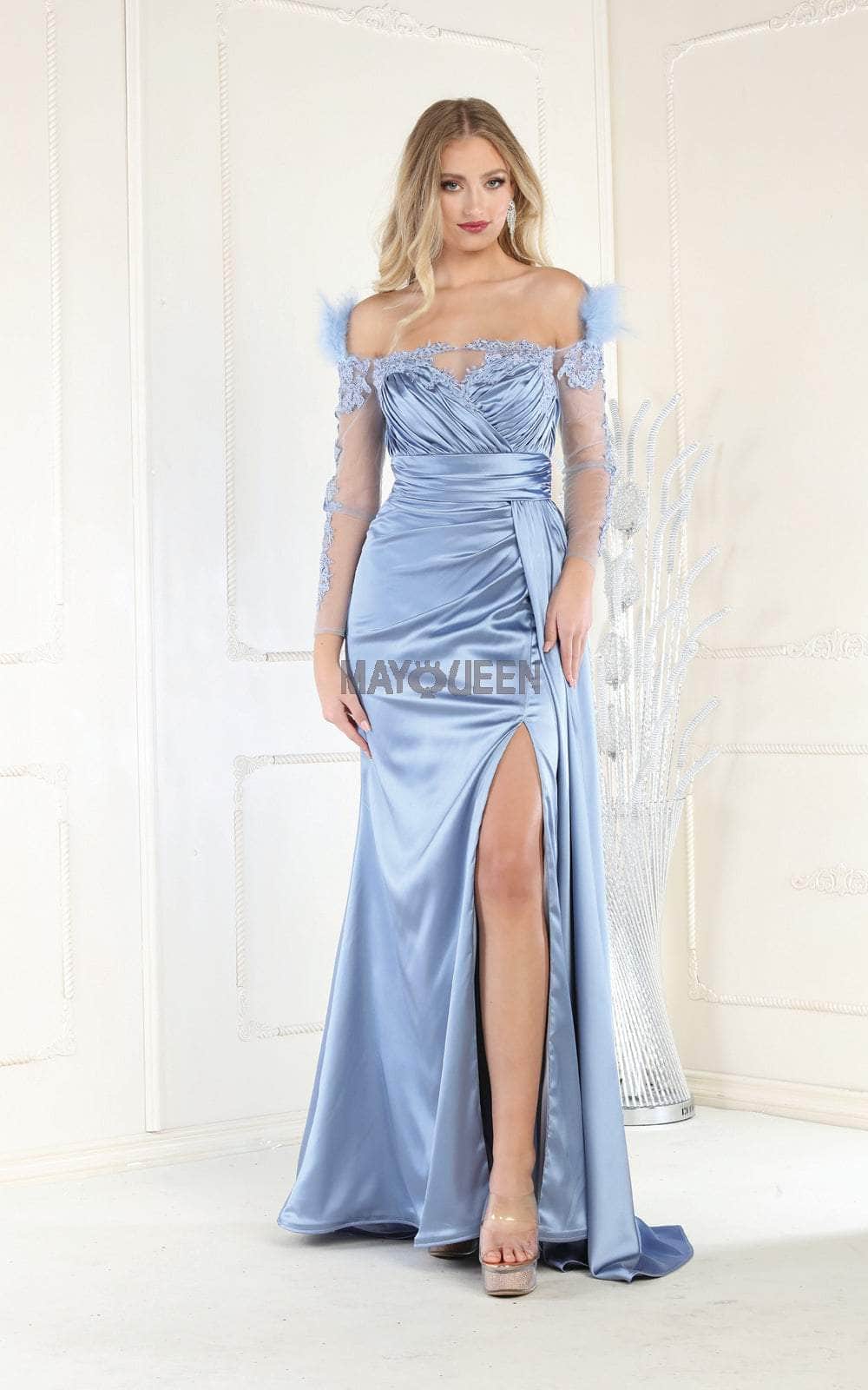 Bound to steal the spotlight in this elegant piece by May Queen RQ8002. The off-shoulder sheer long sleeve with feather accents and exquisite embroideries on the sleeve and neckline add a touch of sophistication, while the ruched detail on the bodice and cummerbund cinches the waistline for a flattering fit. The back zipper closure ensures a seamless finish, while the full-length skirt in an A-line silhouette with a high slit and sweep train finish creates a striking effect. You are statuesque in a posed creation from May Queen RQ8002. Models are wearing Black, Dusty Rose, Dusty Blue, Sage, and Teal Blue colors.
