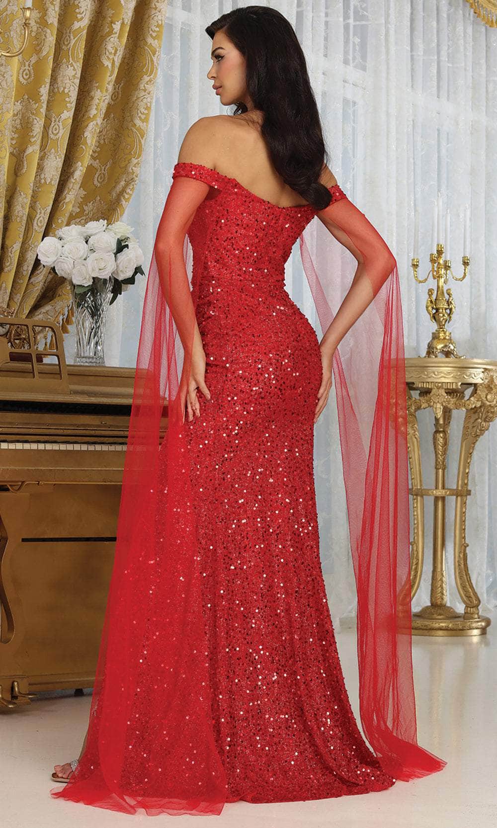 Adorn yourself in a captivating style with the May Queen RQ8012 creation, a perfect representation of elegance and refinement. Skillfully crafted seams delicately outline the alluring silhouette of this garment. The sequin detailed off-shoulder neckline lends a hint of sophistication to the impeccably tailored bodice. With sheer cascading sleeves and a concealed zipper closure at the midrise back, this stunning attire ensures a tailored and flattering fit. The sheath skirt descends gracefully, with a high slit, culminating in a sweep train. Step onto the red carpet as a mesmerizing presence with the May Queen RQ8012 gown, a timeless masterpiece radiating sophistication. Models are wearing the Mocha, Red, and Royal Blue colors.