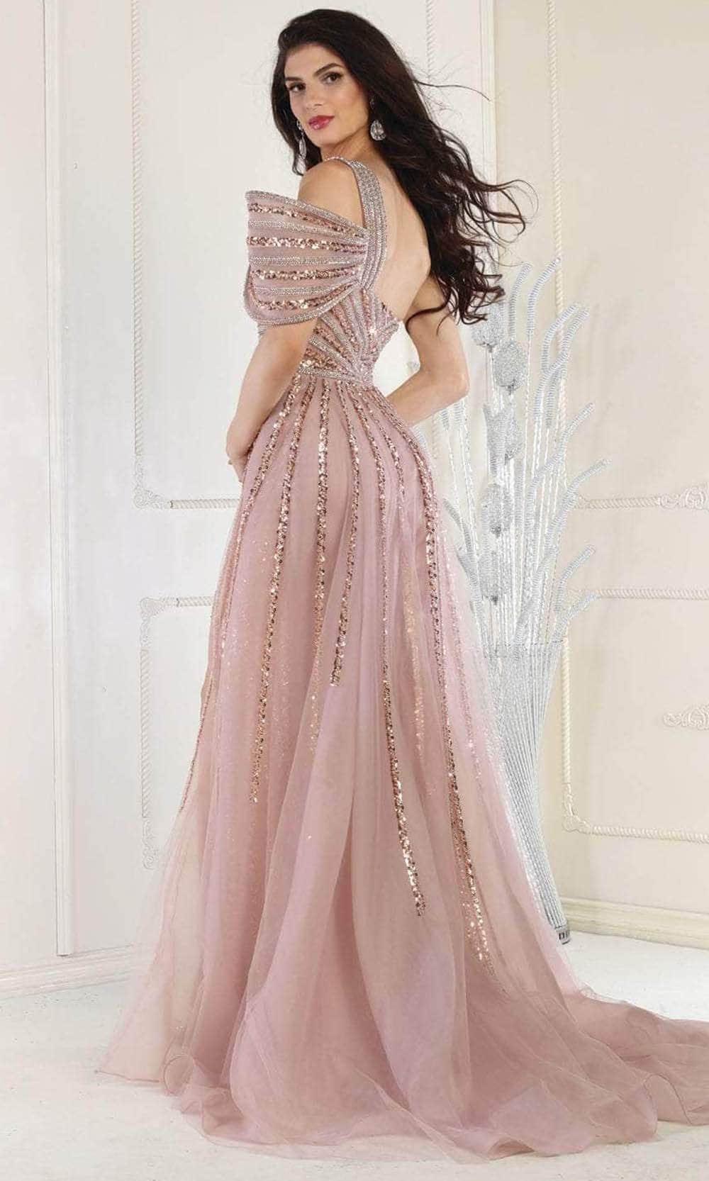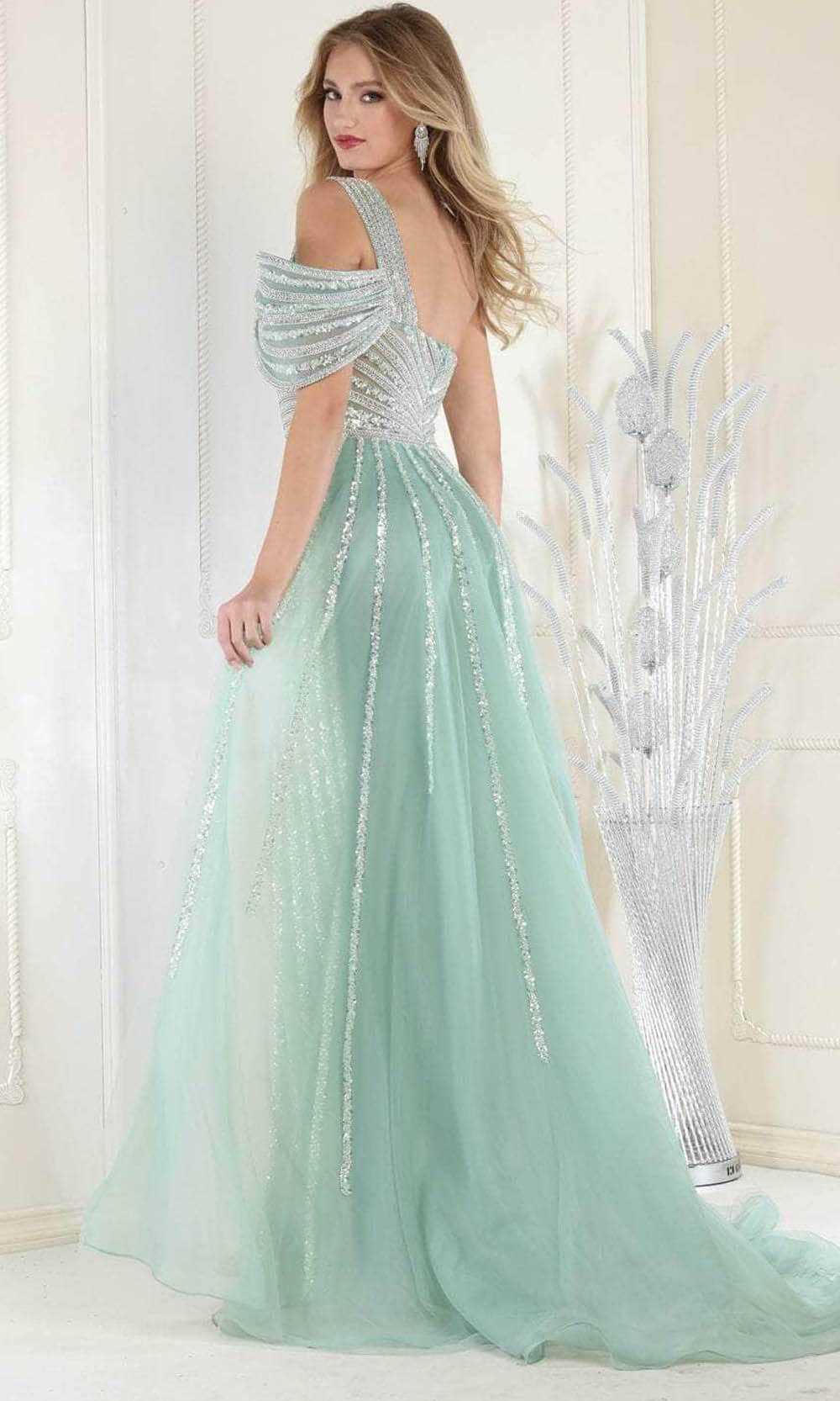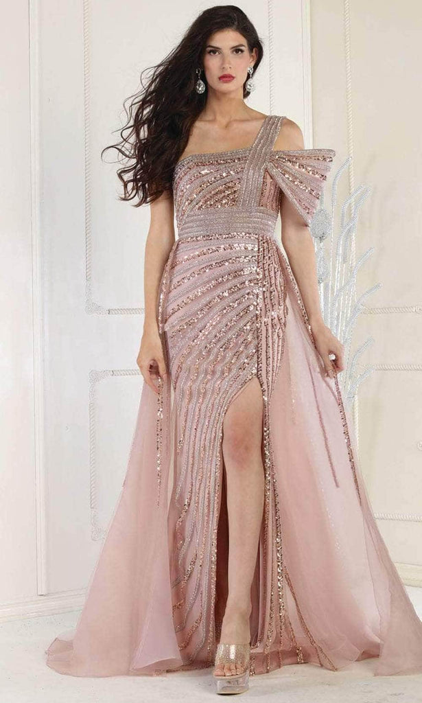 Beam with pride when you wear this glowing creation from May Queen RQ8022. The gown is encrusted with luxurious beaded and sequins in an attention-grabbing linear pattern. With its one-shoulder wide strap and off-shoulder short sleeve design, the top bodice creates an asymmetrical neckline. The back has mid-open detail, with convenient zipper closure for a secure and comfortable fit. The sheath skirt has a high split on the side to show off your elongated legs. Finally, it comes with an A-line overskirt that gives a mesmerizing and dramatic impression. You'll be envied in an unbeatable gown from May Queen RQ8022. Models are wearing the Rosegold, and Sage colors.