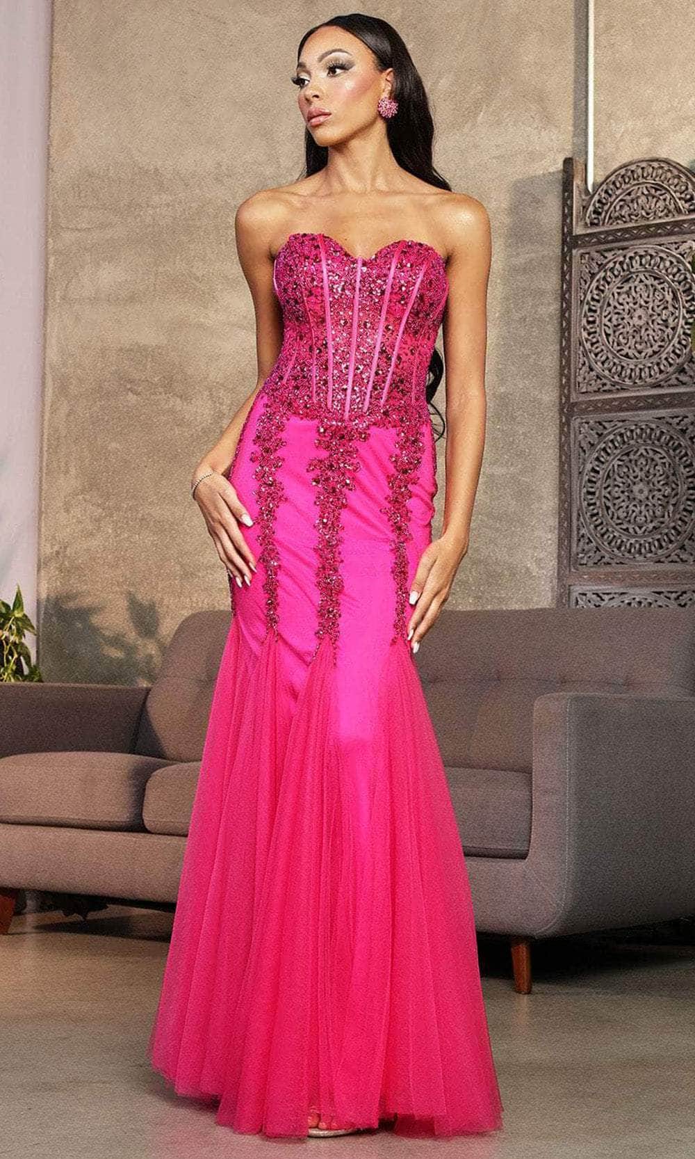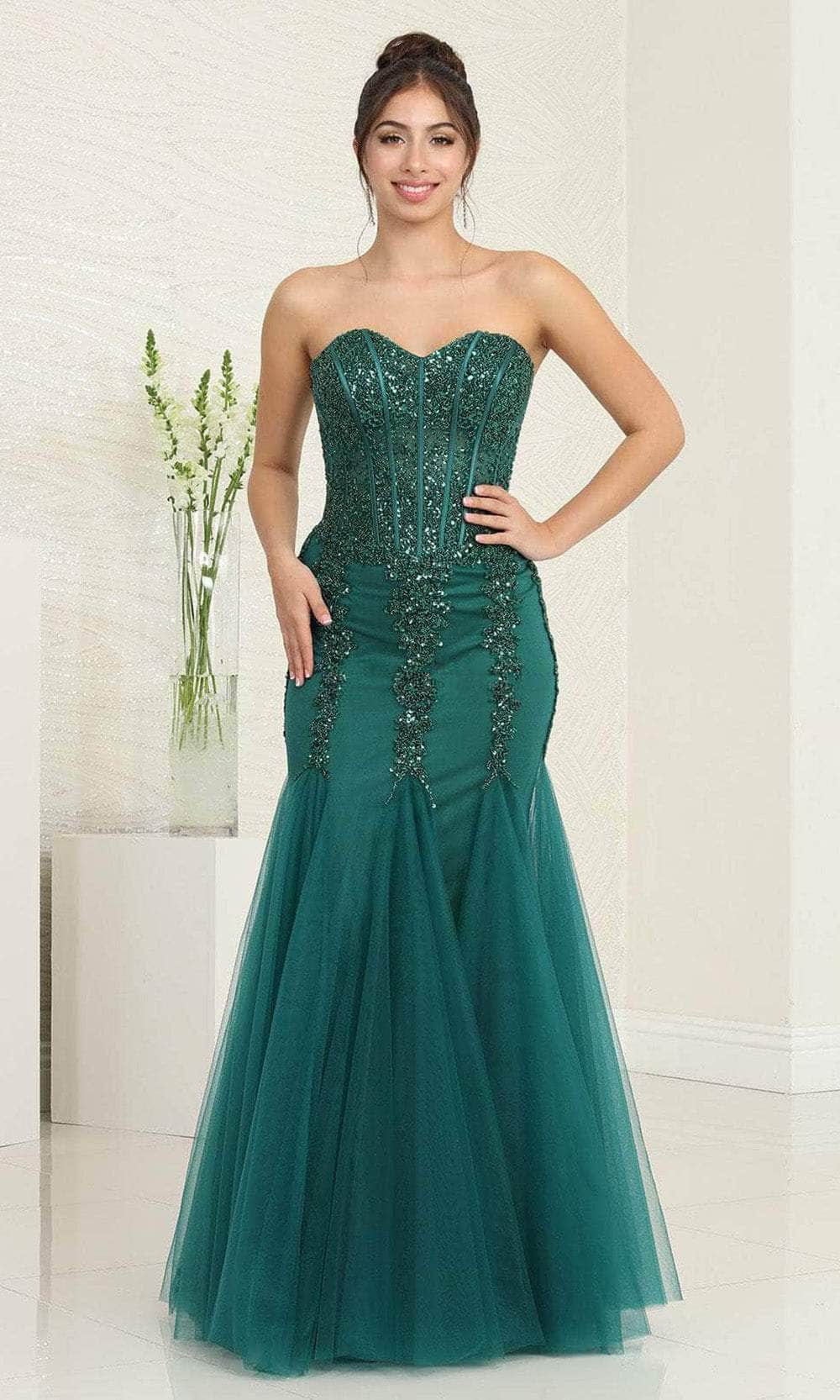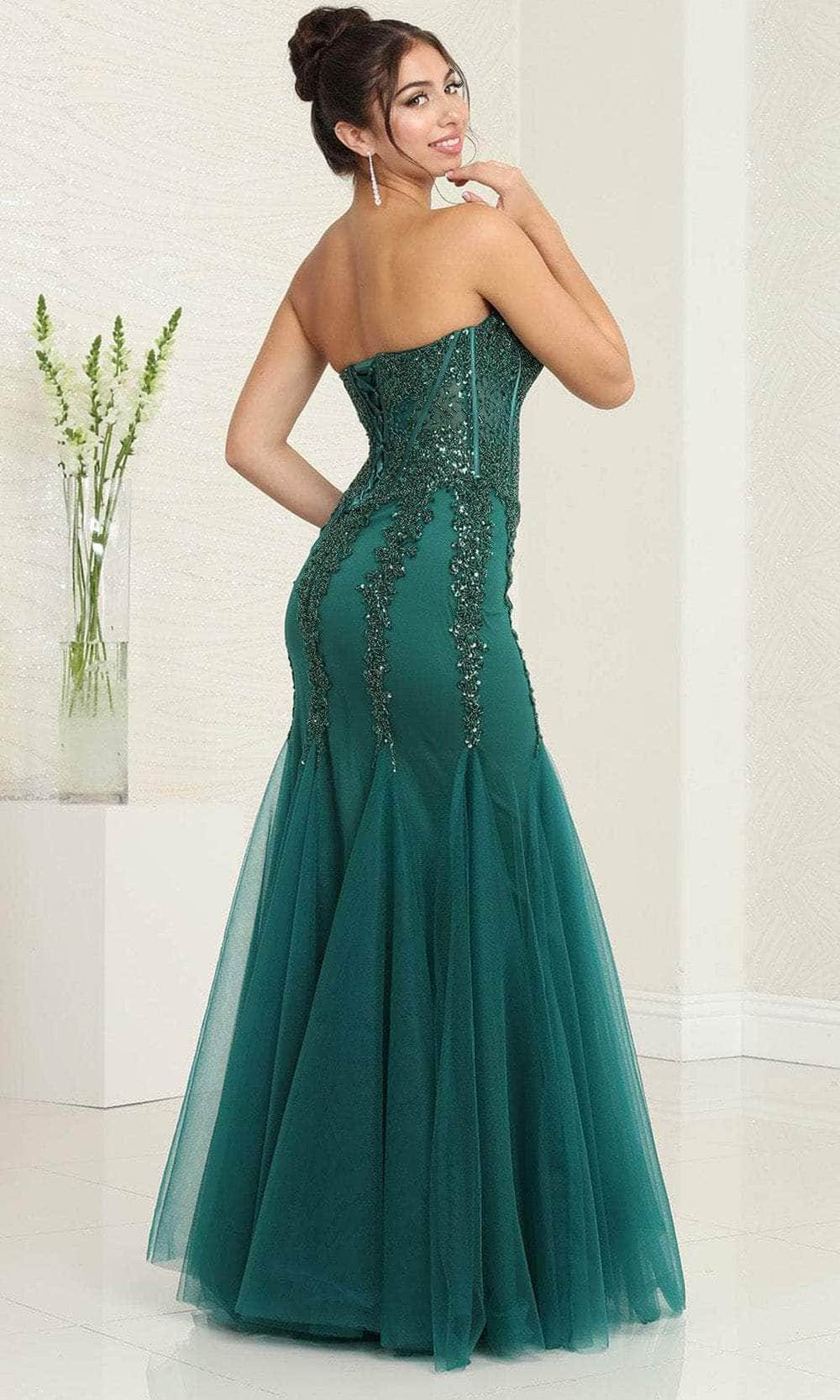 Grant yourself the opportunity to radiate in the May Queen RQ8039 creation. Adorned with a glistening bodice embellished with delicate accents and structured with corset boning, this remarkable piece features an elegant sweetheart neckline. The strapless bodice, paired with a corset-inspired back, enhances the allure of the ensemble. The shimmering skirt, enriched with lavish godet accents, gracefully sculpts and flares, culminating in a floor-length mermaid silhouette. Immerse yourself in the allure and sophistication of this May Queen RQ8039 masterpiece. Models are pictured wearing Black, Dusty Blue, Hunter Green, Lilac, Magenta, and Red variants.