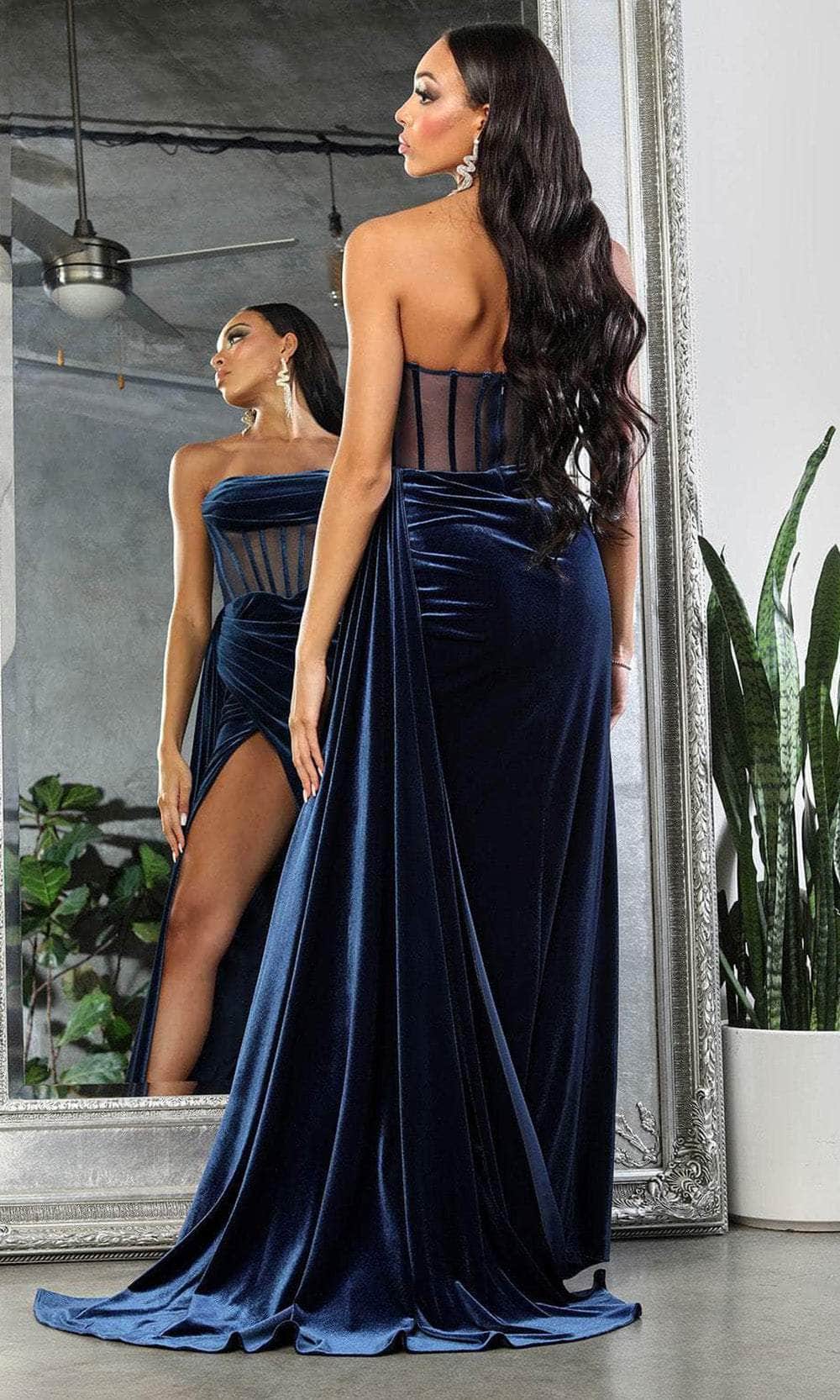 | Details: | Strapless, Pleated Accent, Sheer Corset, Illusion Midrise Back, Concealed Zipper Closure, Side Sash, High Slit, Sweep Train |