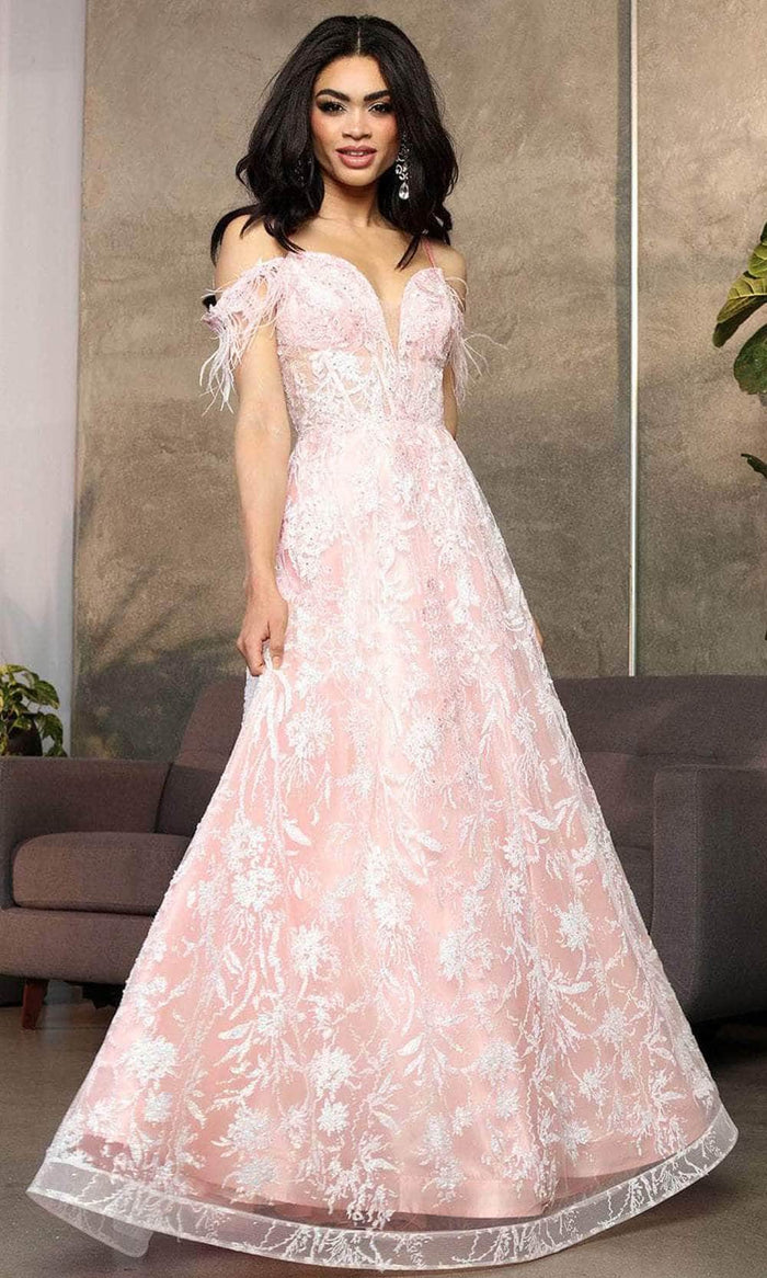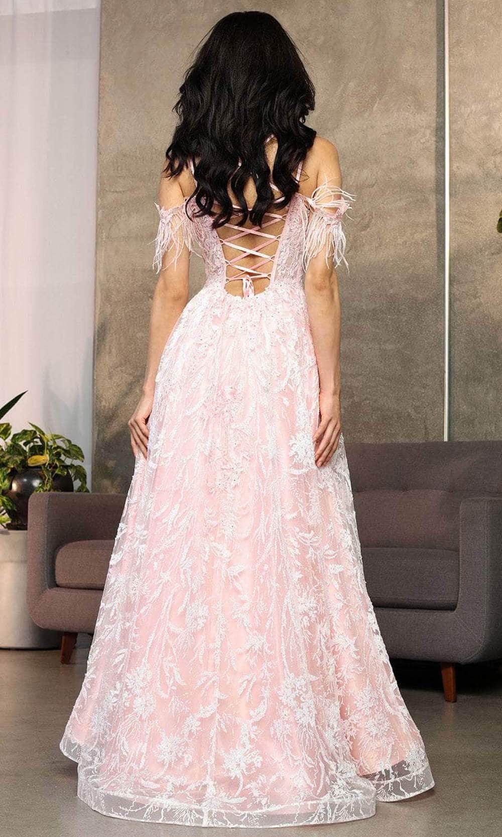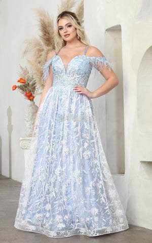 Bloom with exquisiteness in this creation from May Queen RQ8070. Mesmerizing in cold shoulder design, the gown displays a plunging sweetheart neckline with sheer inset, spaghetti straps, and alluring feathers adorning the off-shoulder sleeves. It is elaborately detailed with embroidery and studded beads from the corset bodice down to the hem. With its open back feature, a glimpse of skin is revealed, and it has a lovely strappy lace-up closure for a comfortable fit. The skirt forms a flattering A-line silhouette with sweeping train and horsehair edges. You'll look whimsical in photos with a beautiful gown from May Queen RQ8070. Models are wearing the Blush, and Dusty blue colors.