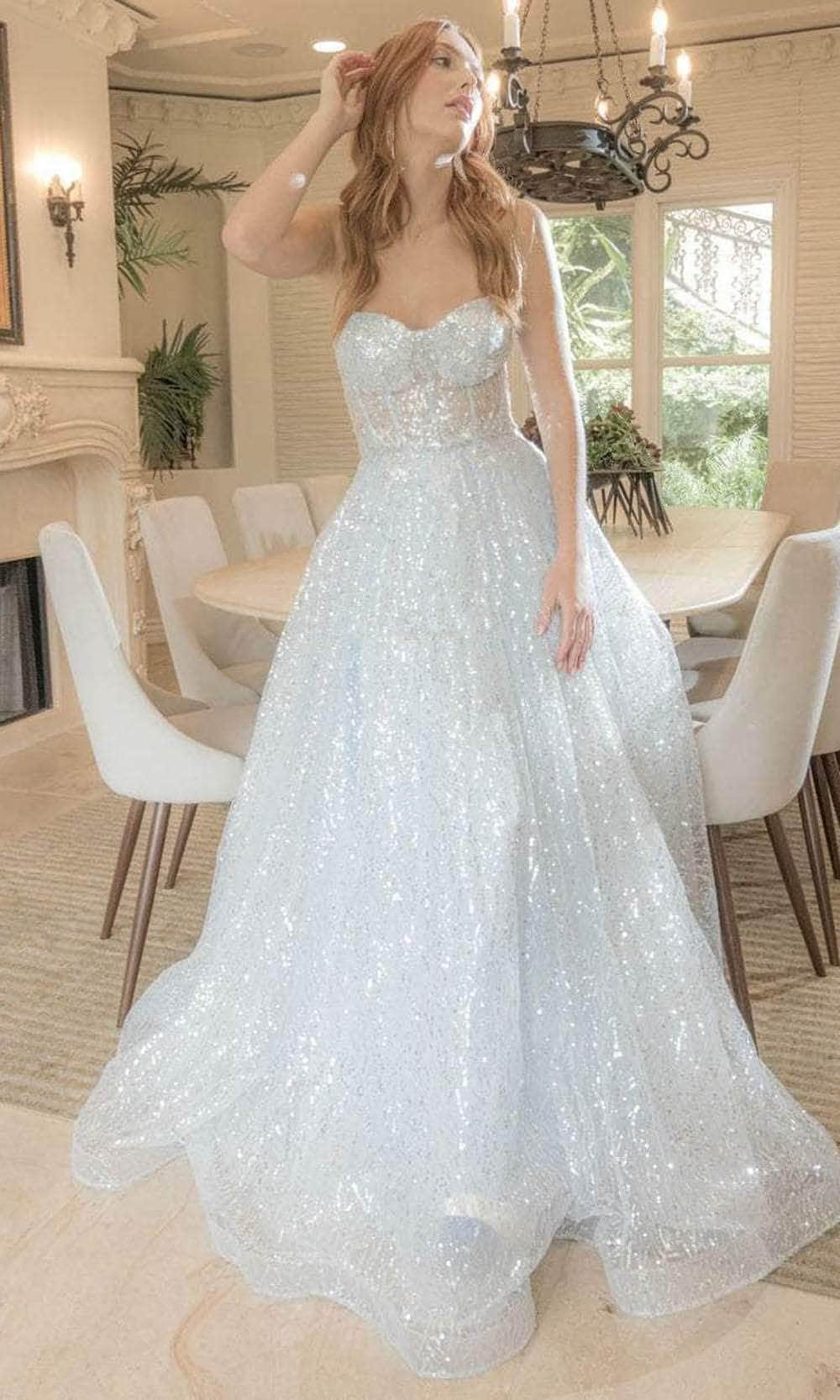 | Details: | Strapless, Illusion Corset Bodice, Sequins, Horsehair Hem, Sweep Train |