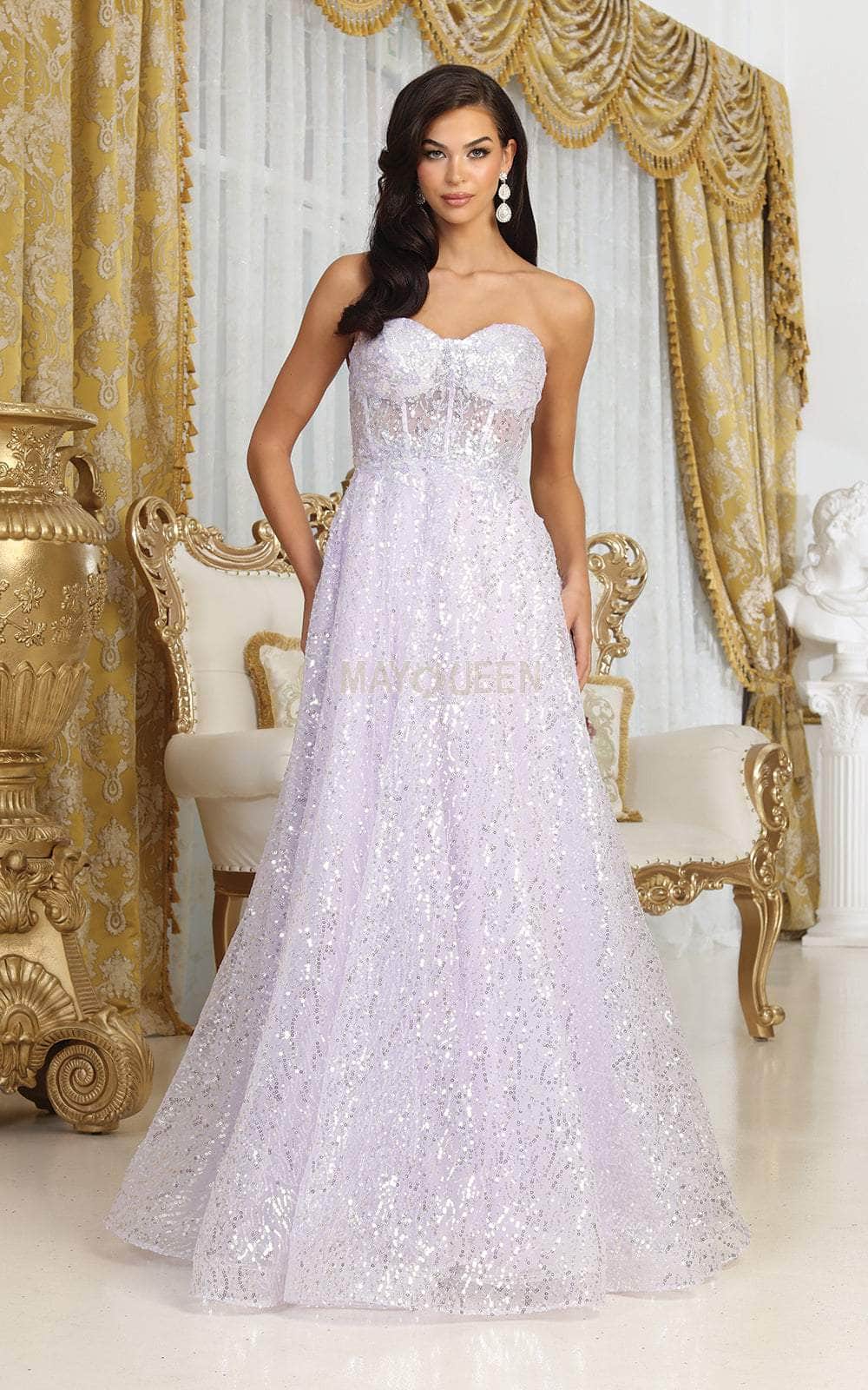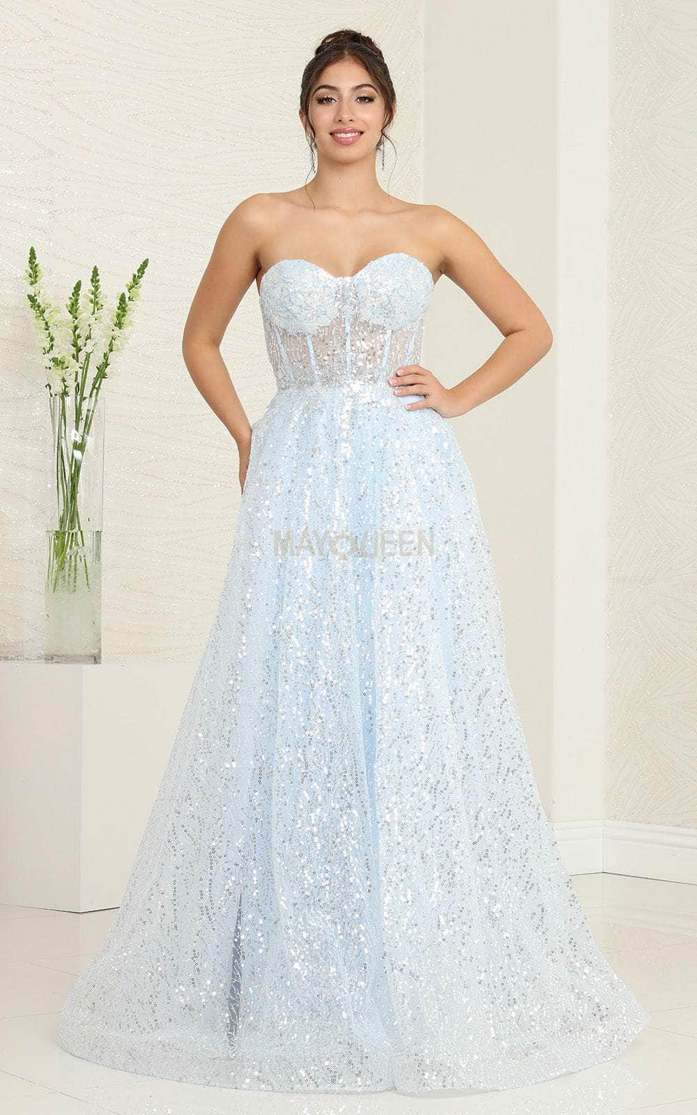 Be the enchantment of everyone’s eyes in this May Queen RQ8077 masterpiece. The strapless design beautifully highlights the glittering sequin embellishment throughout the fit and flare bodice. The illusion corset boning adds a hint of allure, and is topped by a sweetheart neckline. From the natural waist, the skirt reveals an A-line silhouette complemented by a horsehair hem and a grandeur sweep train. This May Queen RQ8077 evening gown gives you an appealing look that will last a lifetime. Models are wearing the Baby Blue, and Lilac colors.