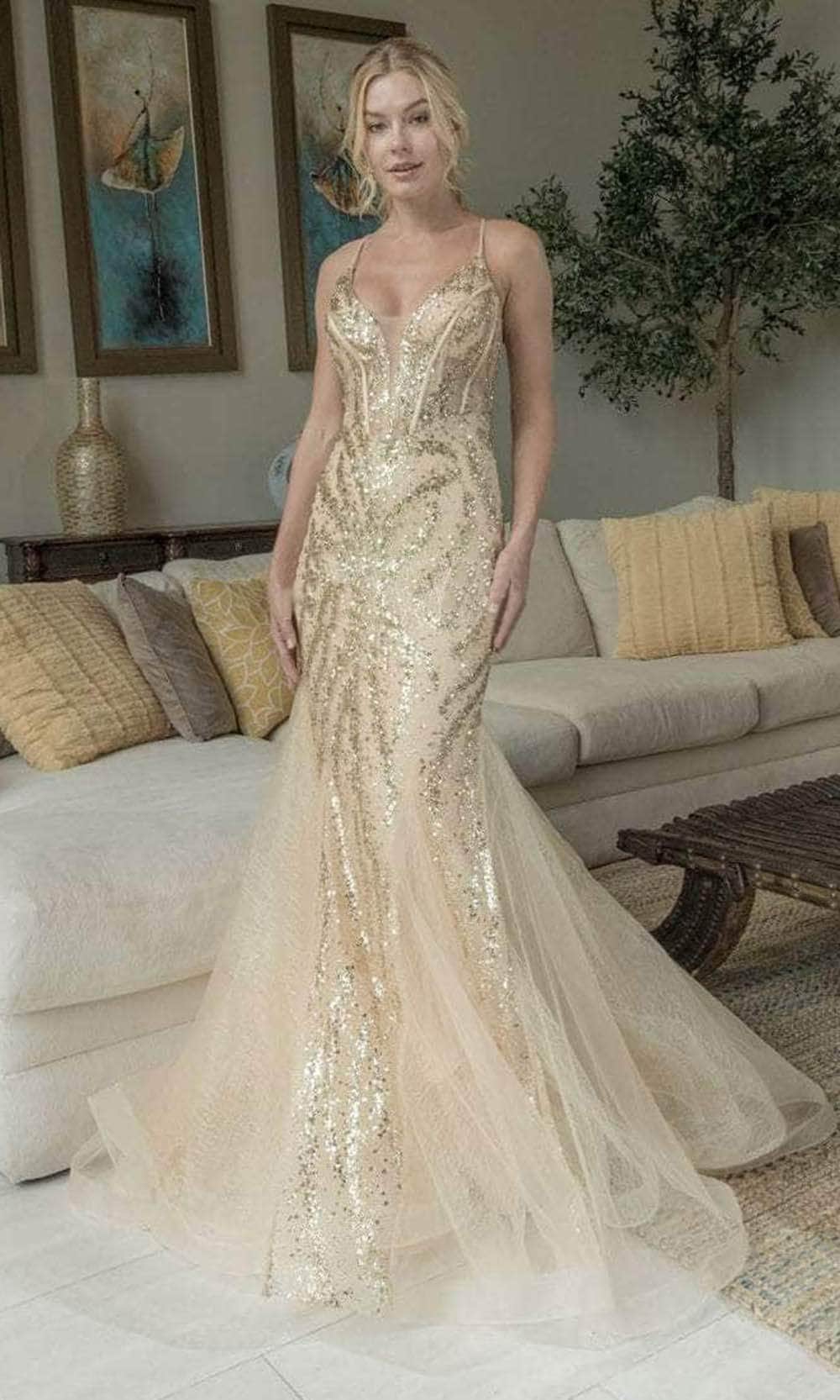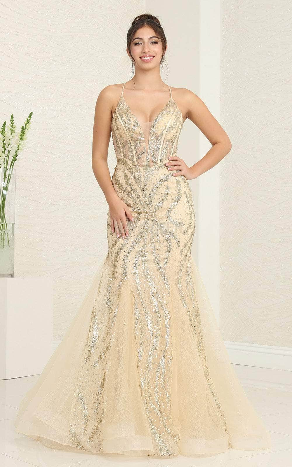 Embody allure and elegance in the captivating May Queen RQ8078 masterpiece. This sleeveless gown is a vision of sophistication, bedecked with sparkling beads and sequins that adorn its figure-flattering bodice. The corset top, featuring exposed boning, boasts a plunging V-neckline and delicate spaghetti straps for support. With tulle godets enhancing volume, the skirt forms an enthralling mermaid silhouette, cascading to a sweeping train and culminating in a horsehair hem. Elevate your eveningwear repertoire instantly with this enchanting May Queen RQ8078 gown. Models are wearing the Gold, and Red colors.