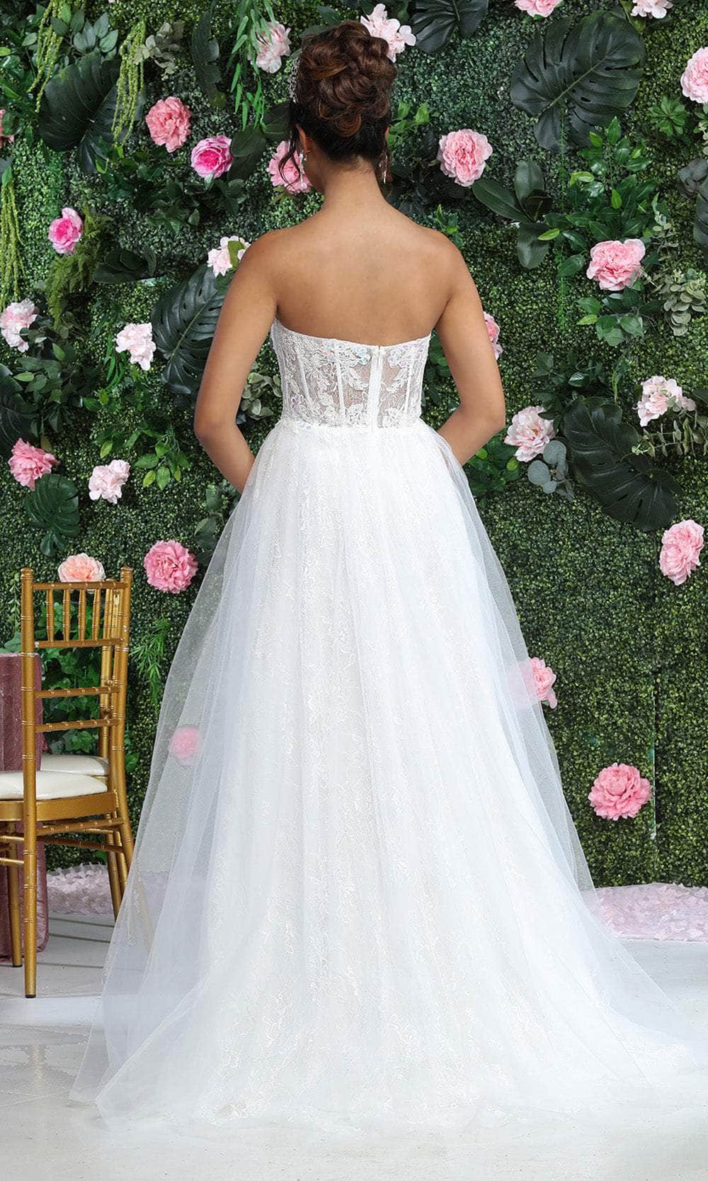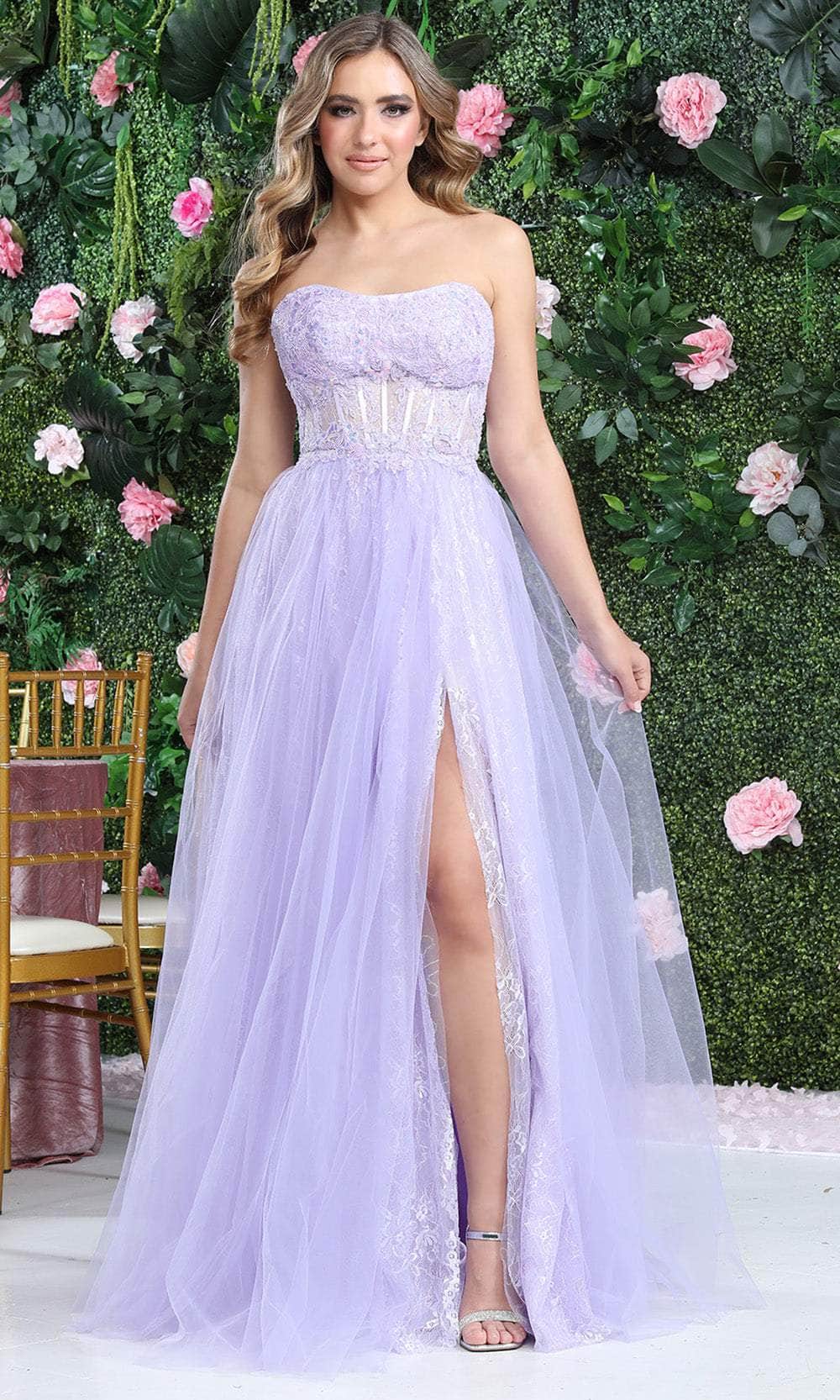 Make this night worth remembering with this May Queen RQ8108 masterpiece. Beautifully enhances your natural allure, this strapless outfit is crafted from lace fabric with sequins and embroidery adornment. The semi-sweetheart neckline flawlessly accentuates your collarbones, complemented by a mid-open zippered back. It has a tantalizing sheer corset bodice that sculpts and enhances your figure. Unveiling your sexy legs with a thigh-high slit, the gathered skirt flares an A-line silhouette that descends to the sweeping train. Feel divine in a heavenly gown from May Queen RQ8108. Models are wearing Ivory, and Lilac colors.