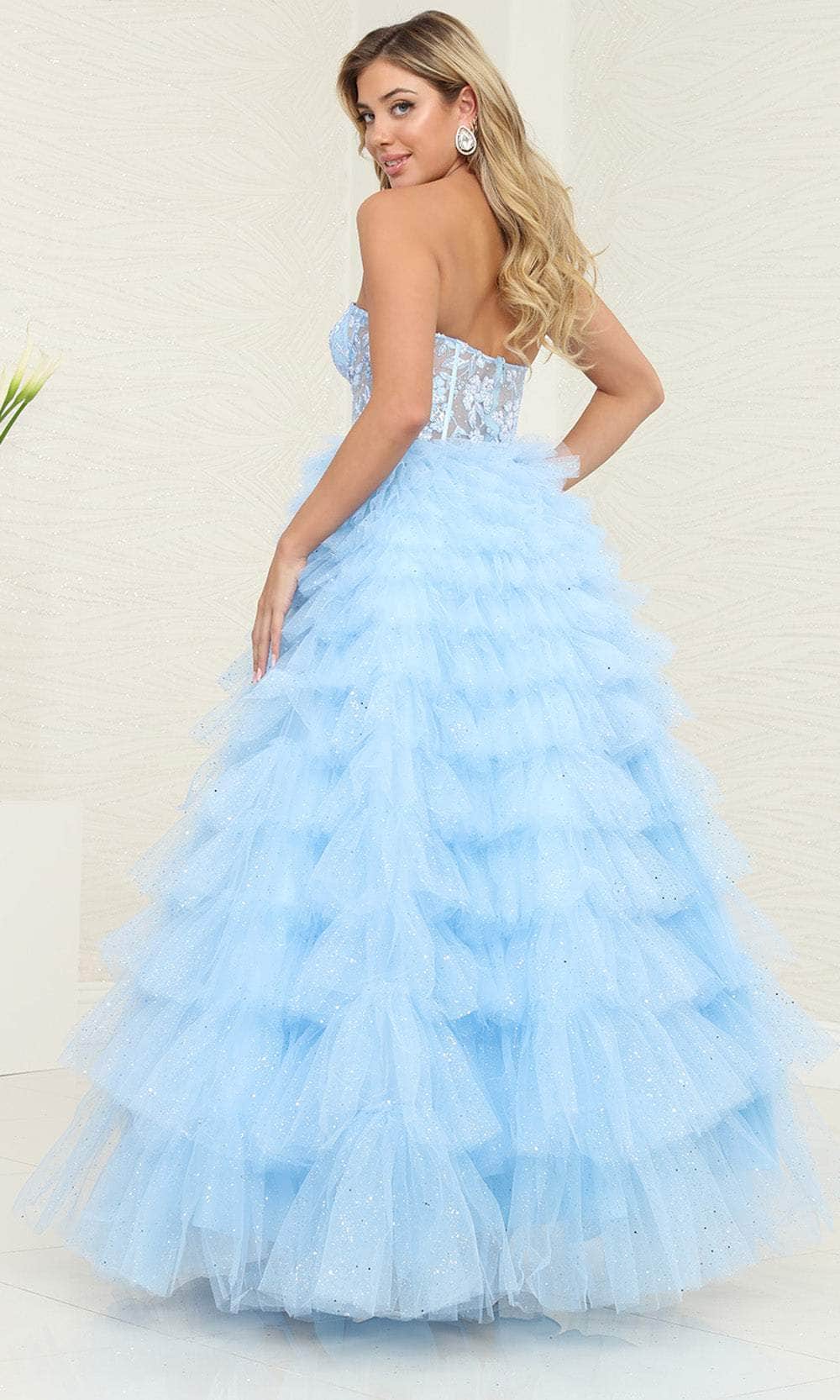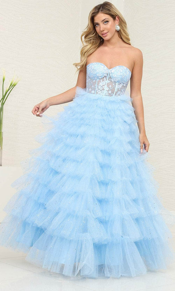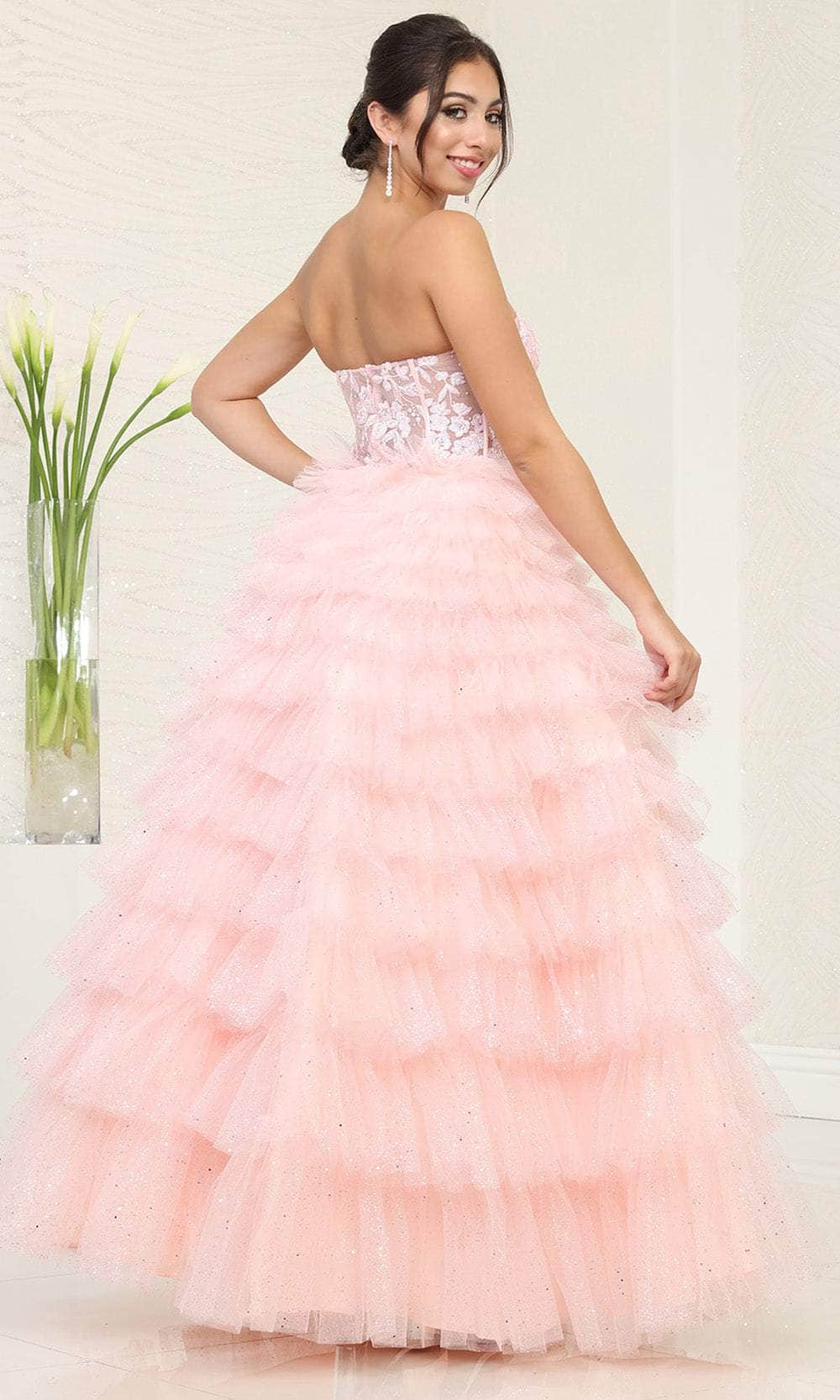 Glide into a fairytale with the May Queen RQ8124 prom dress, a masterpiece of ethereal romance. Expert tailoring sculpts a dreamlike silhouette, accentuated by a strapless design that flatters your shoulders. The sweetheart neckline leads to a sheer corset bodice, adorned with intricate details. The sheer midrise back adds a touch of modern allure. The skirt takes center stage, featuring a cascade of whimsical ruffled tiers that flow gracefully to the floor. This May Queen RQ8124 creation is the epitome of youthful elegance, transforming you into the belle of the ball and leaving a lasting impression on your grand night. Models are wearing the Baby Blue, Blush, and Lilac colors.