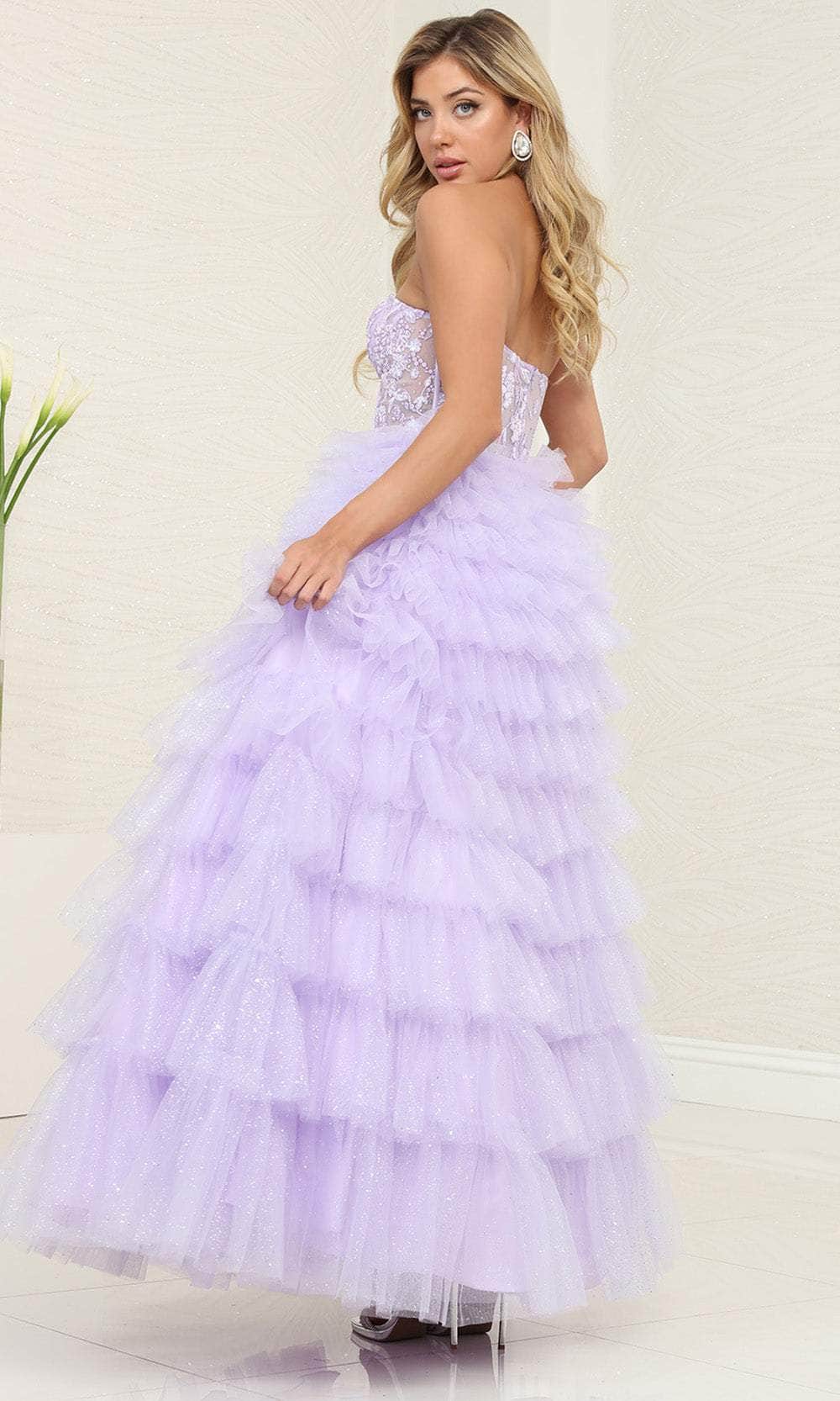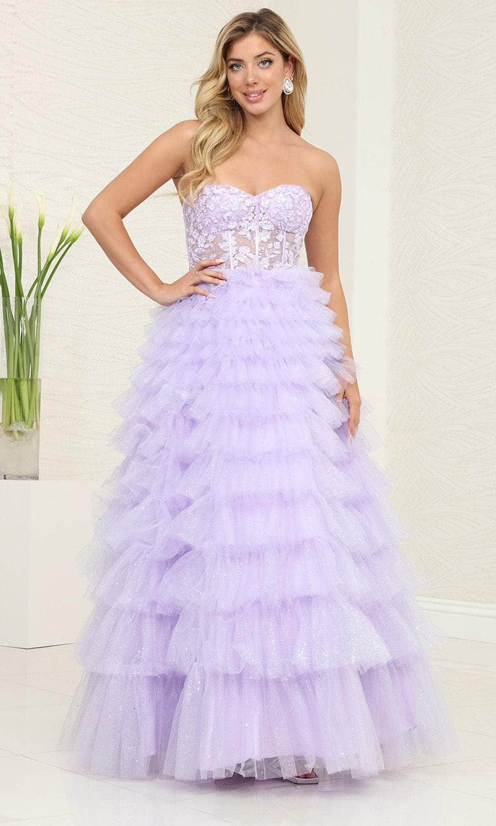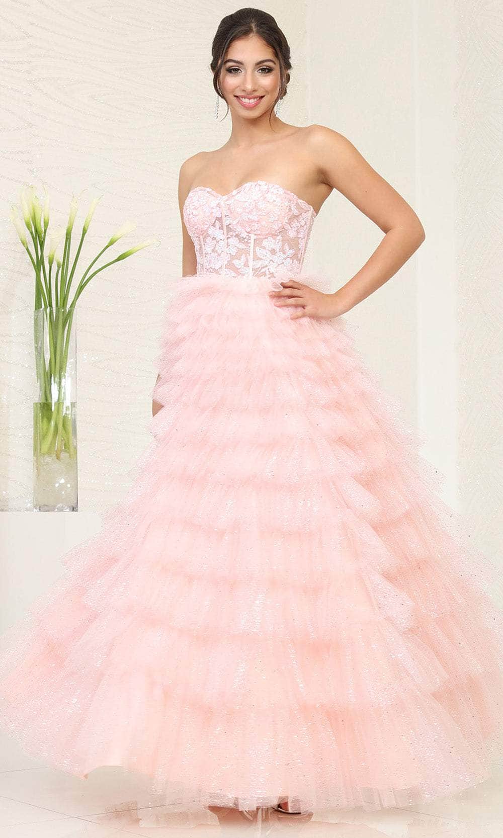 Glide into a fairytale with the May Queen RQ8124 prom dress, a masterpiece of ethereal romance. Expert tailoring sculpts a dreamlike silhouette, accentuated by a strapless design that flatters your shoulders. The sweetheart neckline leads to a sheer corset bodice, adorned with intricate details. The sheer midrise back adds a touch of modern allure. The skirt takes center stage, featuring a cascade of whimsical ruffled tiers that flow gracefully to the floor. This May Queen RQ8124 creation is the epitome of youthful elegance, transforming you into the belle of the ball and leaving a lasting impression on your grand night. Models are wearing the Baby Blue, Blush, and Lilac colors.
