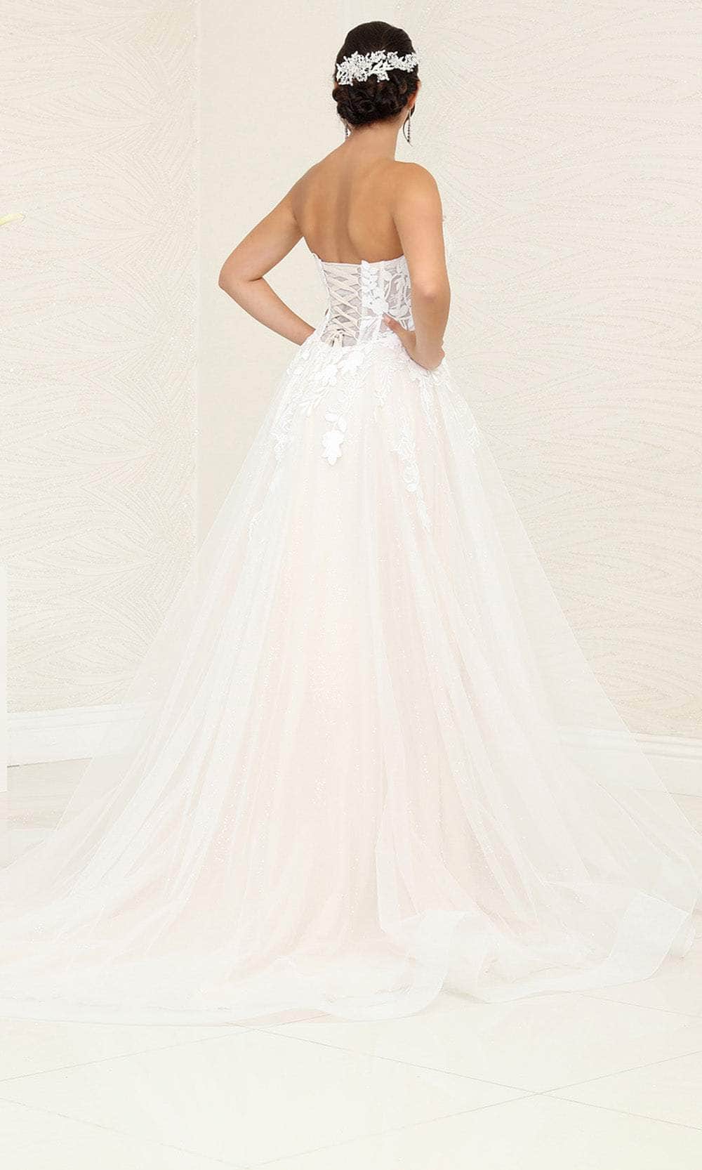 Elevate your wedding day look with the stunning May Queen RQ8131 bridal gown. The expertly tailored silhouette flatters your figure with a strapless bodice featuring strategically placed corset boning for a defined waist. The romantic sweetheart neckline dips into a plunging illusion inset for a modern touch. Delicate lace appliques adorn the bodice and cascade down the A-line skirt, adding timeless beauty. The classic corset closure ensures a perfect fit, while the court train adds a touch of regal elegance. This exquisite May Queen RQ8131 gown is the epitome of bridal perfection, making your special day unforgettable. Model is wearing the Ivory/Nude color.