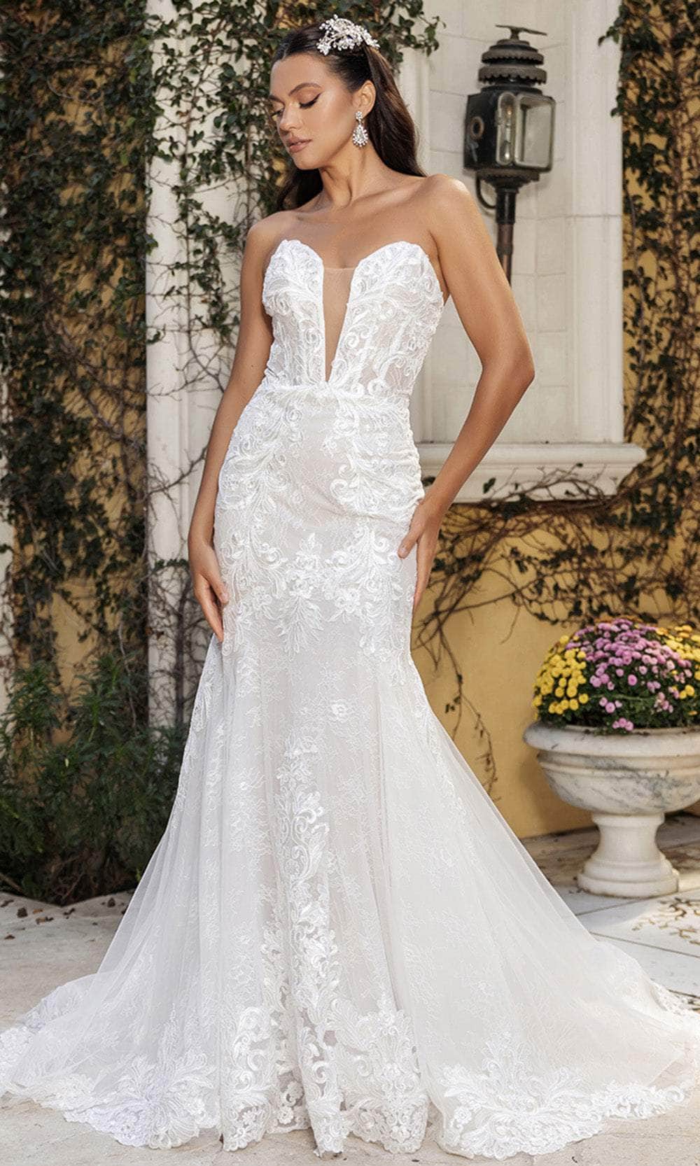 Look and feel glamorous in this sultry May Queen RQ8145 gown, a true masterpiece adorned with delicate lace applique embellishments. This stunning dress features a strapless bodice, crowned with a plunging V-neckline accented with a sheer insert, offering a captivating and sophisticated look. The floor-length skirt flows gracefully in a mermaid silhouette, creating a sleek and refined appearance, and ends with a horsehair hem for added grace. Perfect for any special occasion, this gown combines timeless elegance with modern charm, ensuring you stand out with confidence and poise. Step into this exquisite May Queen RQ8145 and let your inner radiance shine, creating unforgettable memories at your next event. Model is wearing Ivory/Nude color.