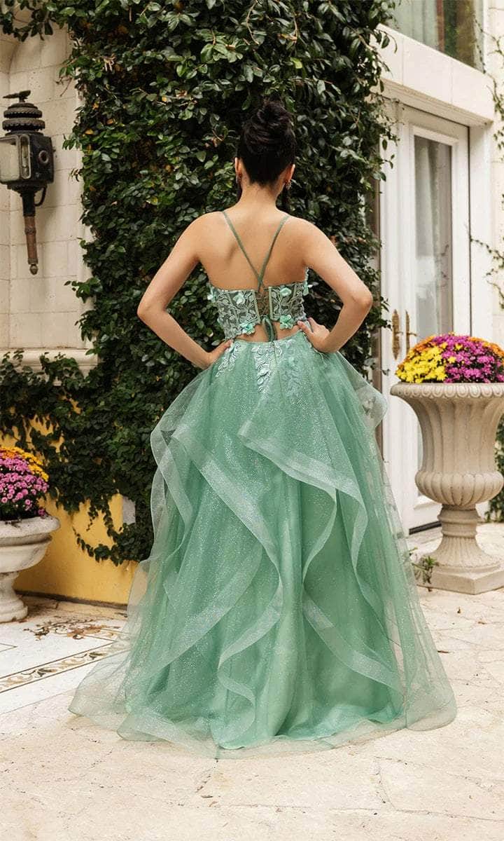 Indulge in the elegance of the May Queen RQ8158 gown, a true masterpiece for any special occasion. This stunning sleeveless corset bodice is beautifully embellished with intricate embroideries and 3D floral appliques, creating a captivating and luxurious look. Supported by delicate spaghetti straps, this gown ensures both style and comfort. The floor-length layered skirt adds a touch of grandeur with its sparkling embellishments, making you shine brilliantly. Perfect for making a statement, this ensemble exudes sophistication and grace. Embrace the timeless beauty of this exquisite May Queen RQ8158 and make unforgettable memories at your next event. Models are wearing Sage and Teal Blue colors.