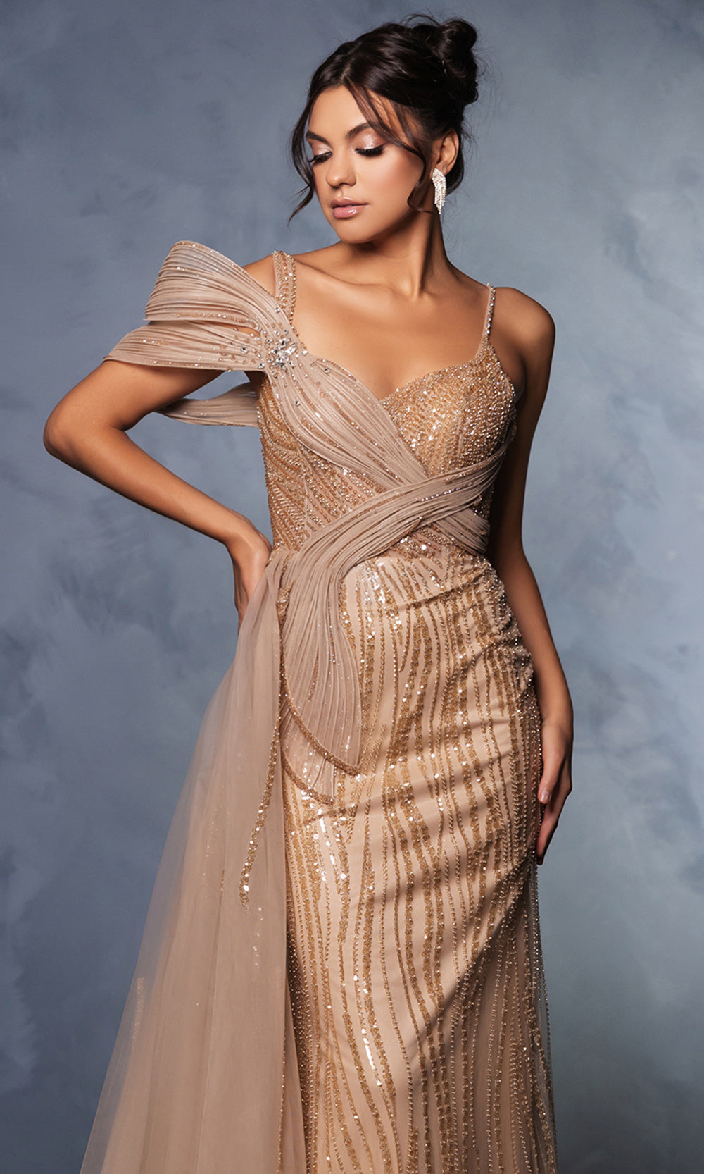 | Details: | Thin Straps, Asymmetrical one-shoulder, Sleeveless, Side Drape, Asymmetric Detail, Beaded, Sequin, Open Back |