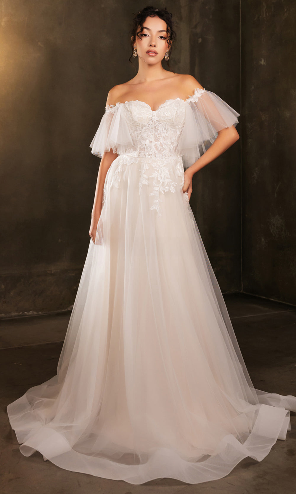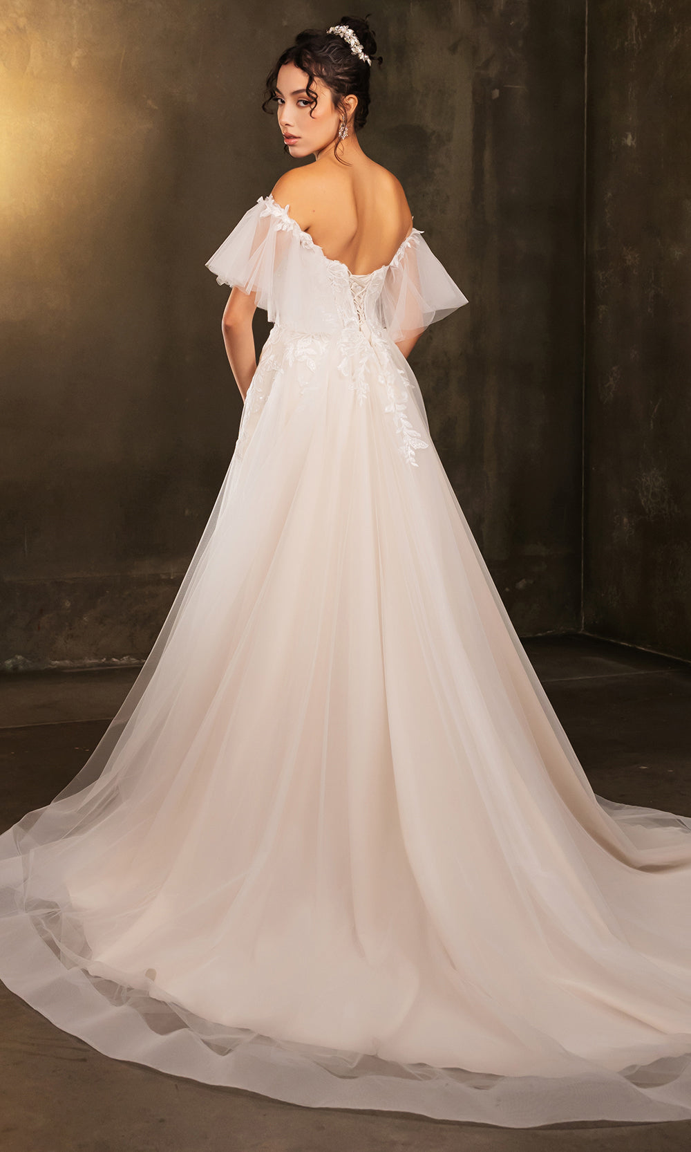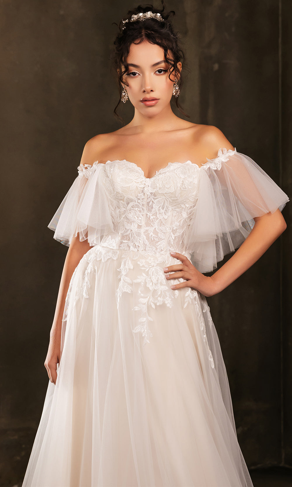 | Details: | Off-Shoulder Flutter Sleeves, Floral Lace Appliques, Sequin, Sheer Bodice, Sweep Train |