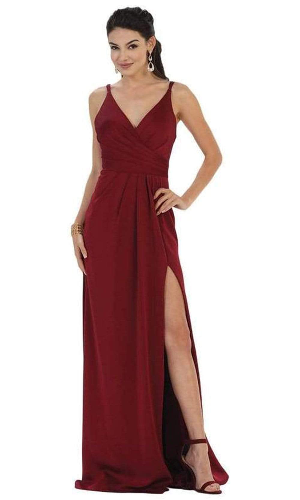 Flaunting tapering pleats along the sleeveless bodice, this stunner showcases a v-neckline supported with slender straps. Dual straps split at the back to weld the alluring ruched mid-open back. This stylish long dress is made of chiffon material with a high front slit. Model is wearing Burgundy color.