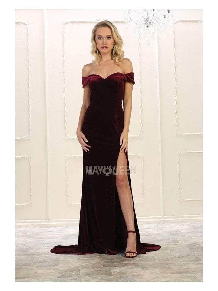 Sculpted in rich velvet, this dress flourishes an off shoulder neckline with a foldover sweetheart design. Crafted with a mid-open back, the sheath skirt opens with a high slit as it falls into a train. Model is wearing the Burgundy color.