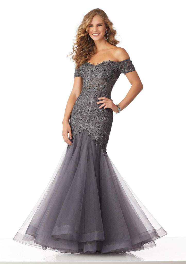 Show off your sophisticated sense of style in this stunning MGNY By Mori Lee 71825 evening dress. The fitted bodice is designed in beaded lace appliques framed with an off-shoulder neckline and short sleeves, complemented with a mid-open back. From the inverted basque waist reveals a net trumpet skirt which finishes to a full length horsehair hemline. This MGNY By Mori Lee creation is simply breathtaking!