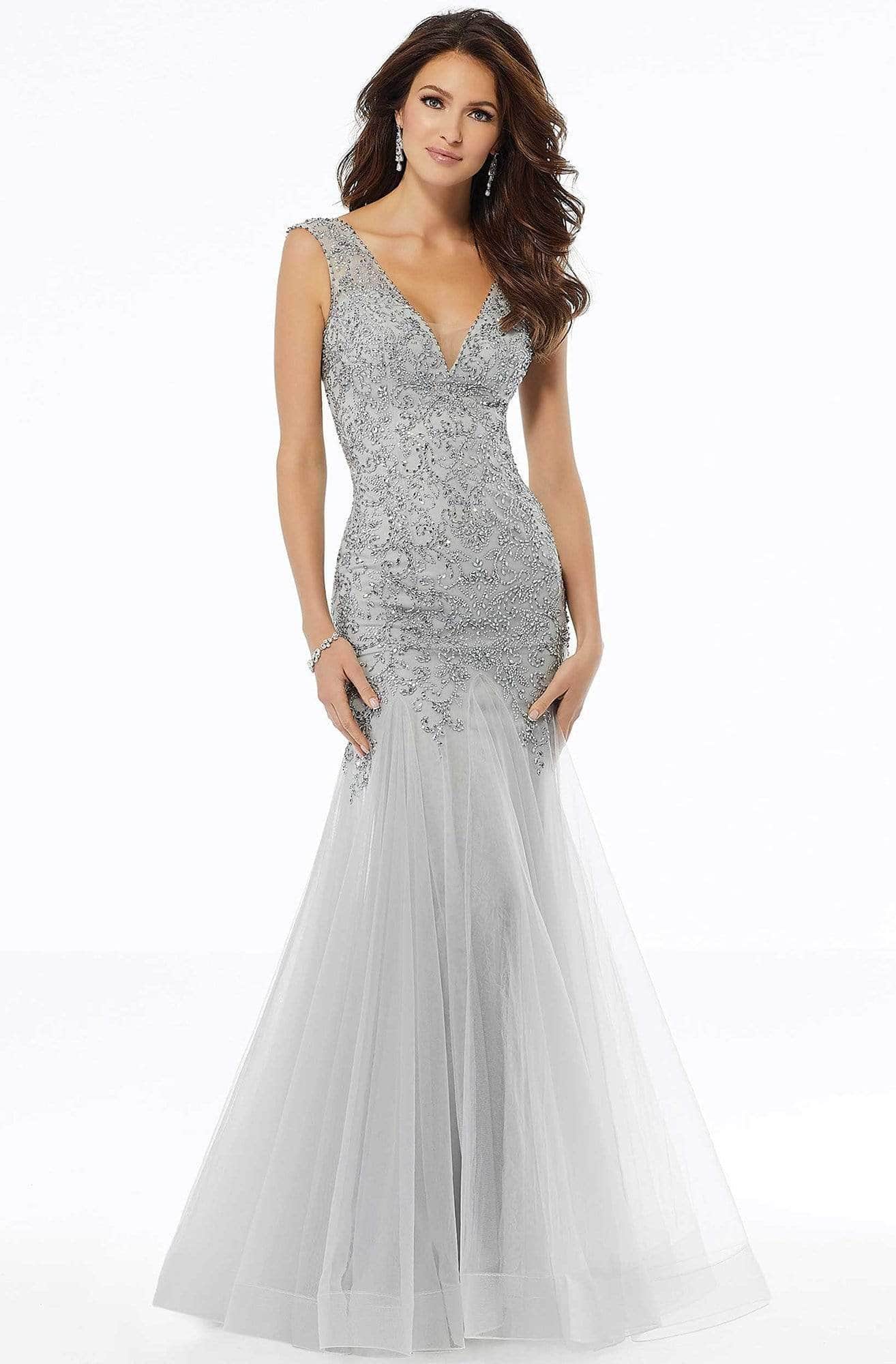 Capture the glamour in this stunning MGNY By Mori Lee 72103 masterpiece. This dress is designed in allover beaded soft net over lace as the fitted bodice showcases a plunging V neckline with sheer mesh detail. The skirt parades a trumpet silhouette which finishes with horsehair hemline. Matching stole included. A sure winner from MGNY By Mori Lee creation!