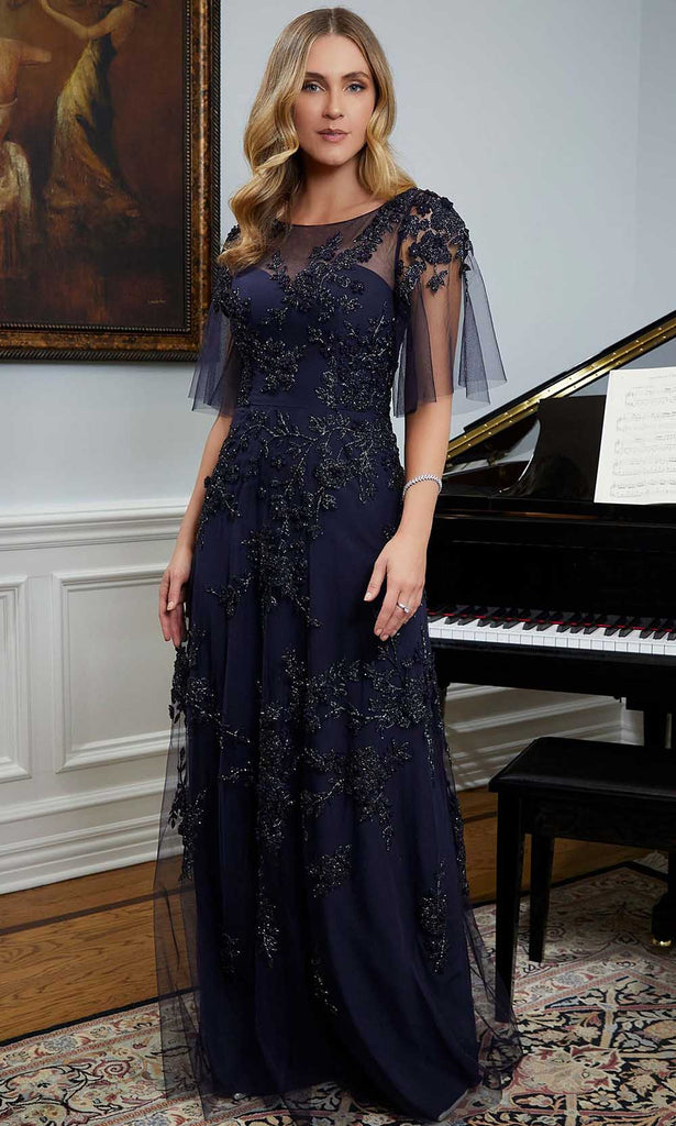 Display your feminine charm with this stunning MGNY by Mori Lee 72837 masterpiece. Adorned with beaded embroidery and 3D floral applique, this gown will undeniably turn heads at your next event. The top brandishes an illusion bateau neckline with sweetheart lining and elbow-length flutter sleeves. The partial illusion full back has a keyhole detail while being secured by a zipper closure. Completed in an A-line skirt that gracefully glides to the floor-length hem and sweeping train. This MGNY by Mori Lee 72837 gown gives you an intricate look that will last a lifetime. Models are wearing the Navy, and Rose Gold colors.