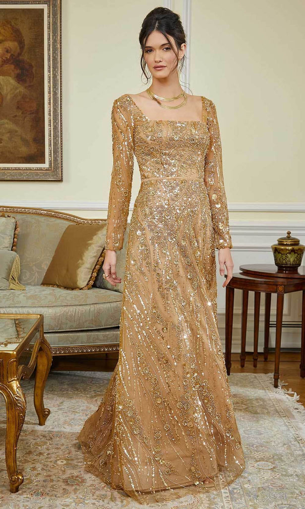 Make a grand entrance to your next event wearing this MGNY by Mori Lee 72843 creation. Flattering for all body types, this show-stopping ensemble is beautifully festooned with all-over glimmering beadwork. The top offers a matching square neckline and midrise square back, accompanied by sheer long sleeves for added glamour. A thin band gently hugs your waist for a slender look. The A-line skirt gracefully flows down to a floor length hemline. Exude a timeless appeal in this stylishly ornate MGNY by Mori Lee 72843 gown. Models are wearing the Gold, and Gunmetal colors.