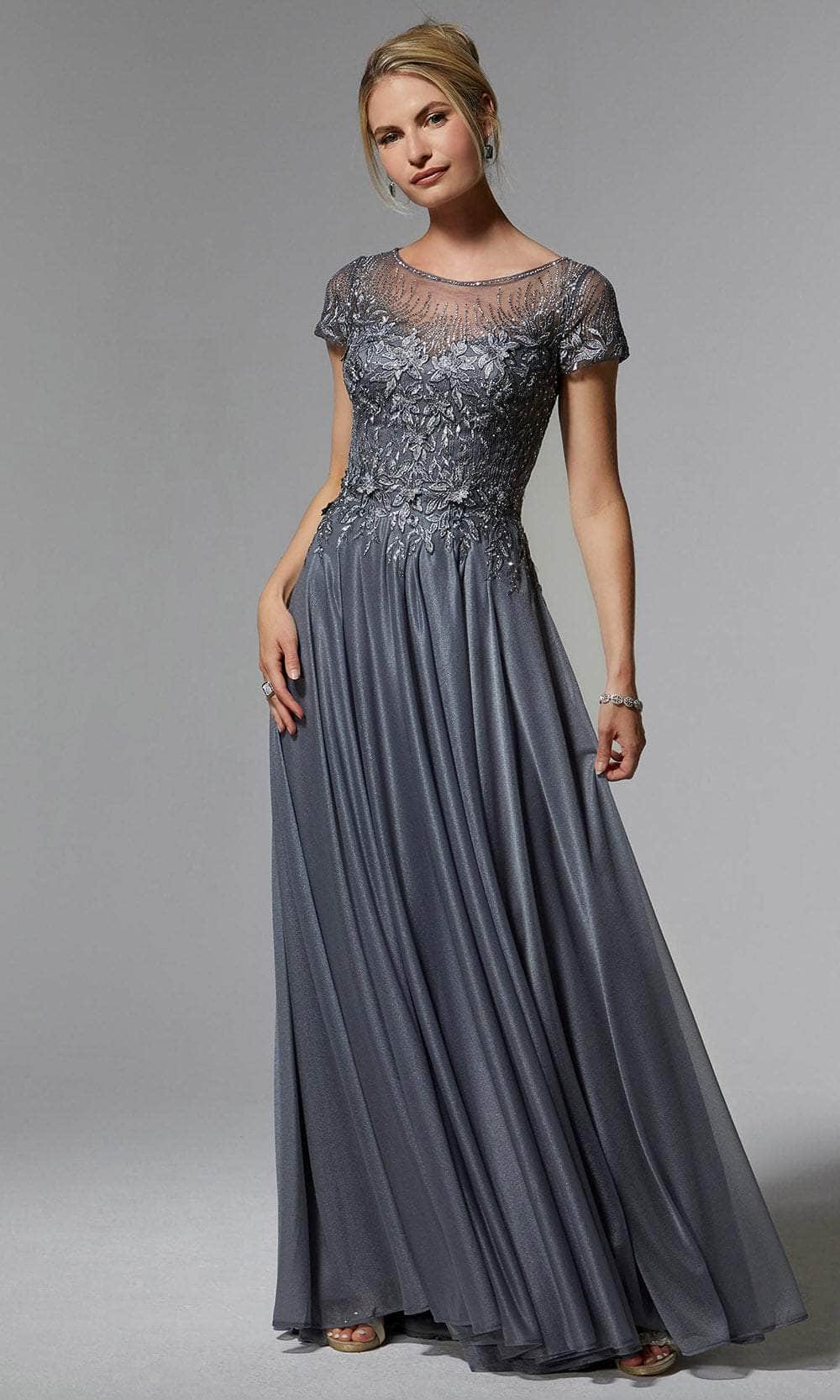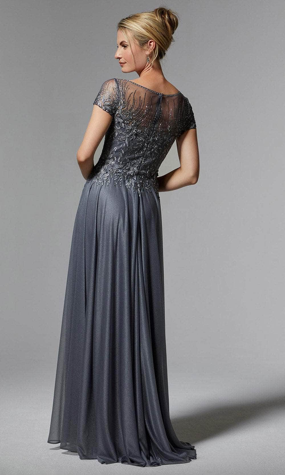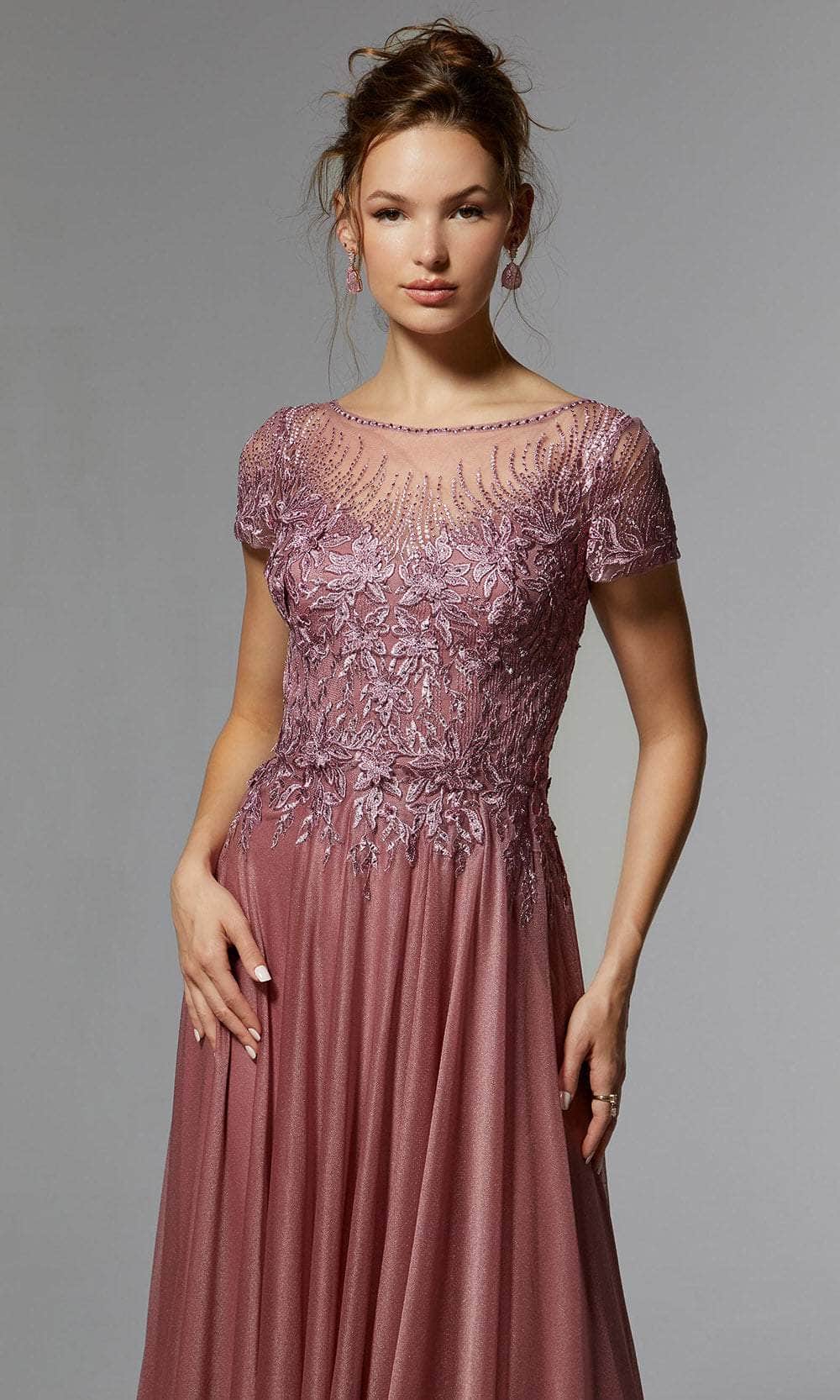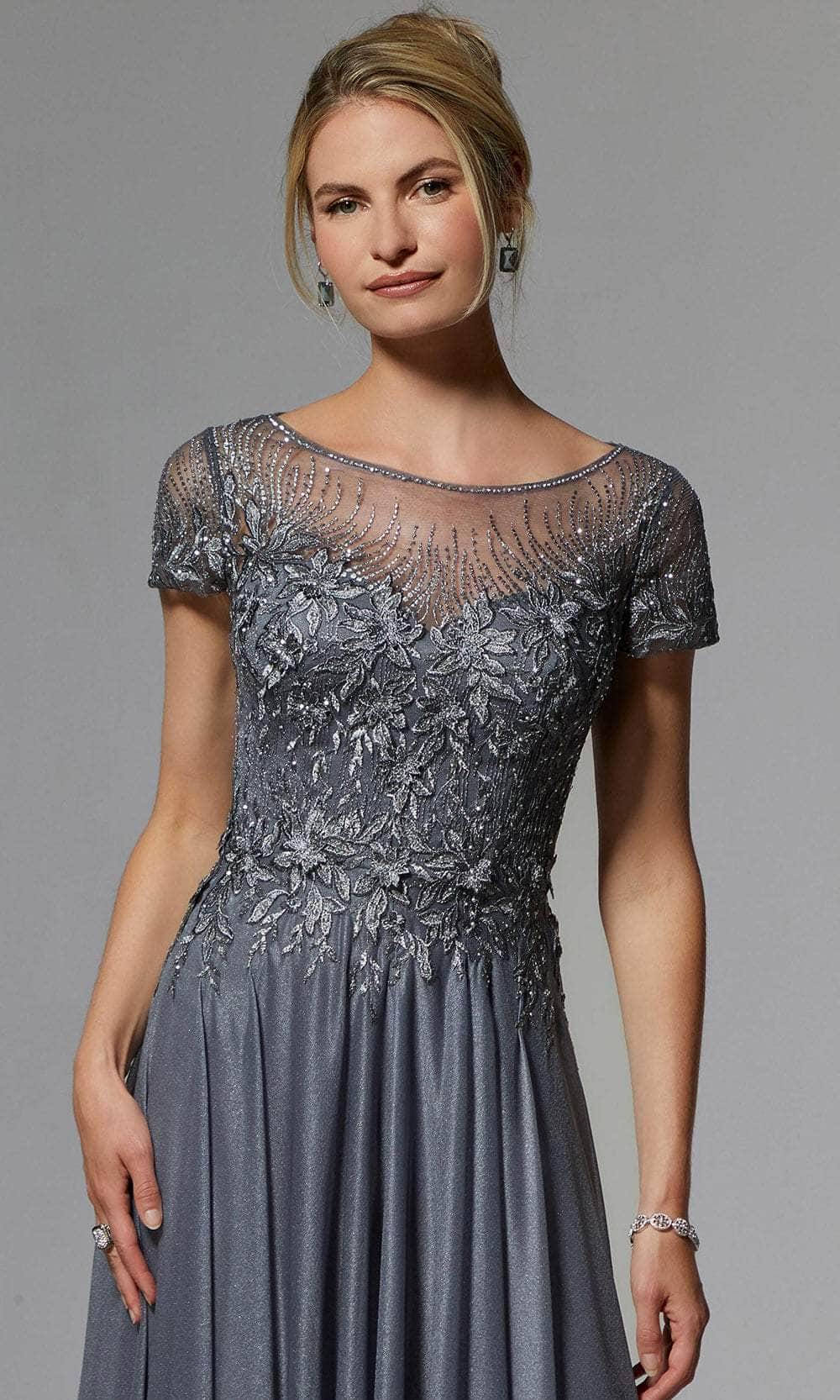 The MGNY by Mori Lee 72905 evening gown is a vision of elegance and sophistication. Its stunning illusion bodice features a graceful bateau neckline that exudes timeless charm. The gown is adorned with delicate sheer short sleeves and breathtaking crystal beaded botanical embroidery, which not only graces the bodice but also extends to the sheer back. The A-line silhouette of this gown billows around you in iridescent metallic stretch mesh, creating a mesmerizing play of light with your every movement. As the finishing touch, a graceful sweep train trails behind. Unveil the allure of sophistication in this timeless MGNY by Mori Lee 72905 gown, where elegance meets grace. Models are wearing the Graphite and Rose colors.