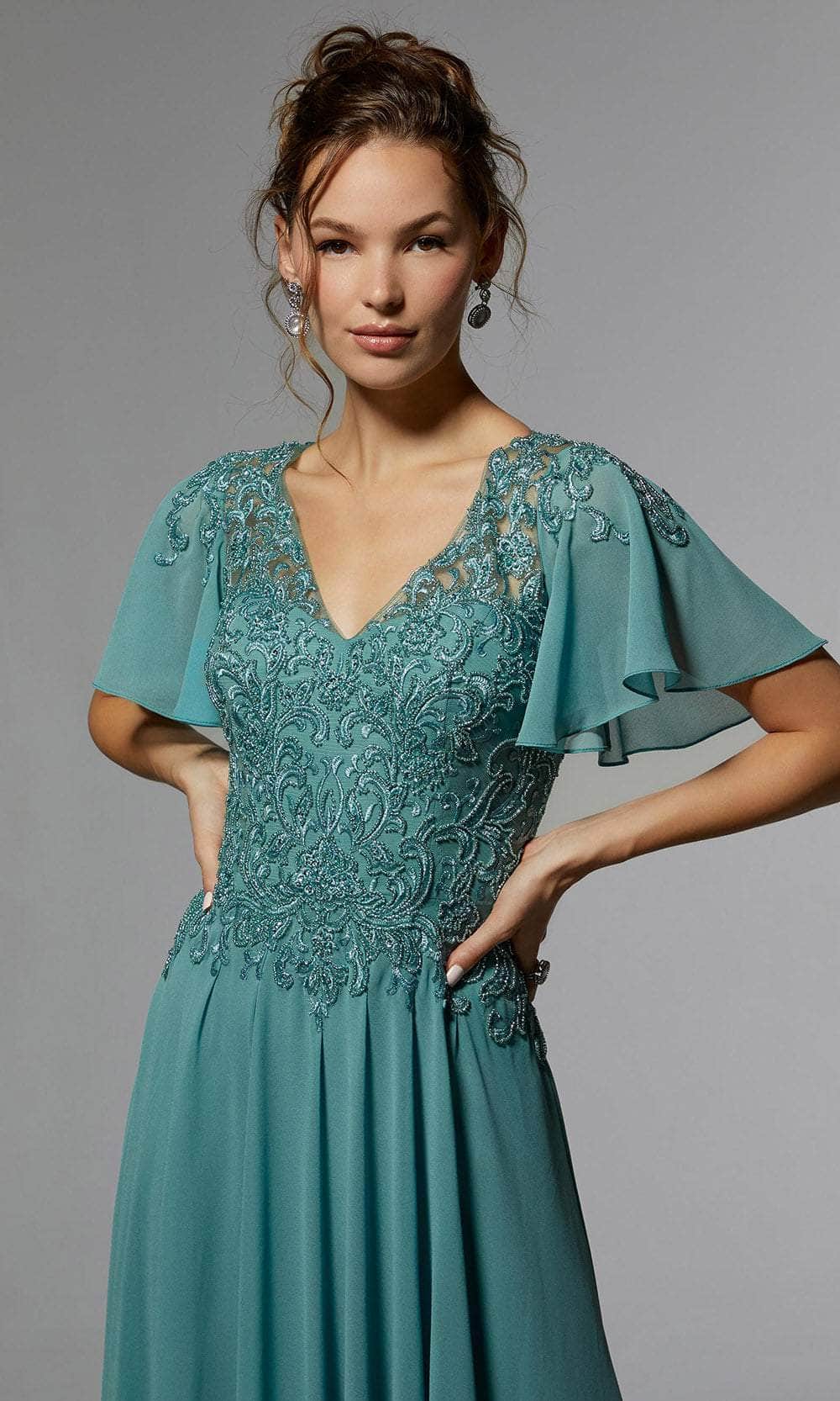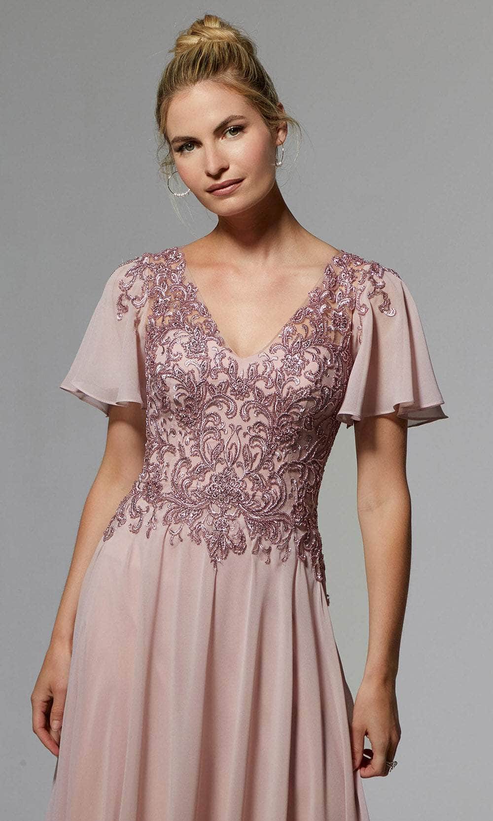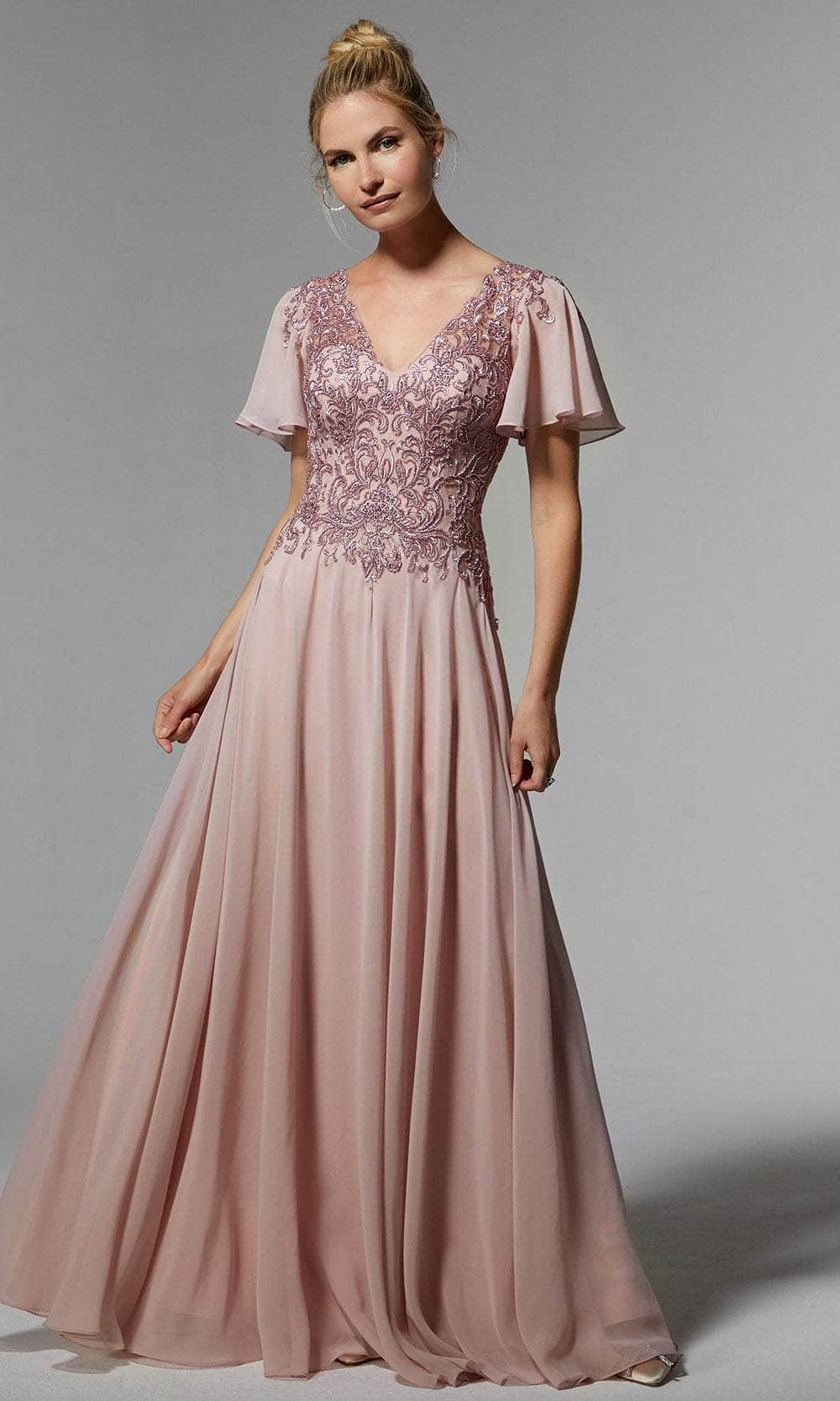 Elevate your evening in the MGNY by Mori Lee 72908 gown, a testament to romance and grace. The classic v-neck bodice, adorned with swirling beaded metallic embroidery, introduces a touch of opulence that enhances the overall charm of the ensemble. Flirty flutter sleeves add a playful and whimsical element, creating a captivating silhouette. With a sheer back, the gown reveals a hint of allure, while the chiffon skirt billows off the body for an effortlessly chic look. The addition of a train completes the ensemble, leaving a lasting impression of sophistication and beauty. Command the room in this regal MGNY by Mori Lee 72908 masterpiece, a manifestation of elegance and unparalleled grace. Models are wearing the Blush and Jade colors.