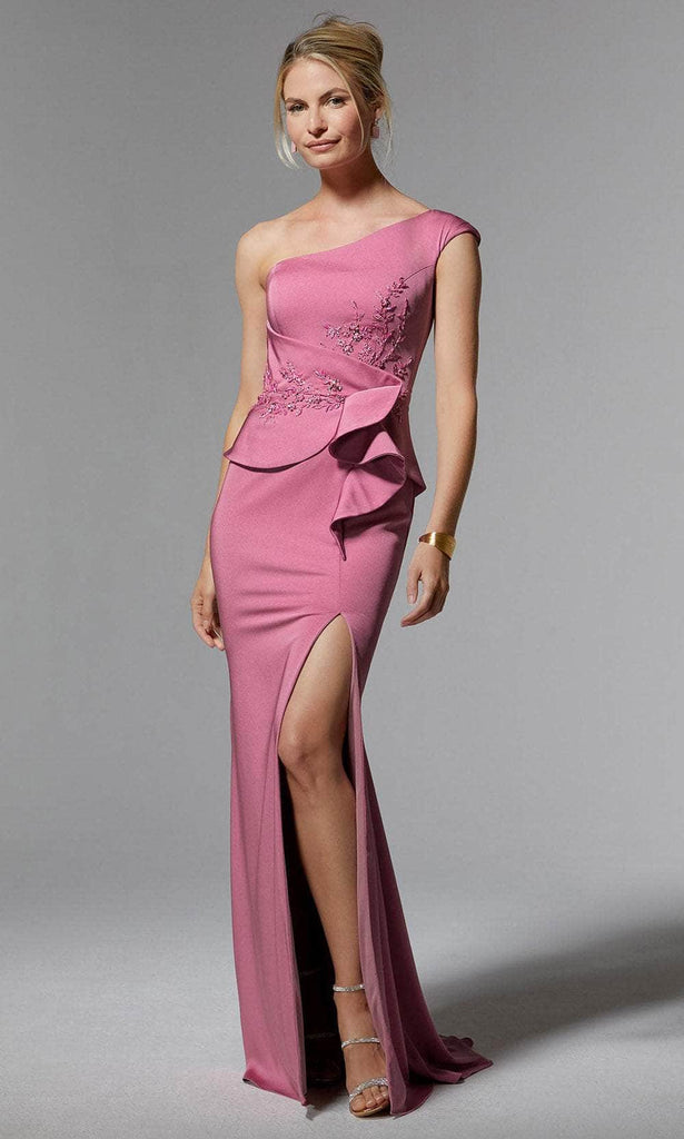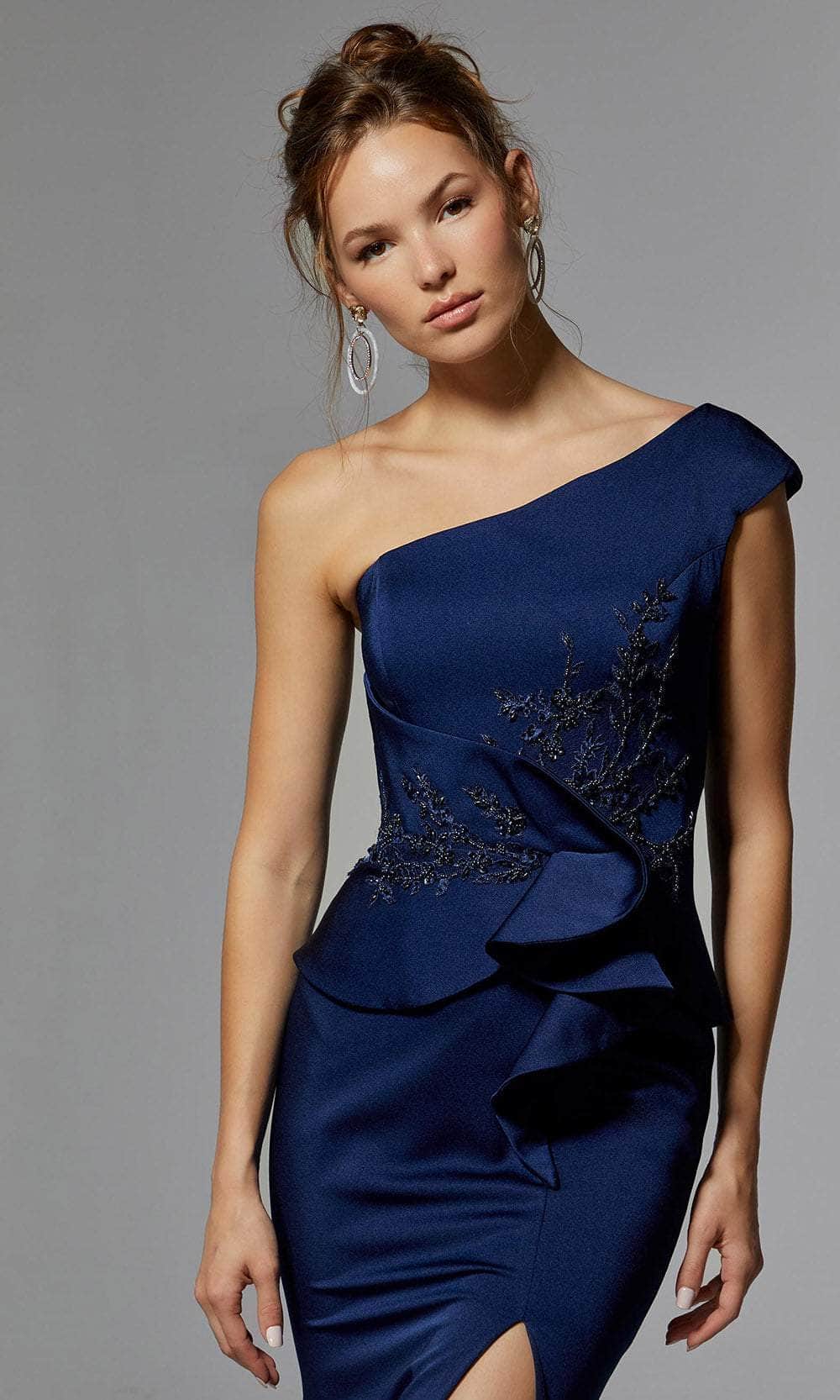 Elegance meets modernity in the MGNY by Mori Lee 72917 gown. Crafted from chic stretch crepe, this evening gown features a one-shoulder neckline with understated cap sleeves. The bodice is unique, boasting a sculptural peplum detail adorned with beautiful beaded embroidery. The fitted skirt accentuates your curves, and a front slit adds a touch of allure. To complete the ensemble, a matching stole is included, adding a refined layer to this sophisticated gown. With its contemporary design and timeless charm, the MGNY by Mori Lee 72917 gown is the perfect choice for those seeking a distinctive and elegant look for any special occasion. Models are wearing the Peony and Navy colors.