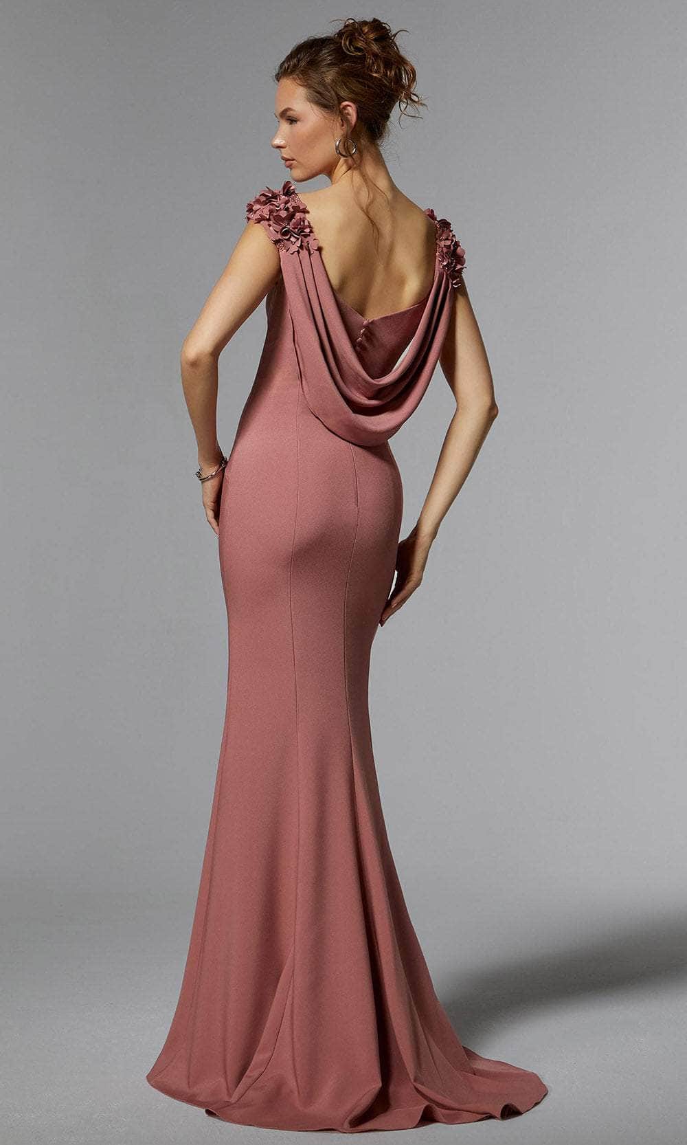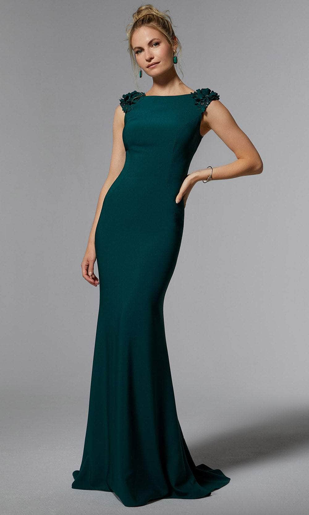 Radiating sophistication, the MGNY by Mori Lee 72920 evening gown boasts a comfortable stretch crepe fabric that elegantly drapes the body, while contoured seams define the fitted sheath silhouette. The high bateau neckline exudes an air of modesty and refinement, complemented by crystal beaded, three-dimensional flowers adorning the cap sleeves. A striking draped cowl back adds a touch of allure to the gowns design. The ensemble is gracefully concluded with a sheath skirt featuring a trailing train, introducing a hint of drama to this elegantly crafted gown. With its understated charm and captivating details, the MGNY by Mori Lee 72920 gown is the ideal choice for those in search of a sophisticated and memorable look for any formal occasion. Models are wearing the Emerald and Rosewood colors.
