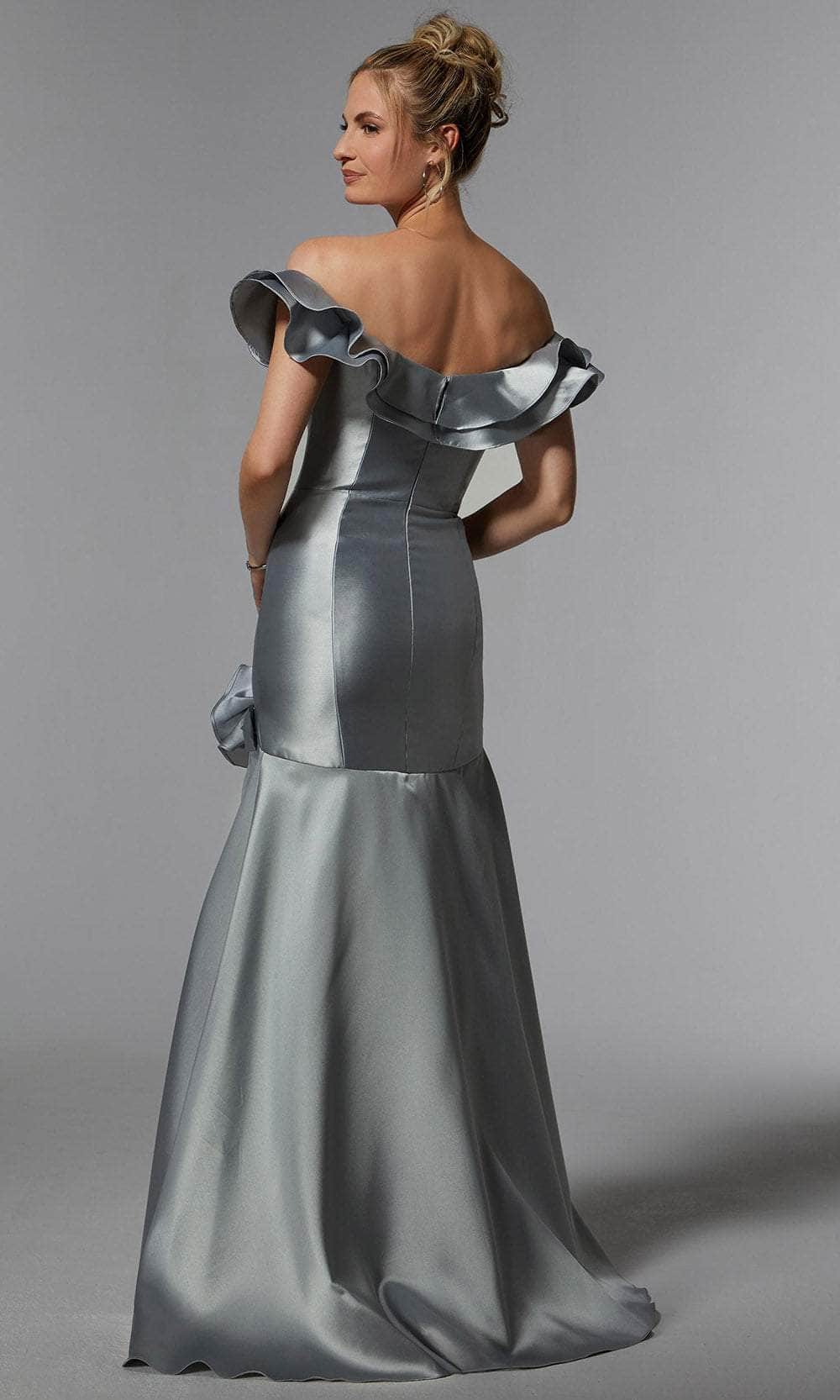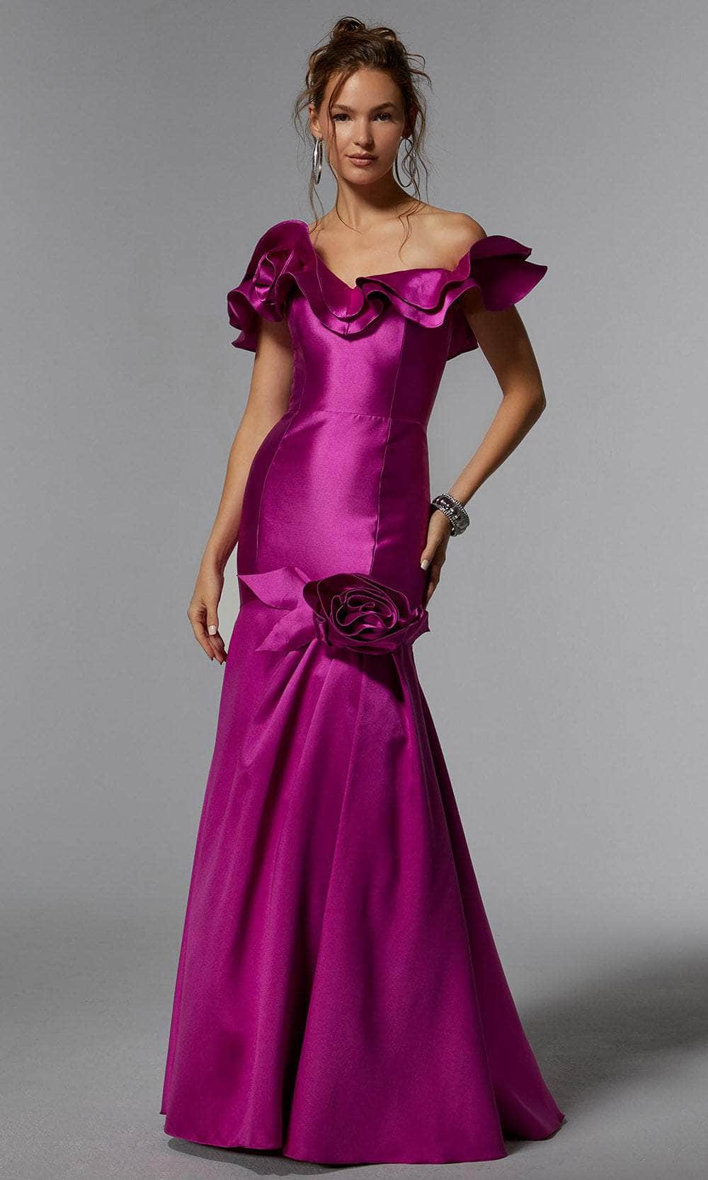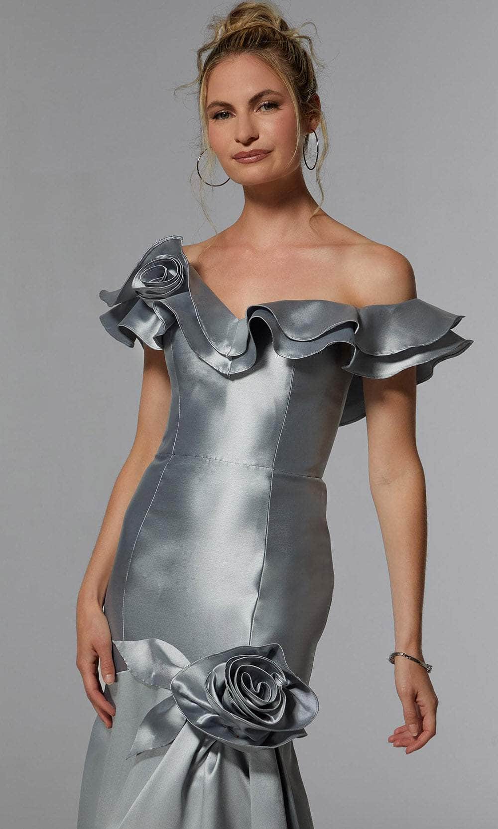 The MGNY by Mori Lee 72928 gown exudes understated elegance, fashioned from luminous Larissa satin. Its chic design is highlighted by a flounced off-the-shoulder neckline, adding a touch of refinement to the ensemble. With an off-shoulder neckline and a mid-rise back, the mermaid skirt is adorned with swirling floral ruffles, gracefully accentuating the shoulders and decorating the drop waist. A sweeping train completes the look with a sense of grace and regality. This MGNY by Mori Lee 72928 creation is a testament to timeless charm and sophistication, making it the perfect choice for those seeking a classically refined look for their special occasion. Models are wearing the Berry and Silver colors.