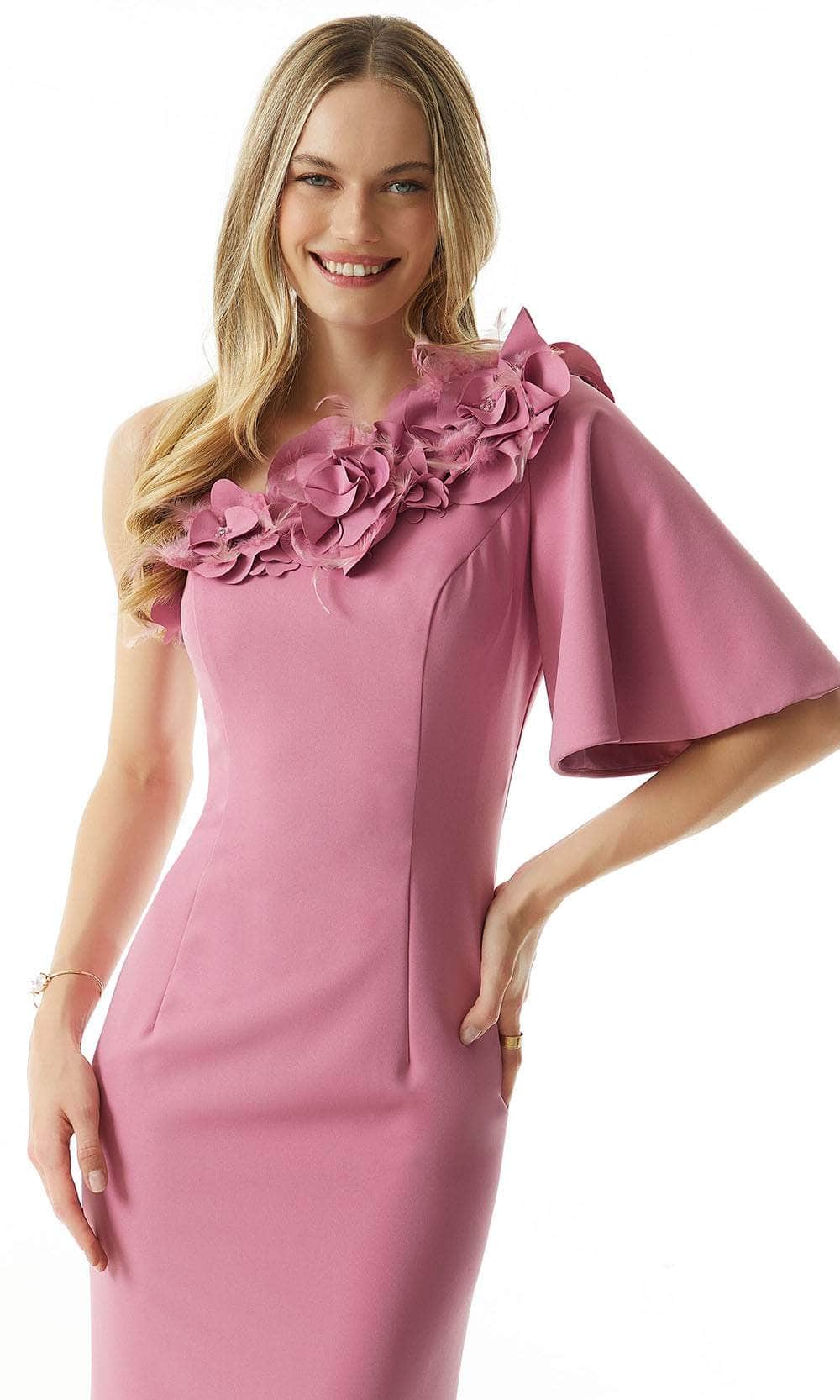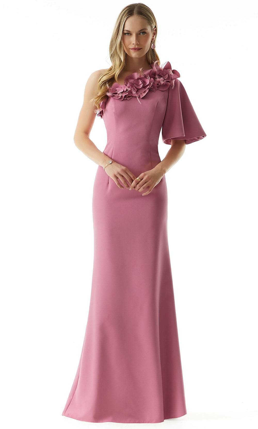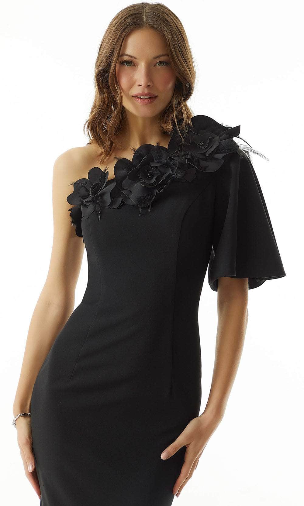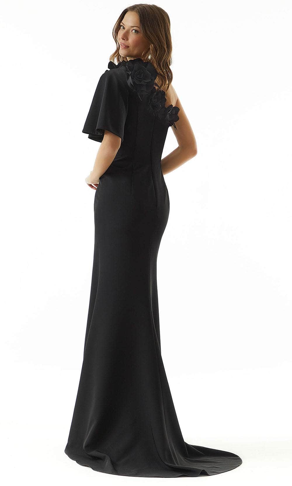 Cultivate an aura of captivating intrigue with the MGNY by Mori Lee 73009 creation. This chic evening gown breaks the mold of traditional design with its captivating asymmetrical neckline. Three-dimensional flowers, meticulously crafted and accented with shimmering crystal beading, cascade across the bodice, adding a touch of captivating texture and whimsical charm. A single, elegant short sleeve adds a touch of modern asymmetry, while the fitted silhouette flatters the figure and exudes timeless sophistication. Delicate feathers add a touch of ethereal lightness, completing this unforgettable ensemble. The MGNY by Mori Lee 73009 gown is a masterpiece designed to redefine red carpet glamour. Models are wearing the Black and Peony colors.