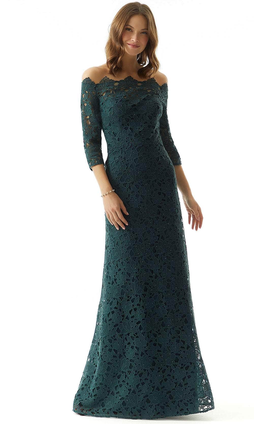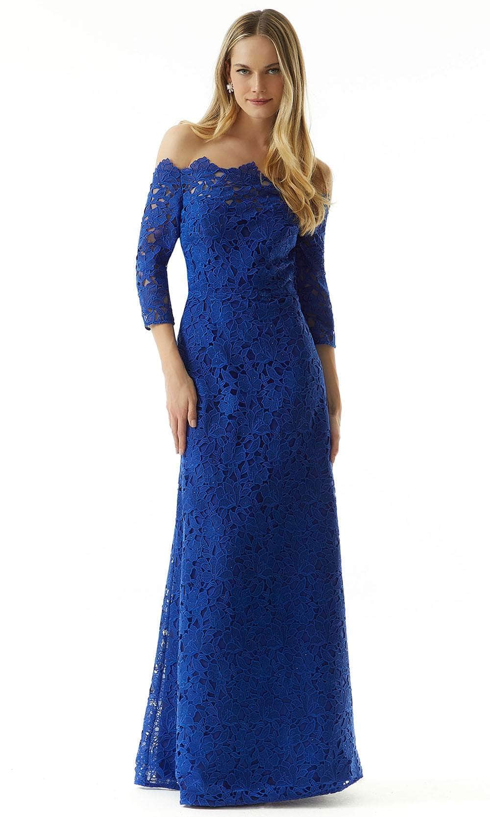 Evoke timeless elegance with the MGNY by Mori Lee 73015 creation. This captivating gown is a testament to the enduring beauty of Venice lace. Intricate beadwork adorns the luxurious fabric, creating a captivating display of light and texture that shimmers with every step. The off-the-shoulder neckline, framed by a delicate scalloped edge, adds a touch of romantic allure, while the sheer three-quarter length sleeves offer a touch of modesty. The silhouette flatters the figure, its classic design ensuring a timeless appeal. The MGNY by Mori Lee 73015 gown transcends the limitations while ensuring you radiate confidence and leave a lasting impression wherever the night takes you. Models are wearing the Hunter, and Royal colors.
