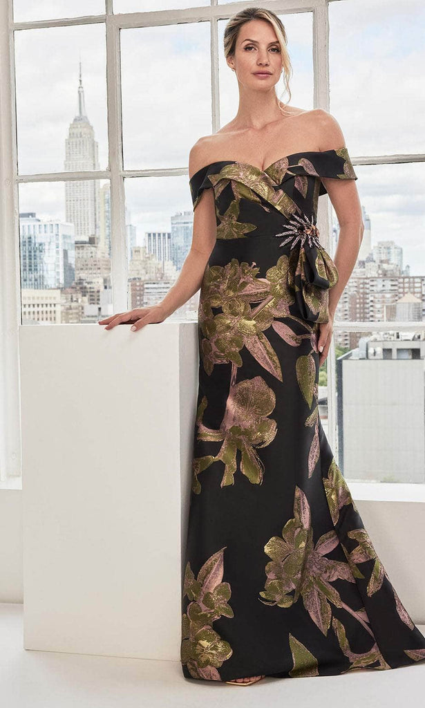 Elevate your elegance with the MGNY by Mori Lee 73115 dress, designed to exude modern sophistication. This stunning evening gown features expert tailoring on luxurious lining and an abstract floral metallic brocade for a bold, statement-making look. The fitted design boasts a cuffed off-the-shoulder neckline atop a surplice bodice, adorned with a gracefully draped bow and a sparkling brooch. A flattering mermaid skirt flows seamlessly into a sweep train, adding a touch of drama to the ensemble. Perfect for formal occasions, this gown ensures a lasting impression. Shine with poise and beauty in the MGNY by Mori Lee 73115 gown. Models are wearing the Champagne and Black Multi colors.